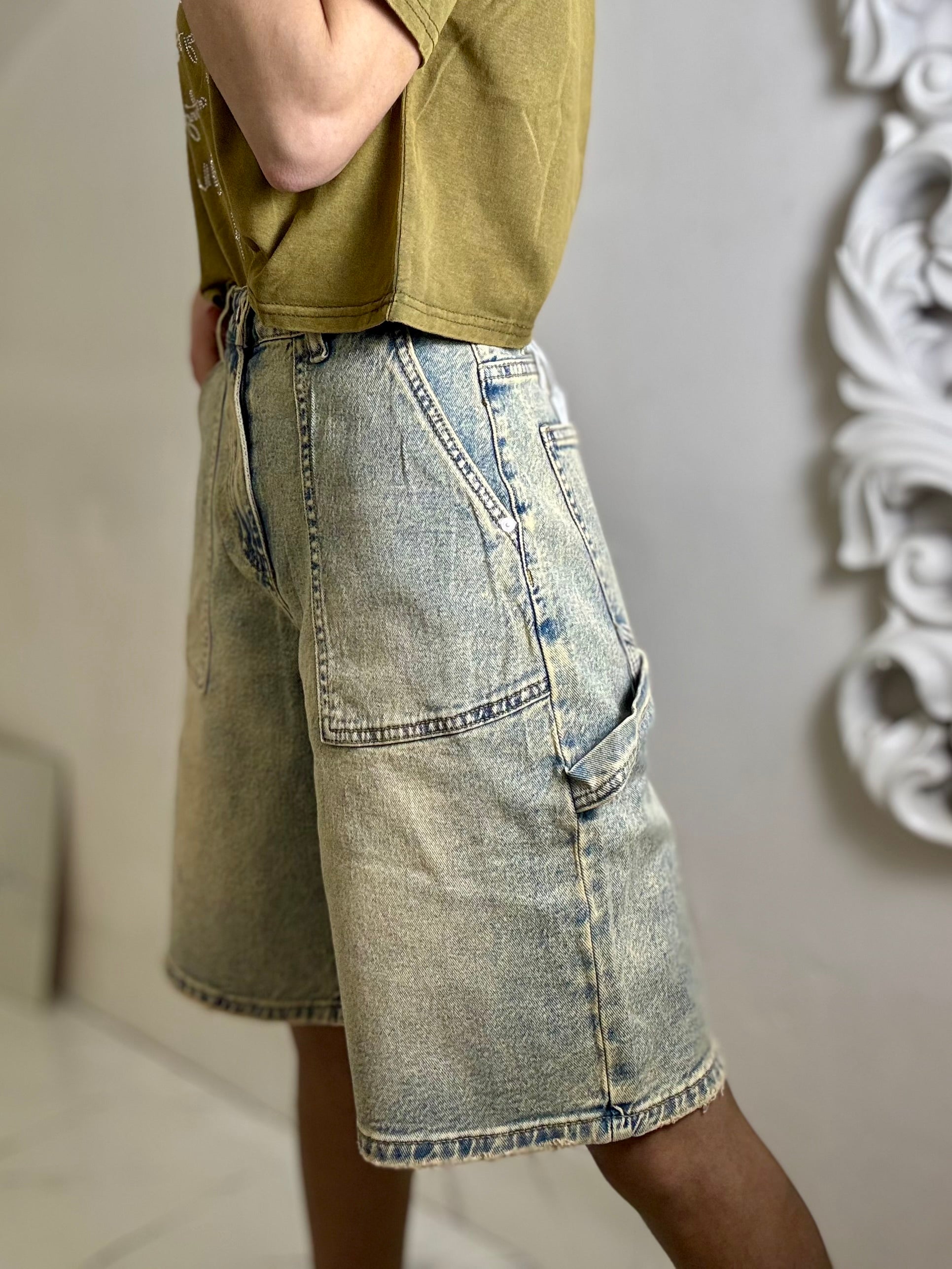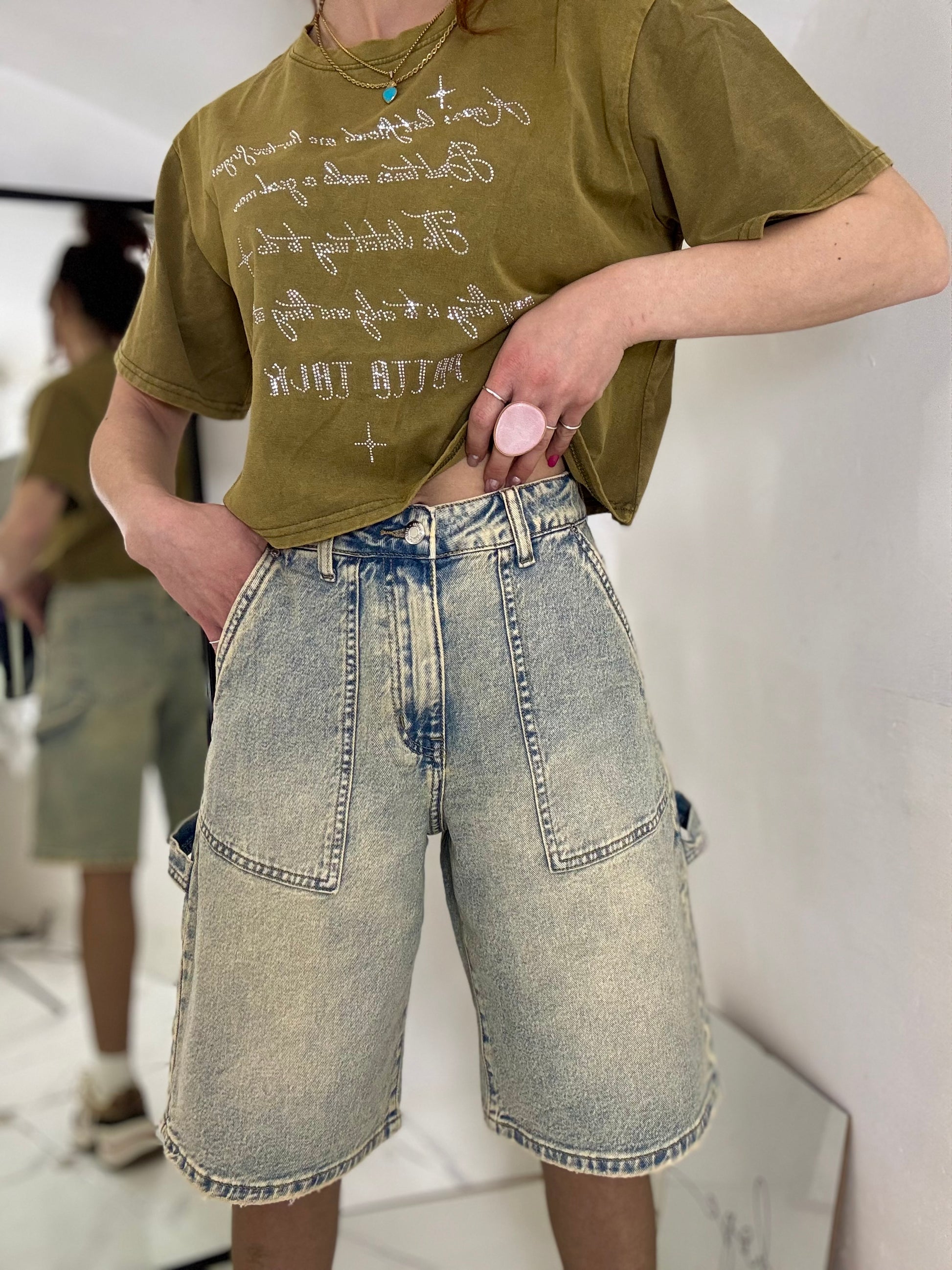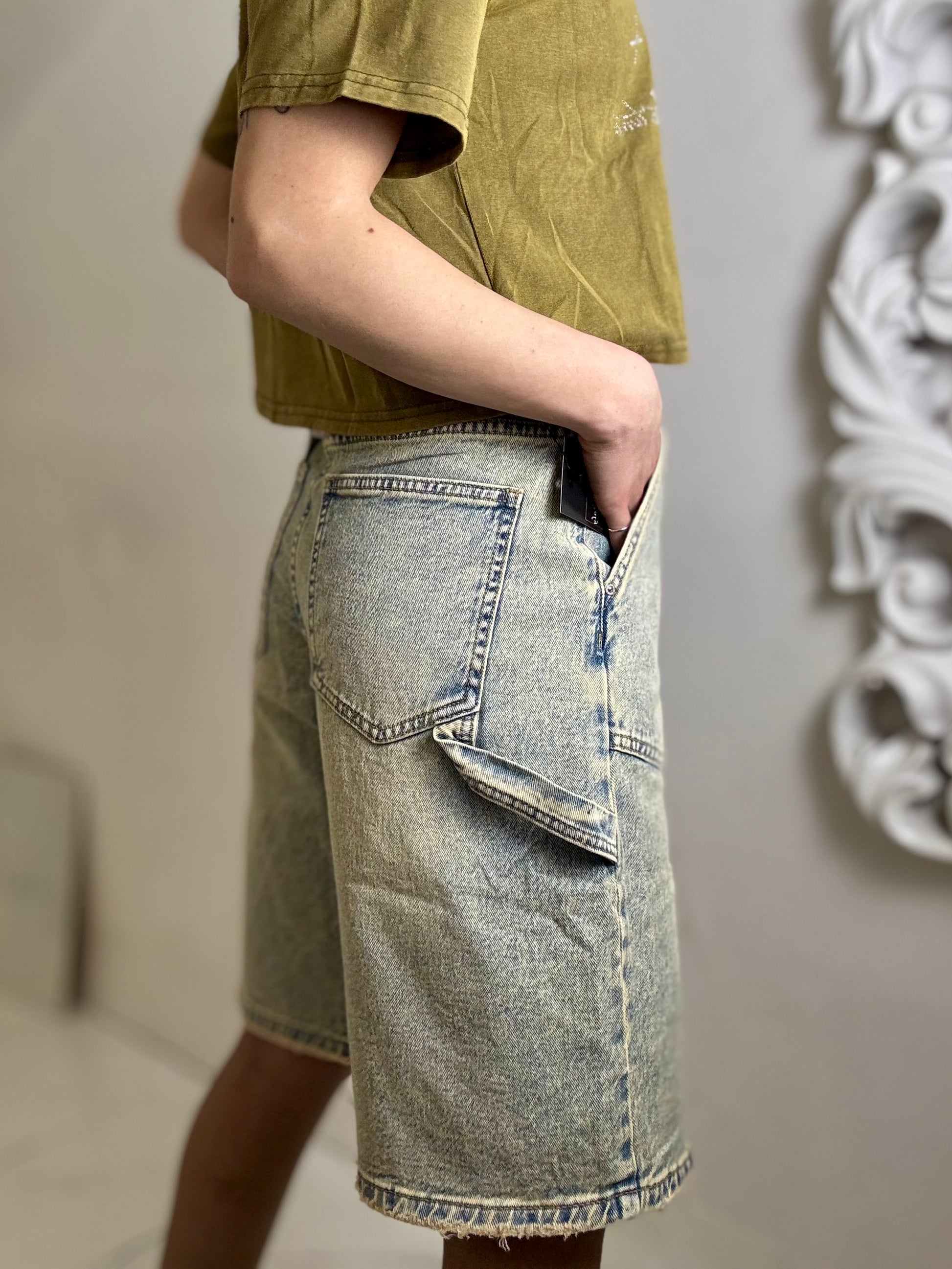 Bermuda slavato vita alta strutturato con tasche tessuto semi elastici