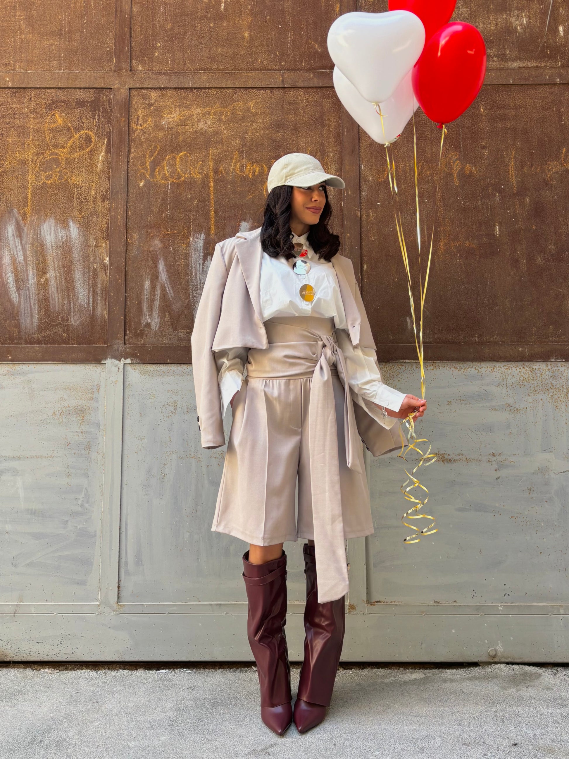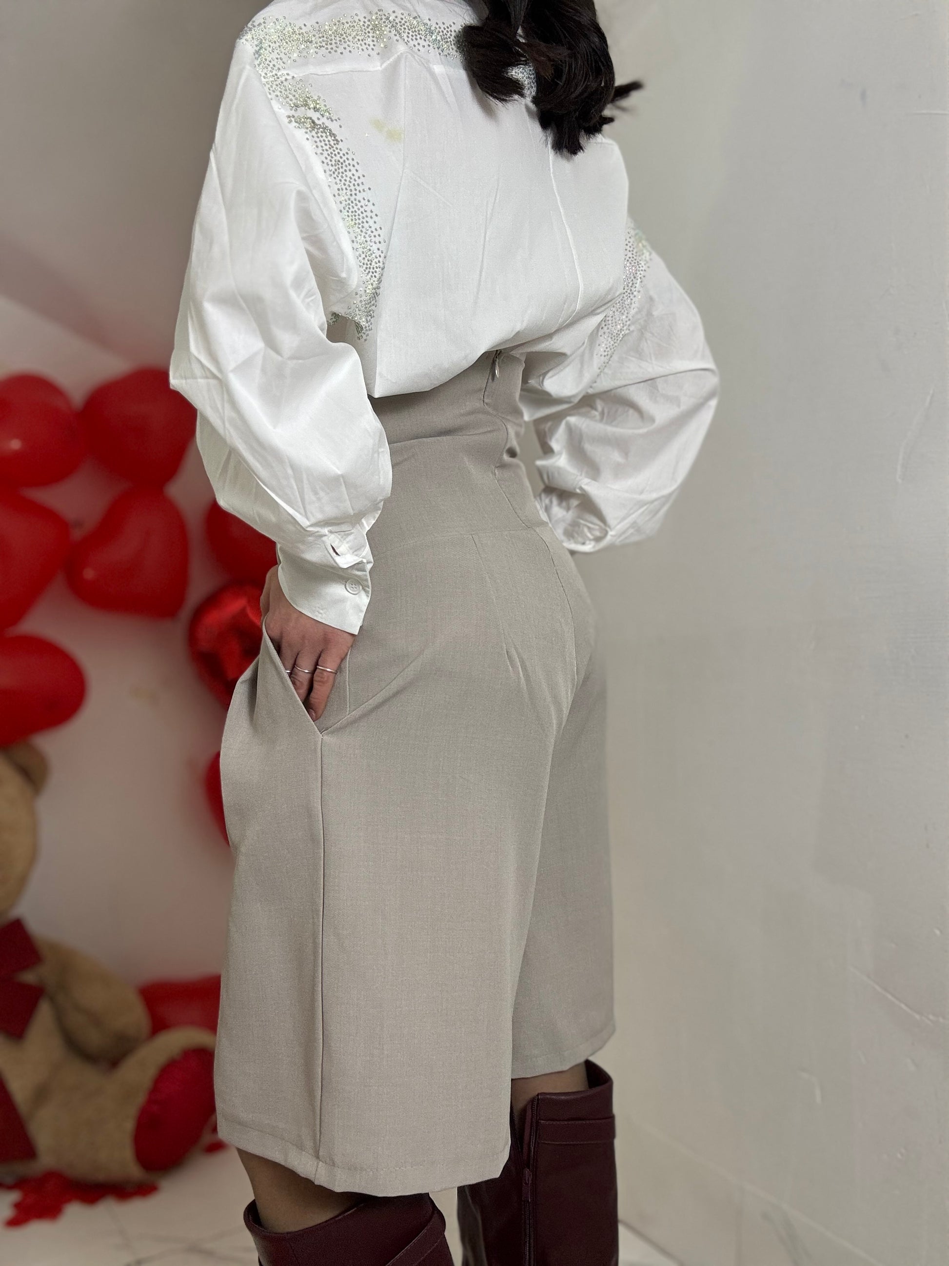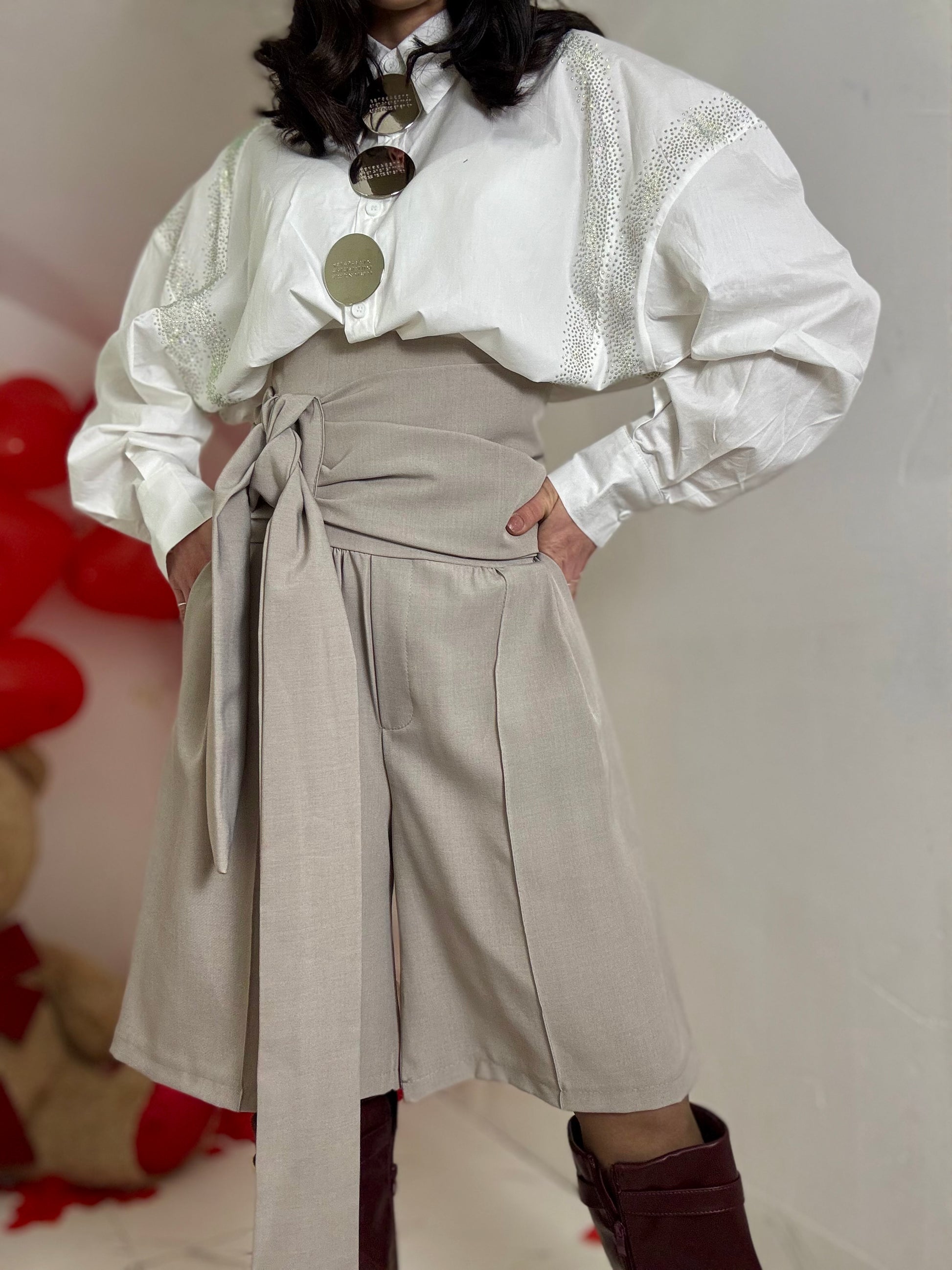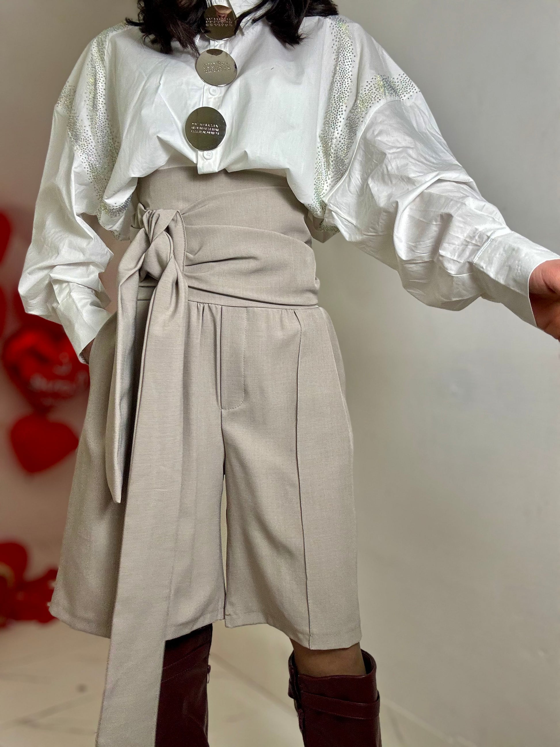 Bermuda vita altissima in tessuto, Dettaglio chiusura col fiocco vestibilità giustissima