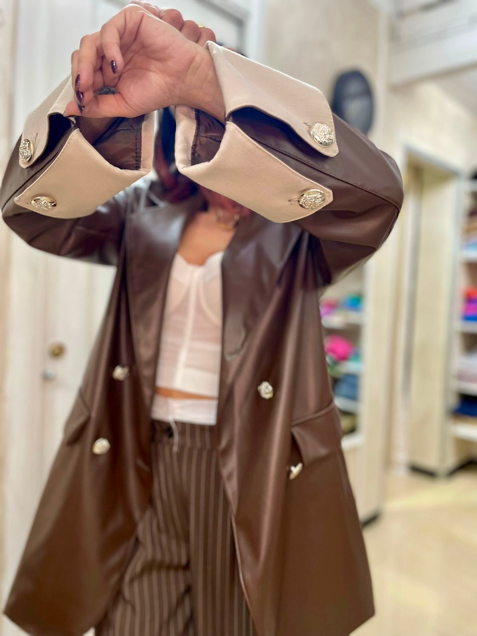 Blazer oversize in ecopelle con maxi polsini colori a contrasto bottoni frontali taglia unica e veste fino ad una 46