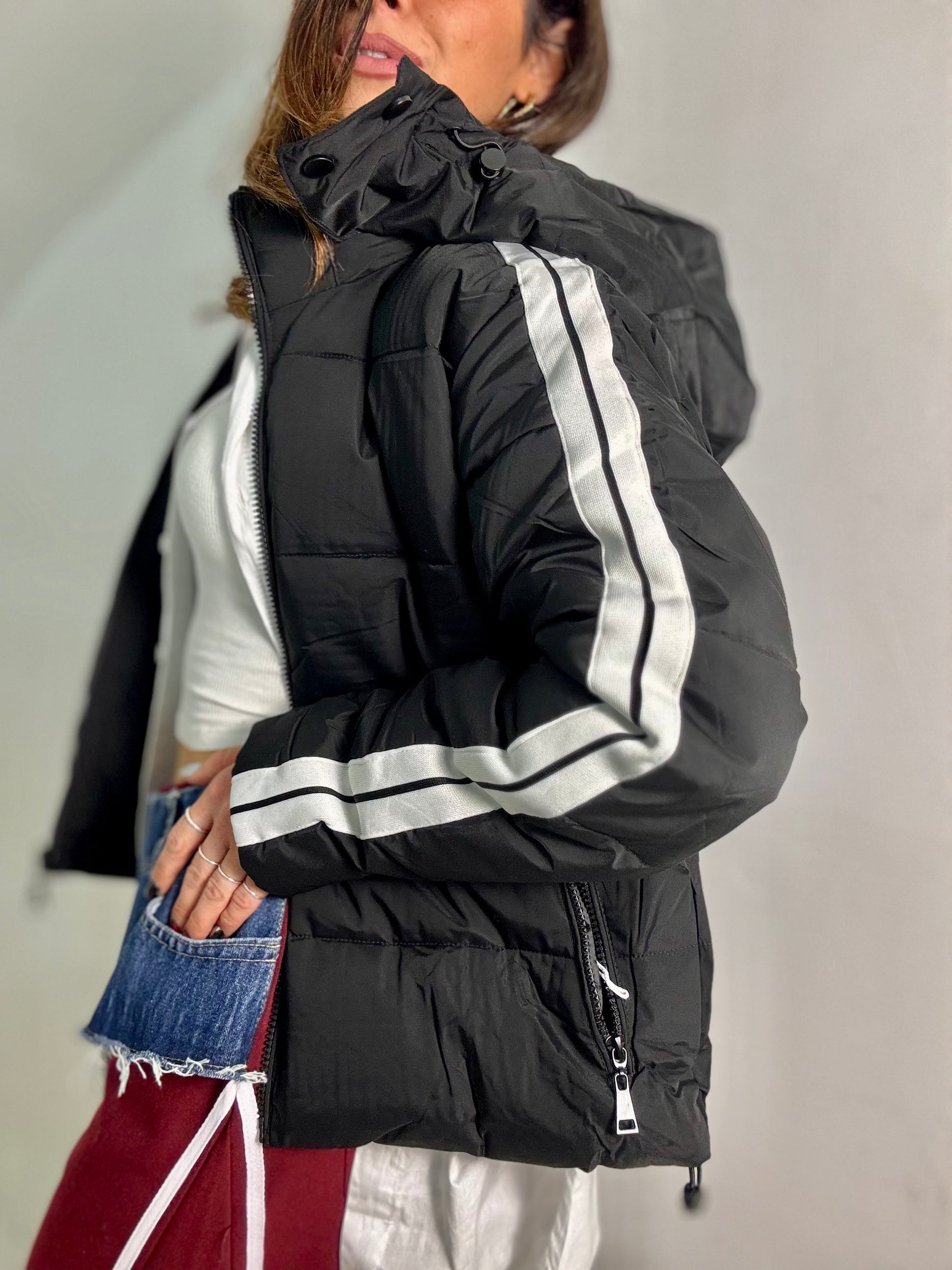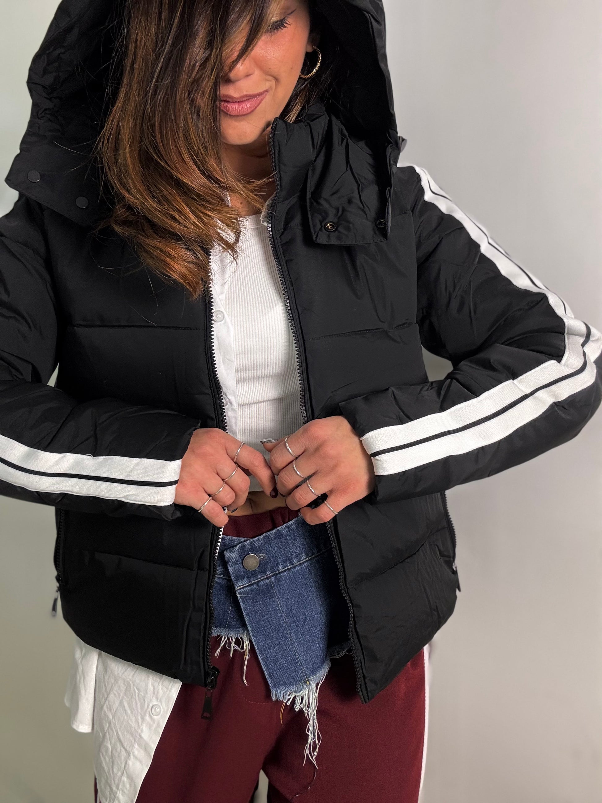 Giubbino foderato strutturato con zip frontale tasche e cappuccio , dettaglio bande laterali colore a contrasto