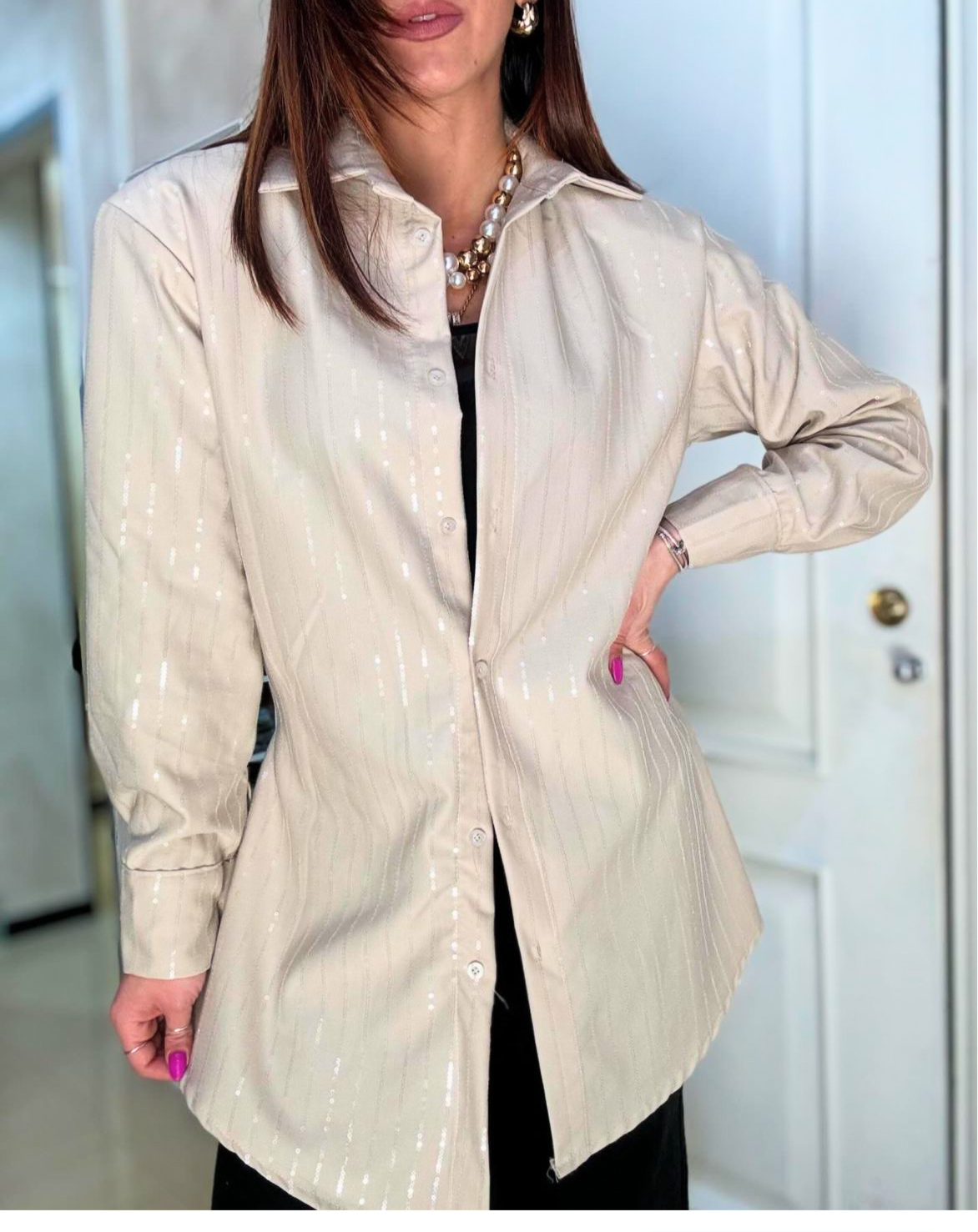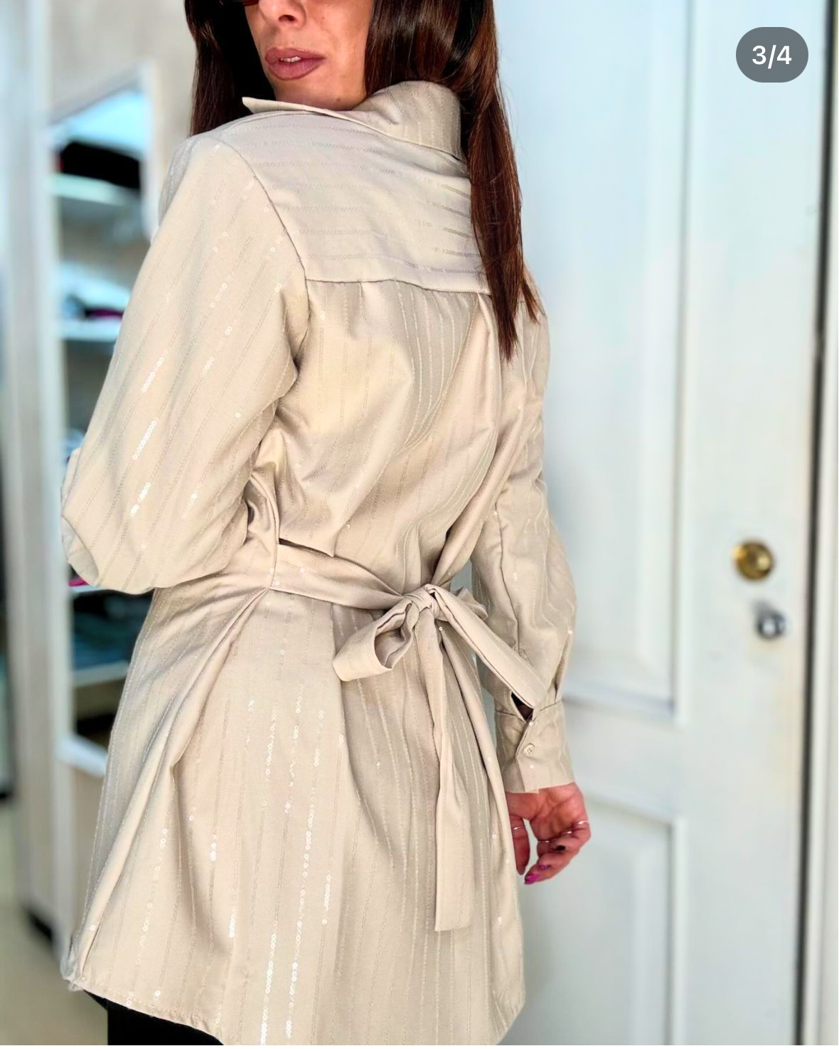 Camicia lunga in tessuto doppio con cinturino compreso strisce in paillettes tono su tono