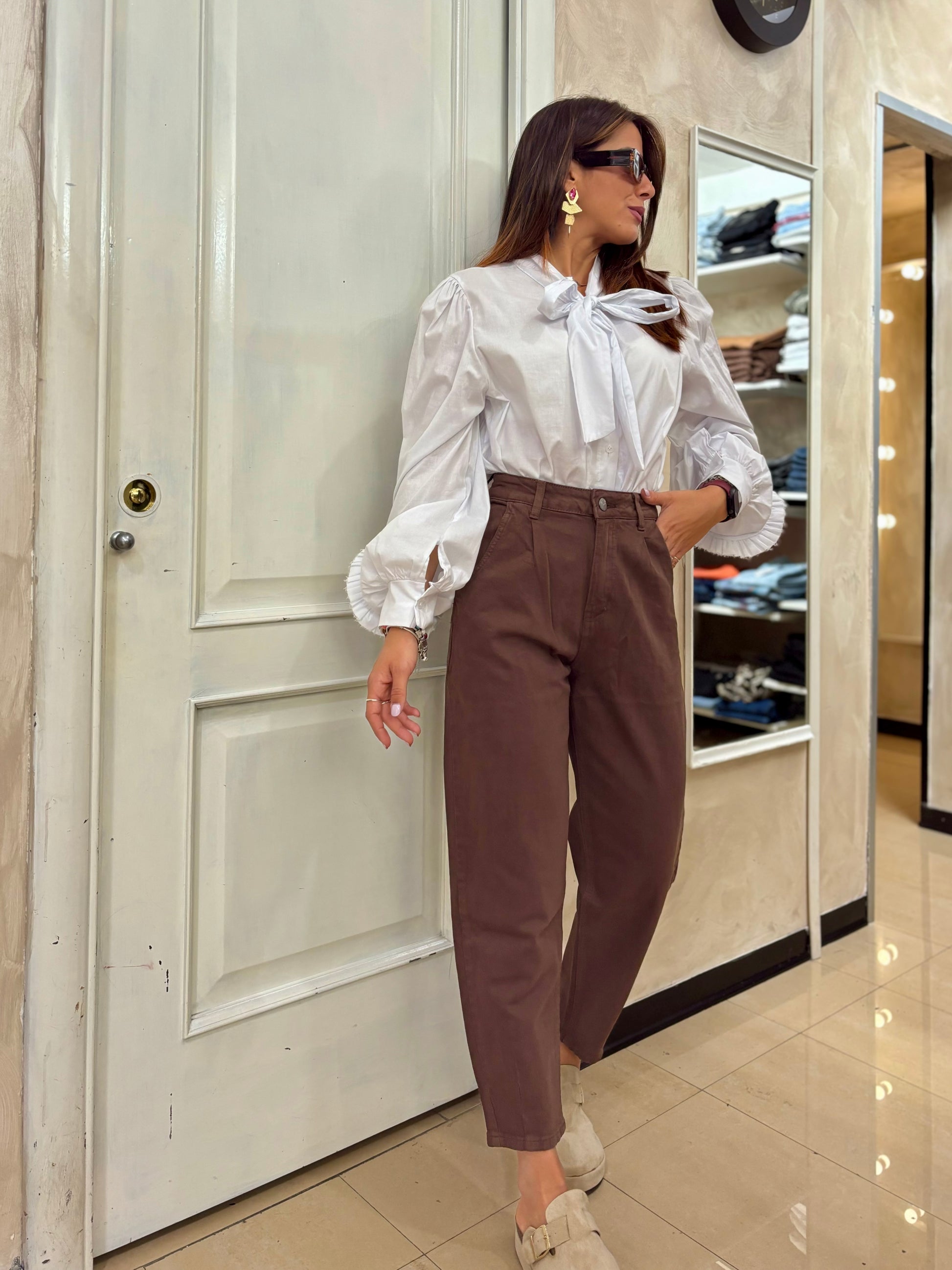 Camicia basic con chiusura fiocco e applicazioni fiore sui polsini