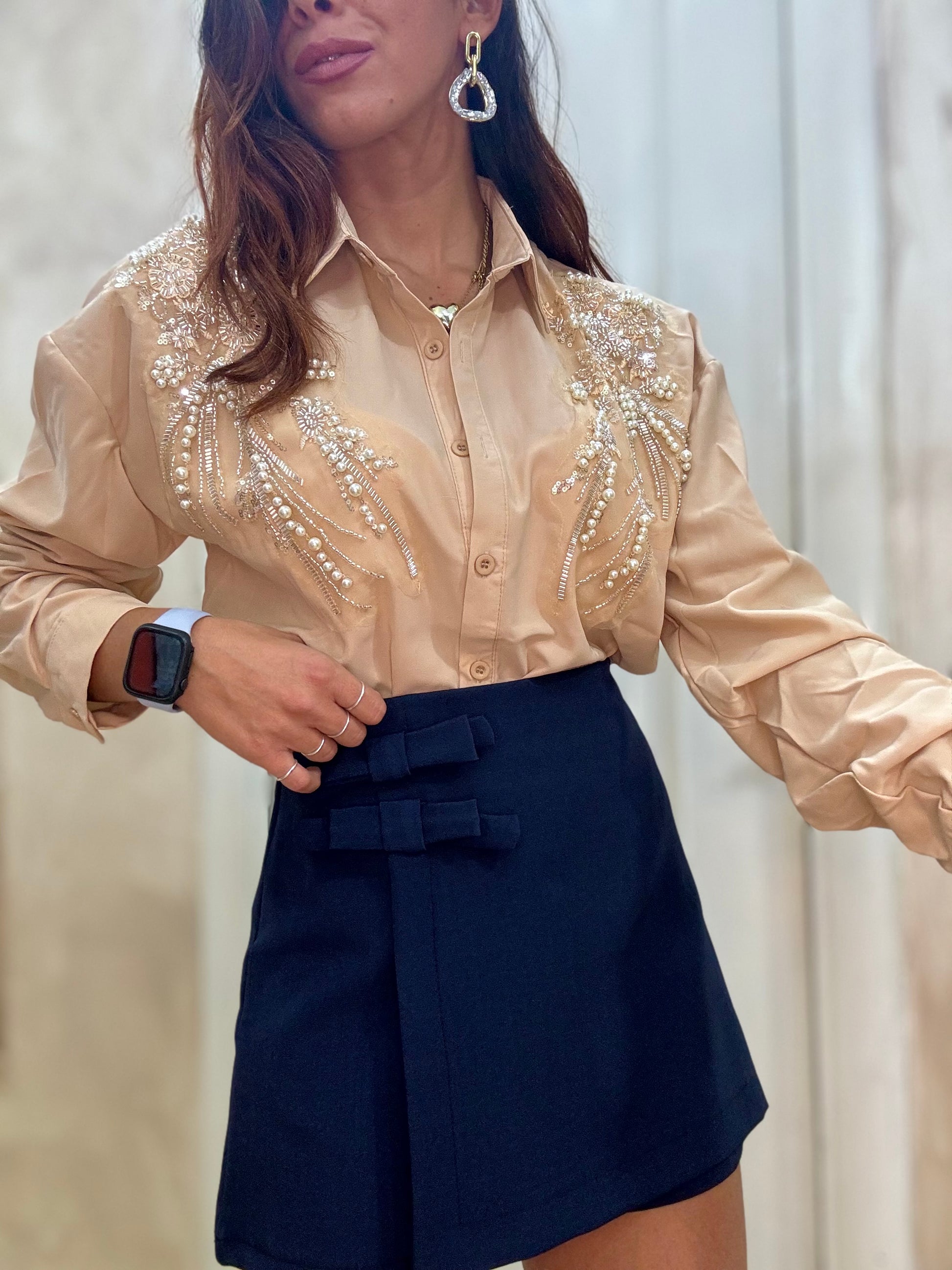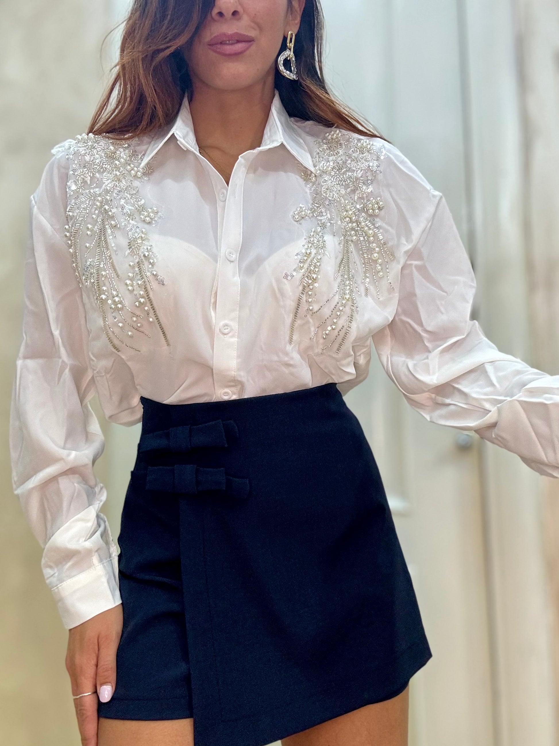 Camicia lunghezza regolare bottoni frontali e applicazioni sulle spalle vestibilità morbida