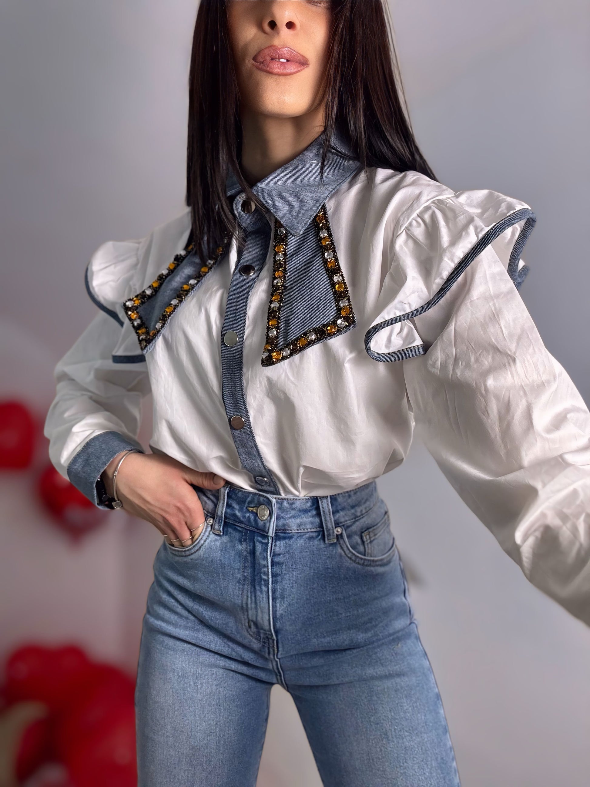 Camicia bianca con dettagli in denim finta cravatta e bottoni frontali con ciappe veste fino ad una 44