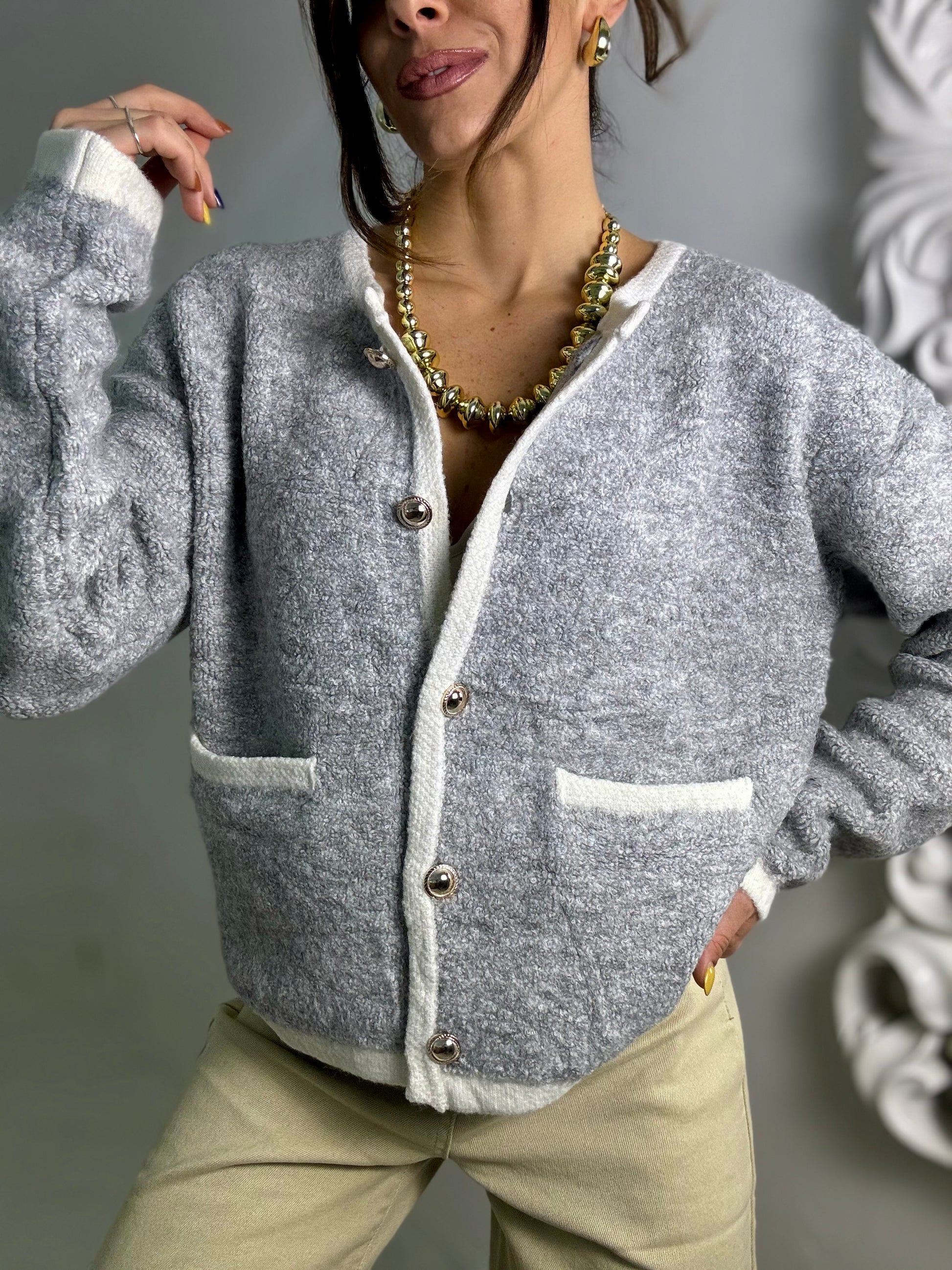 Cardigan in lana calda con dettagli bottoni oro e tasche frontali veste fino ad una 46