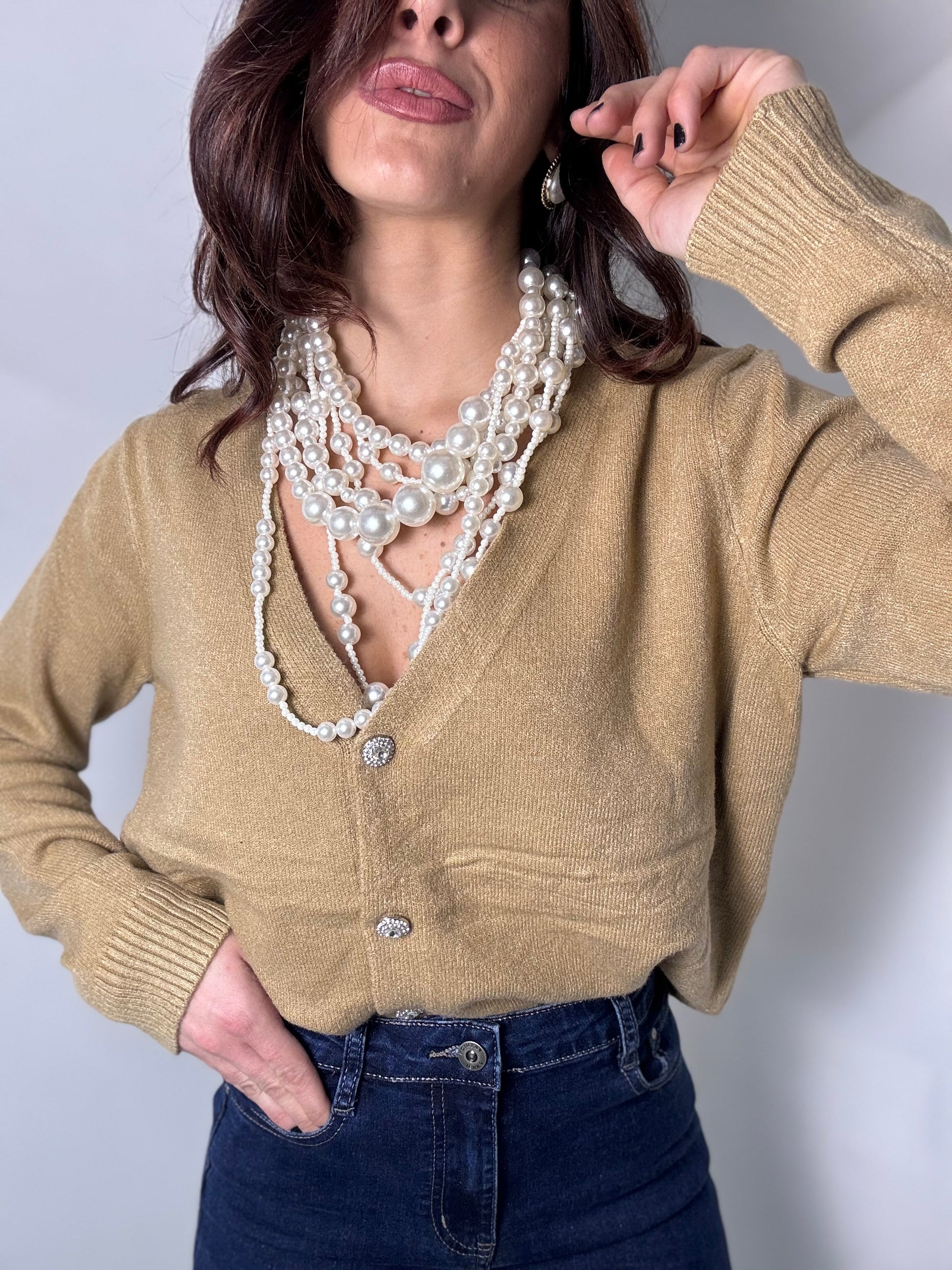 Cardigan con bottone gioiello lana rasata veste fino ad una 46