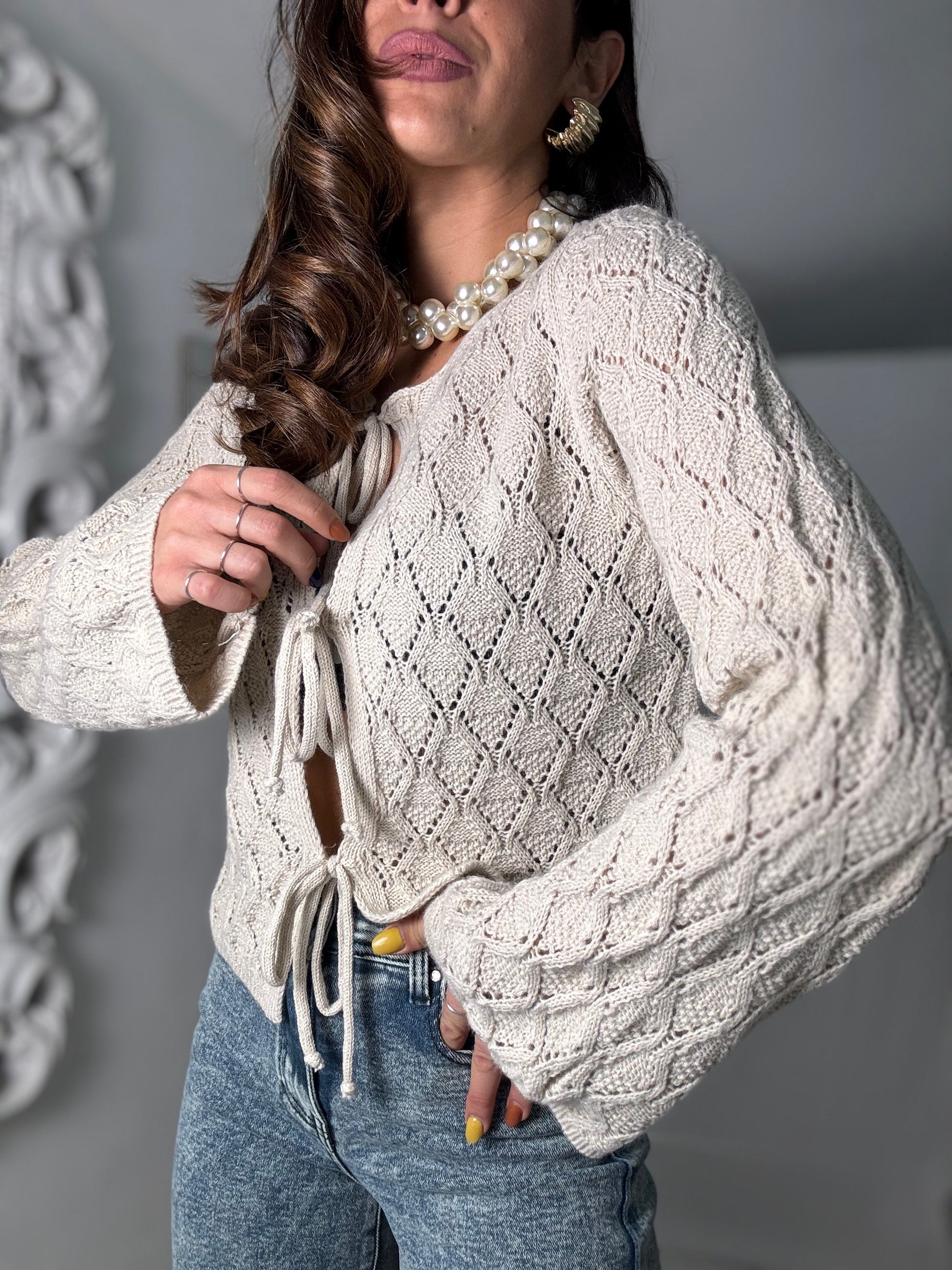 Cardigan traforato con chiusura lacci frontali veste fino ad una 46