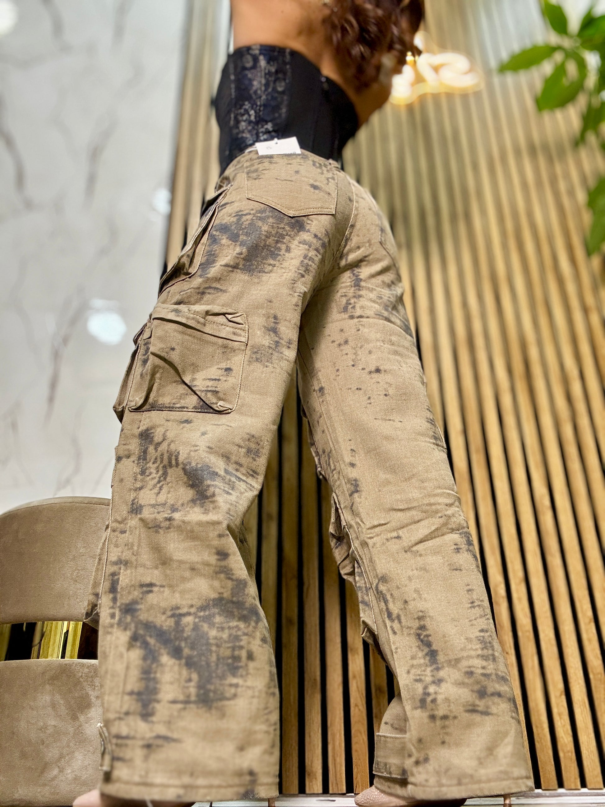 Cargo beige con dettagli blu scuro multipocket vita alta