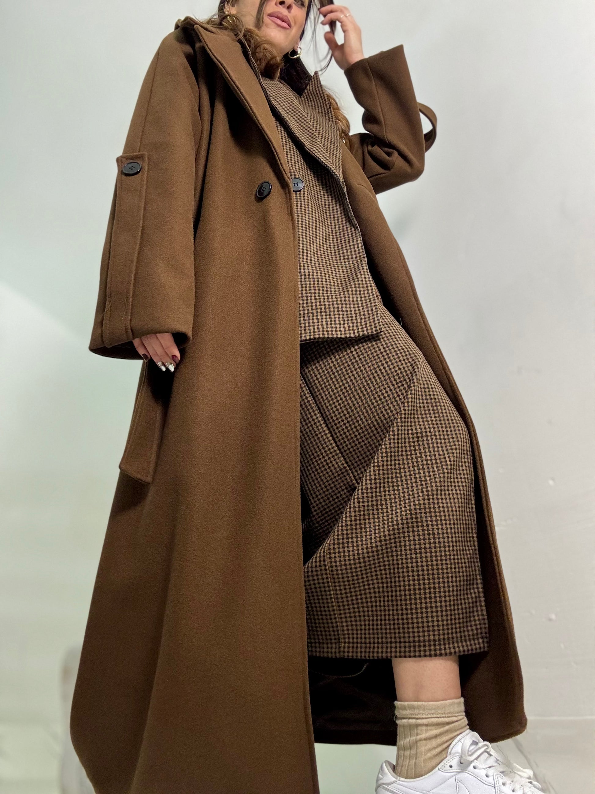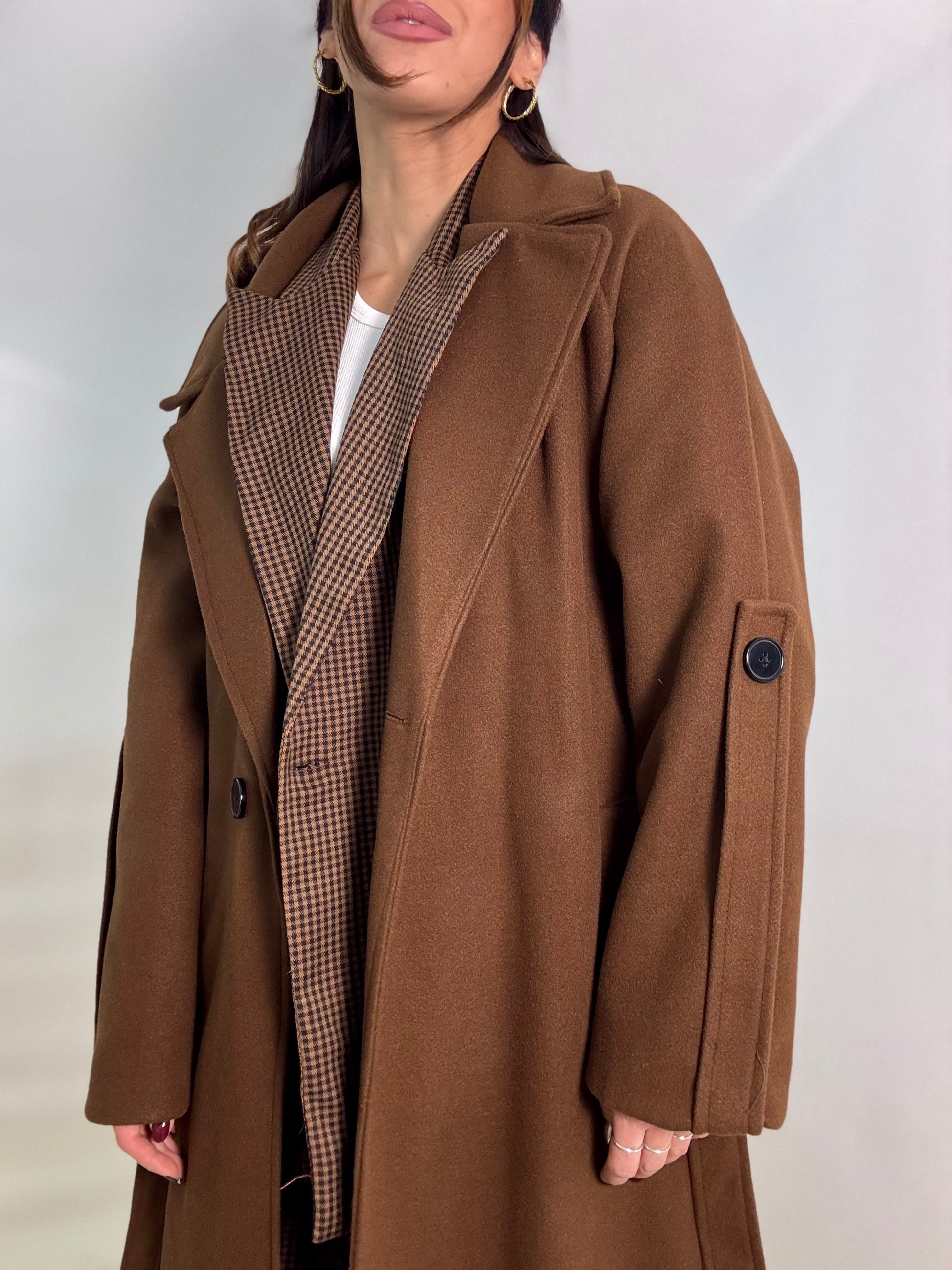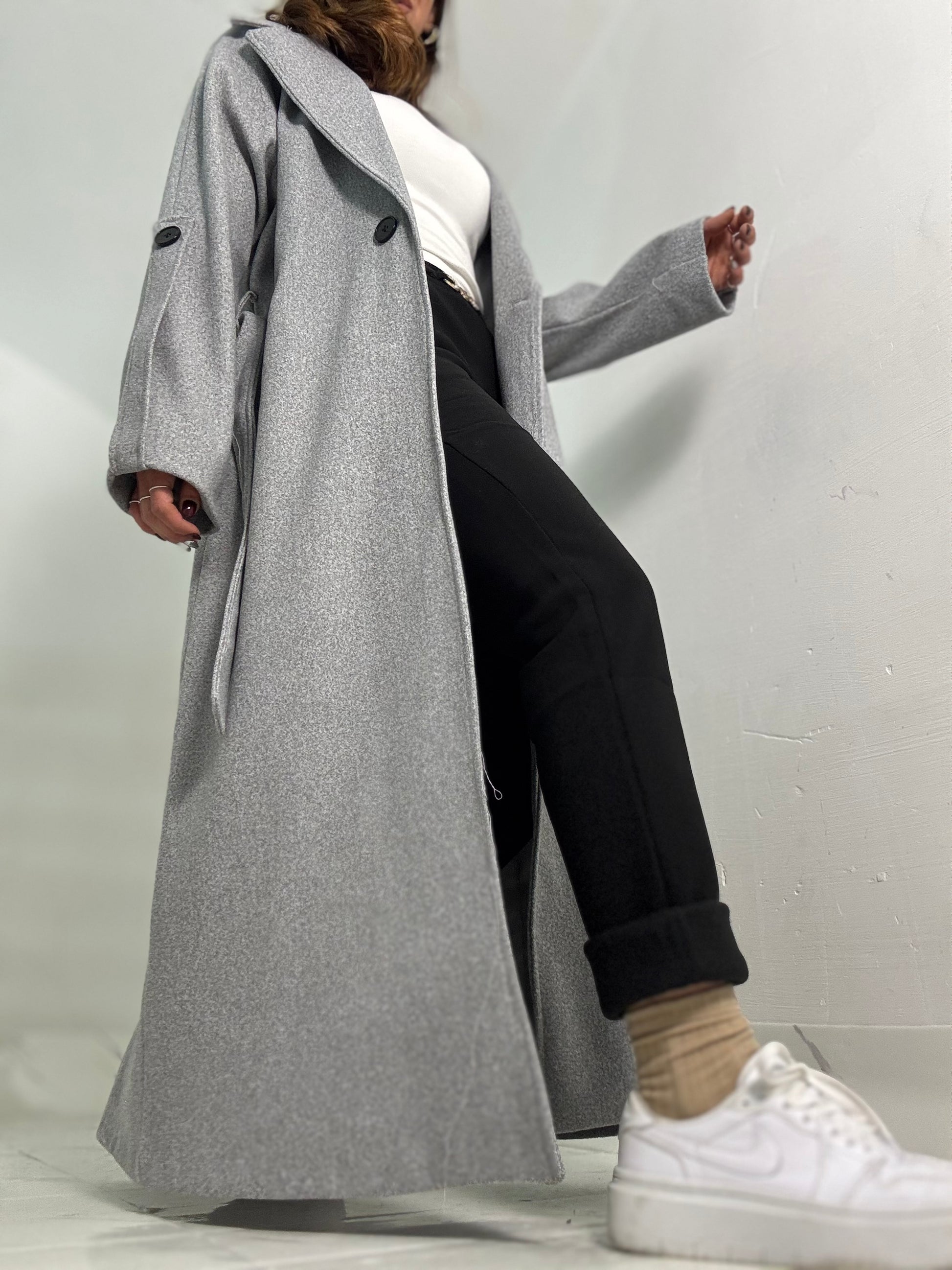 Cappotto lunghezza alla caviglia con cintura compresa e dettagli, bottone sulla manica