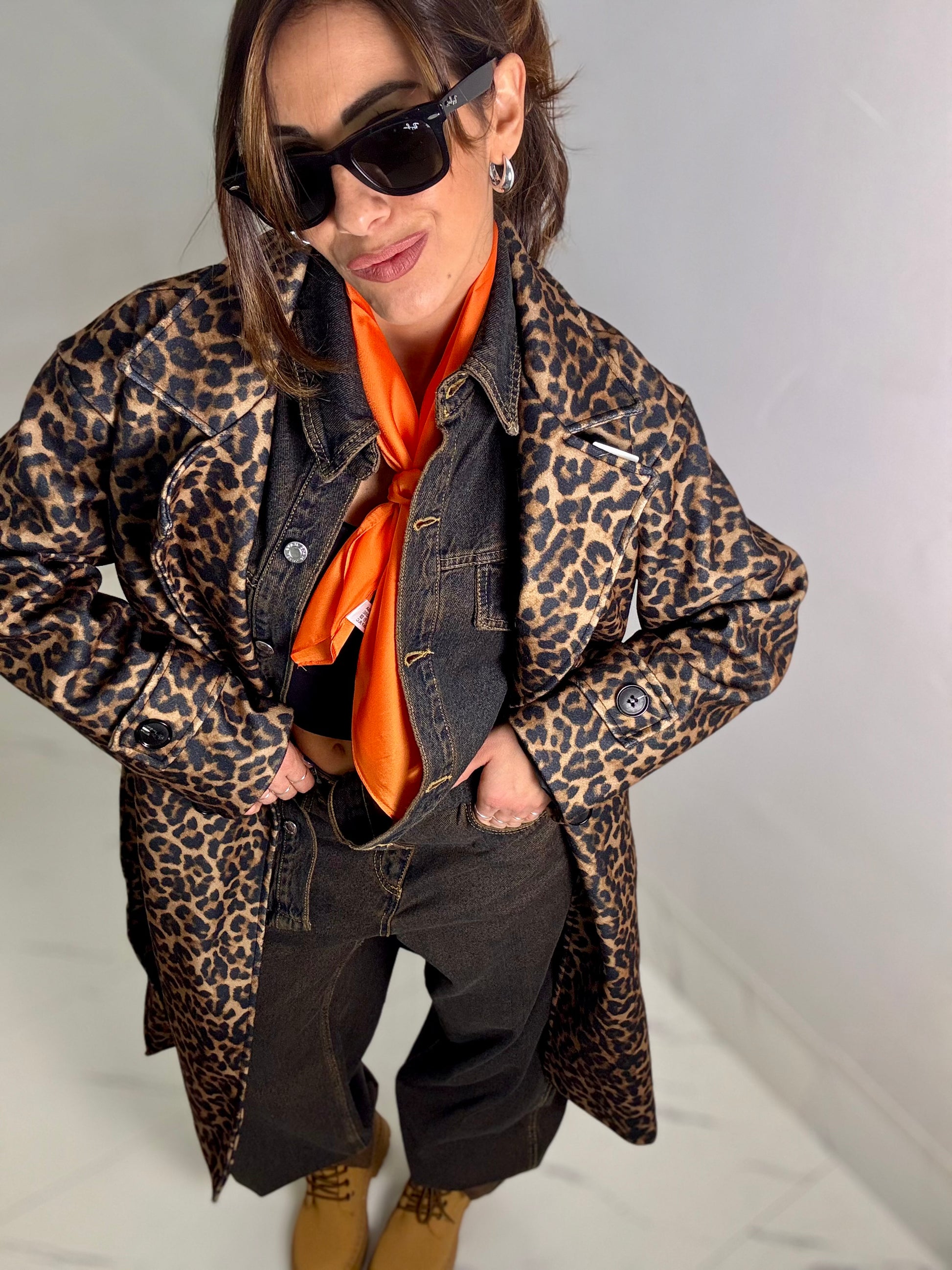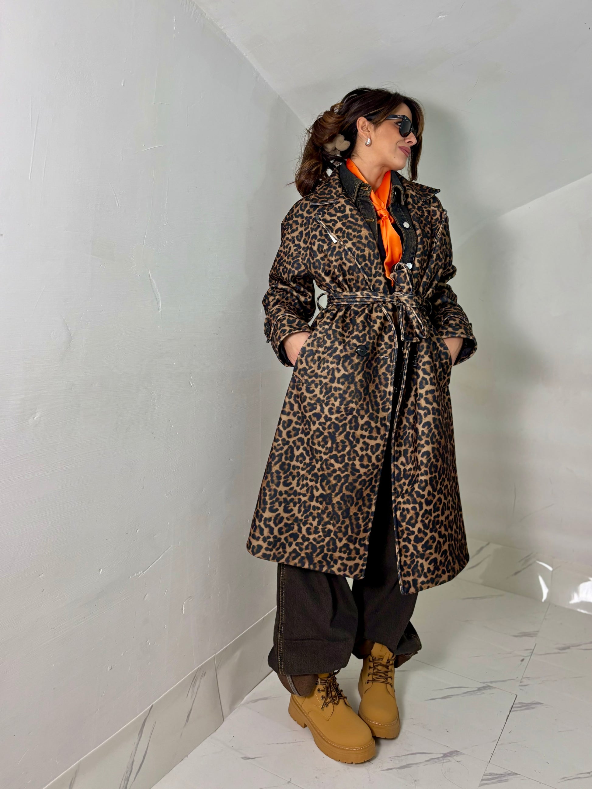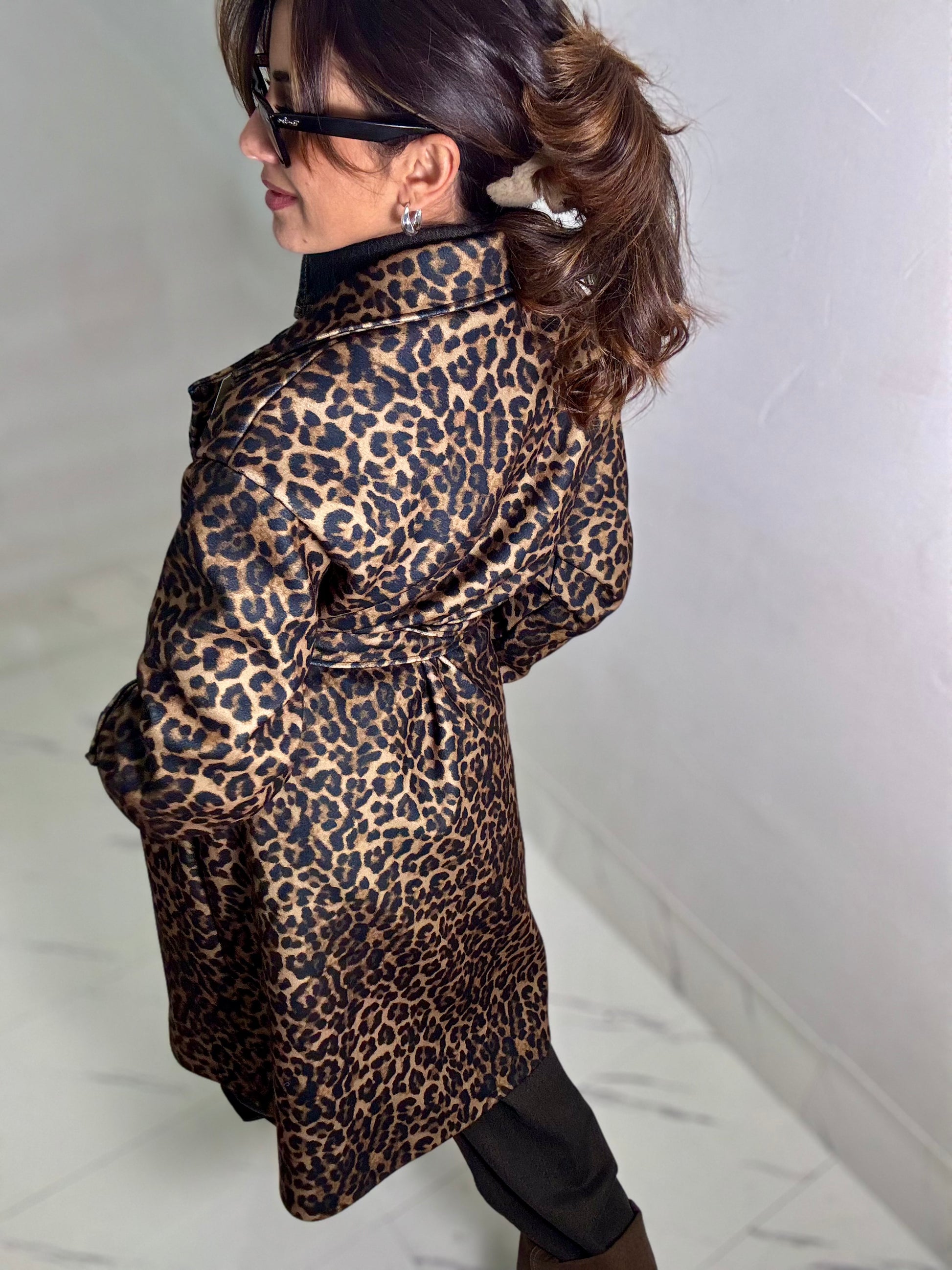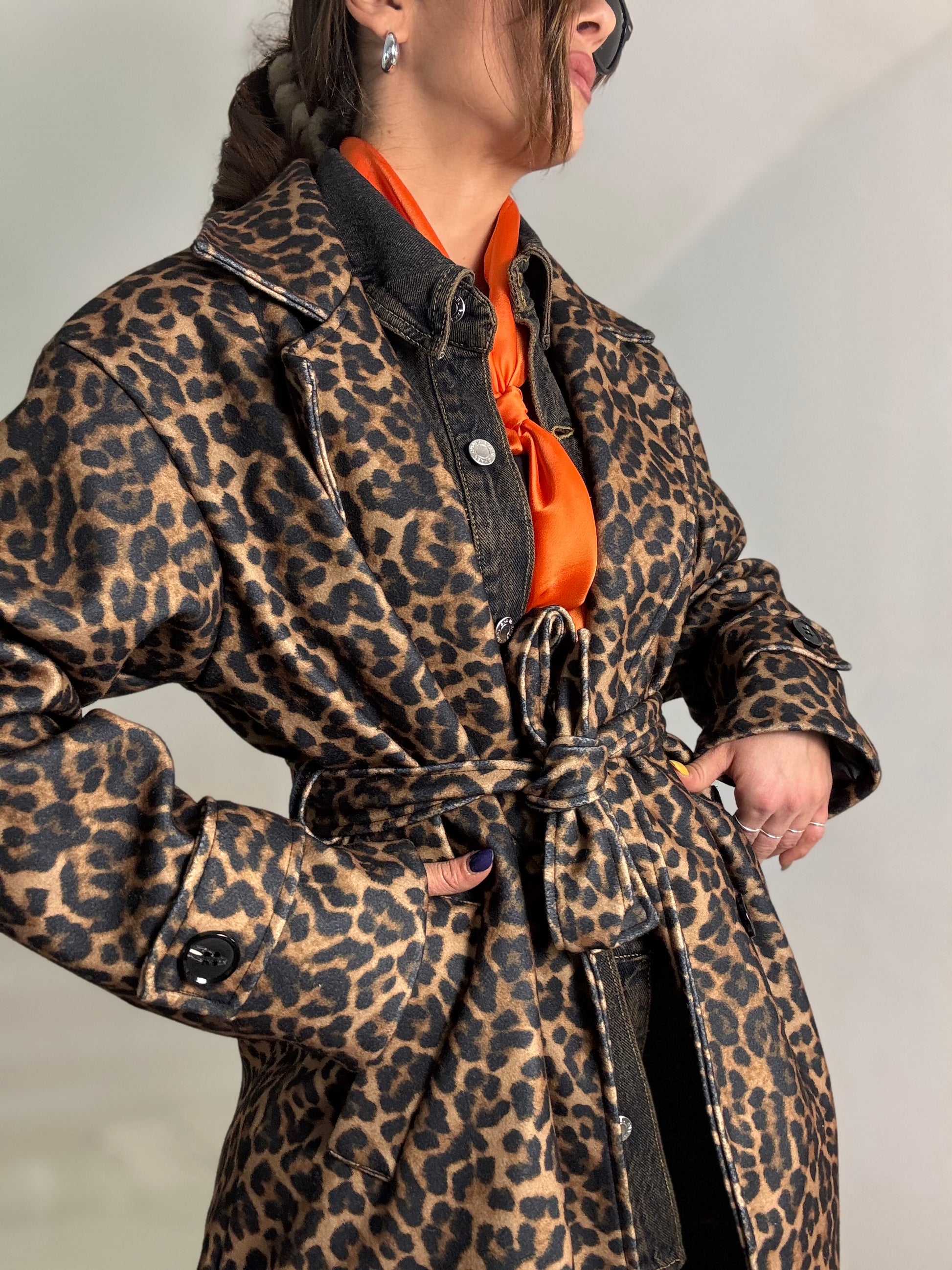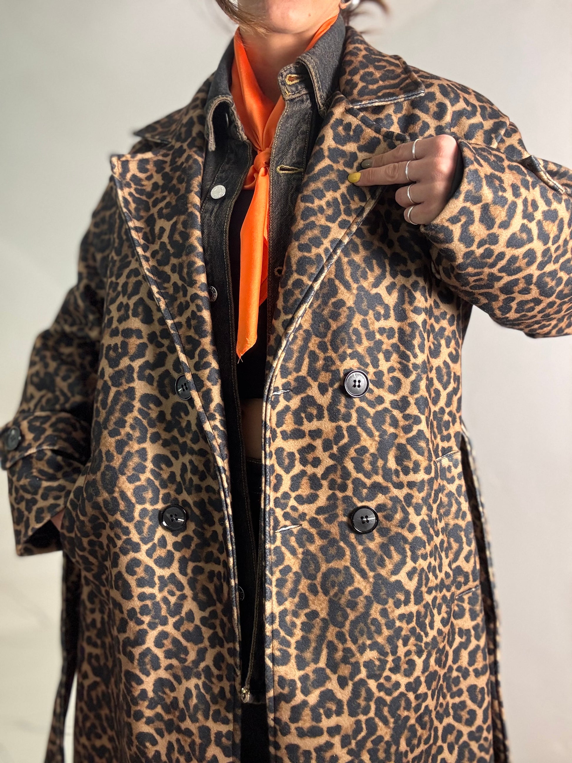 Cappotto lungo fantasia animalier con bottoni frontali e cintura, lungo al ginocchio veste fino ad un 44-46