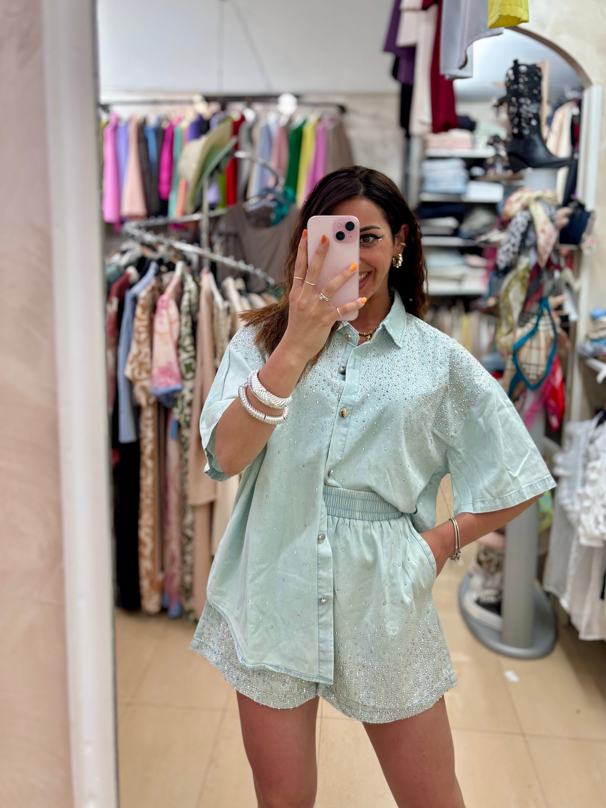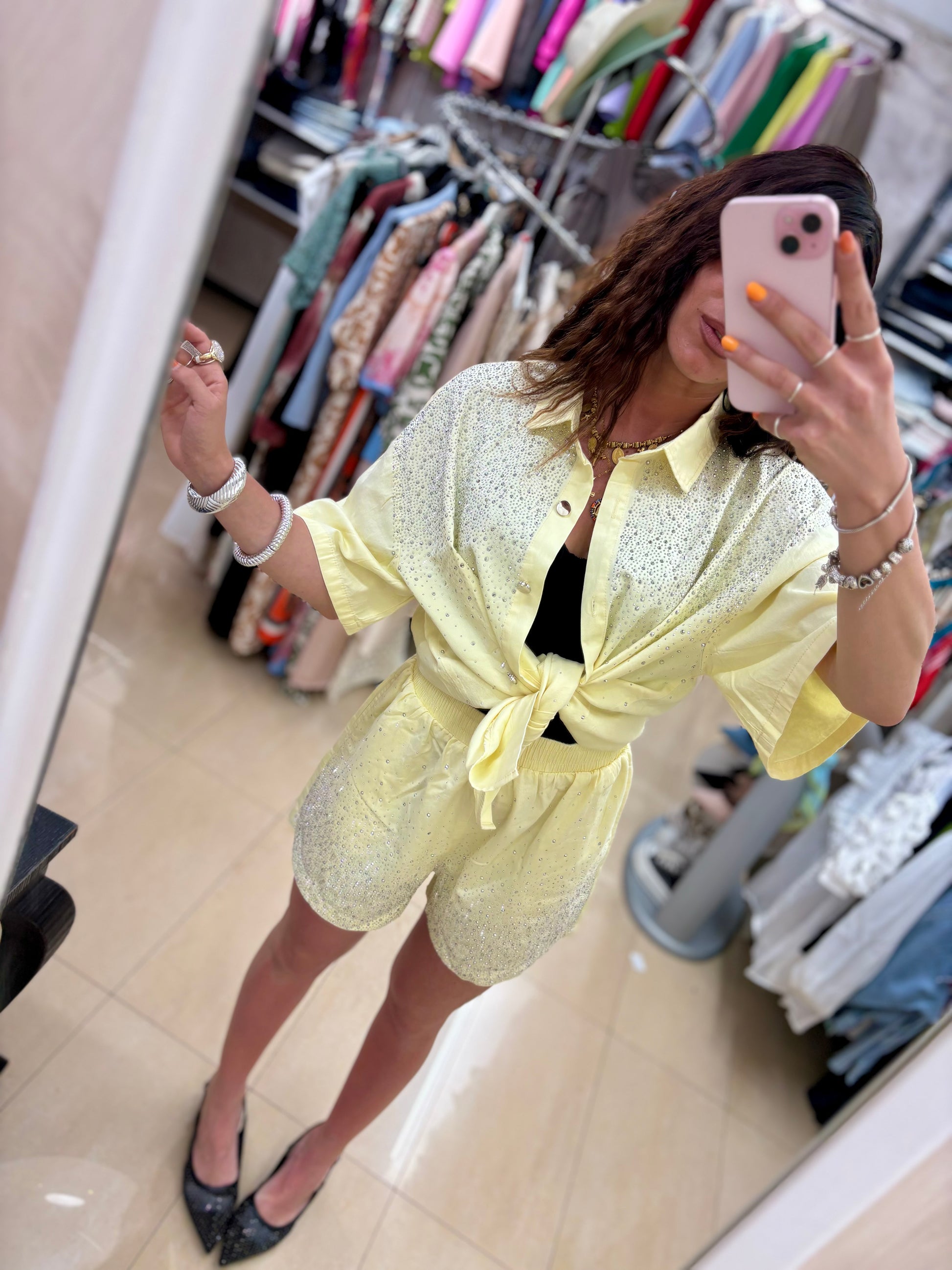 Completo in misto lino composto da shorts con elastico in vita e camicione lungo dettagli strass veste fino ad una 48