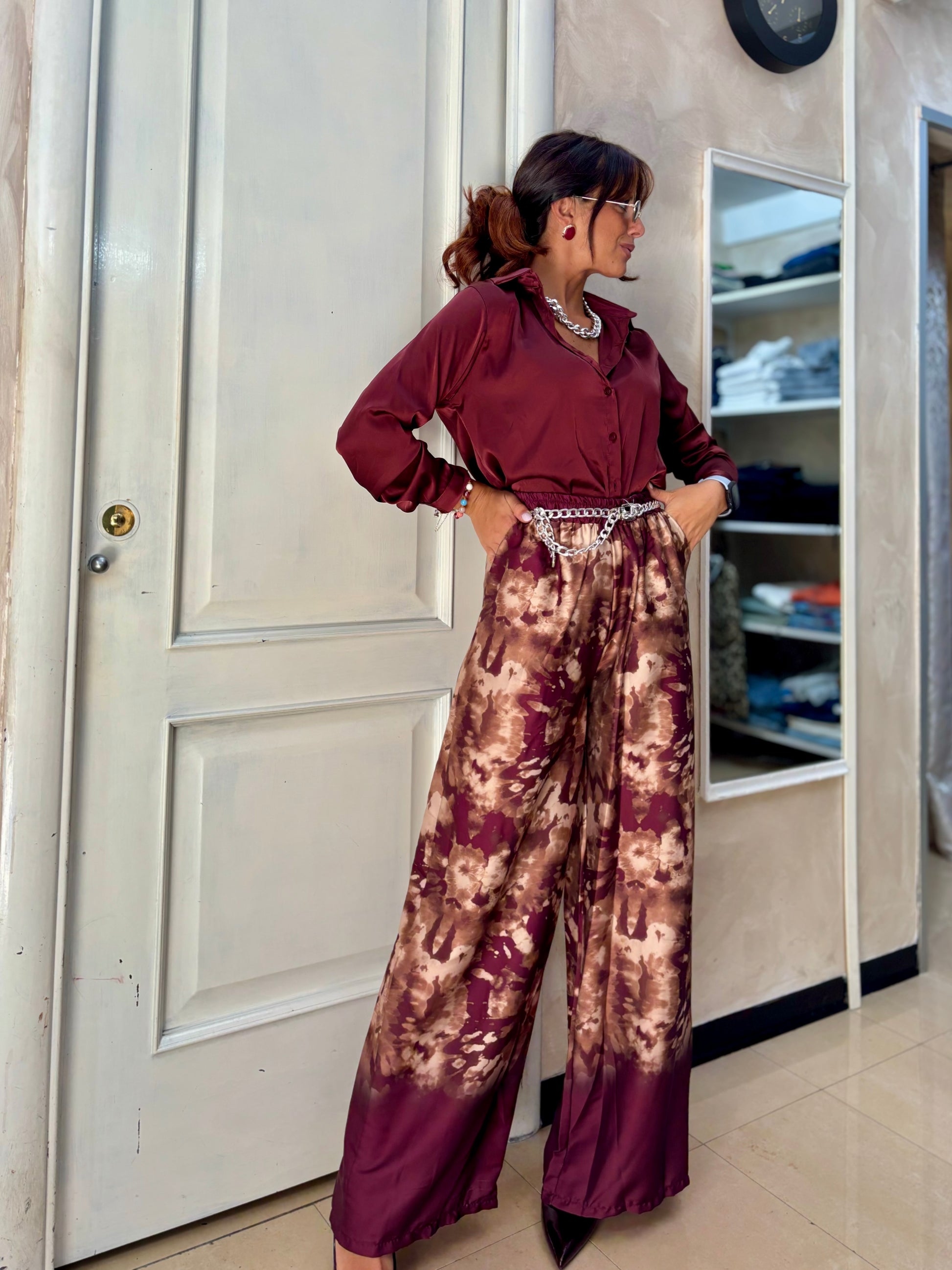 Coordinato composto da pantalone a palazzo floreale e camicia in raso seta lunghezza regolare monocolore