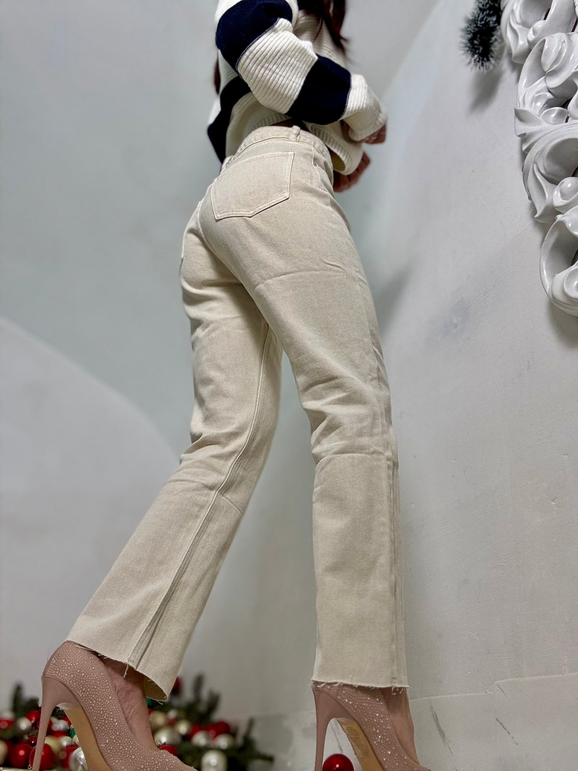 Denim crema vita alta tessuto leggermente rigido taglio vivo sul fondo