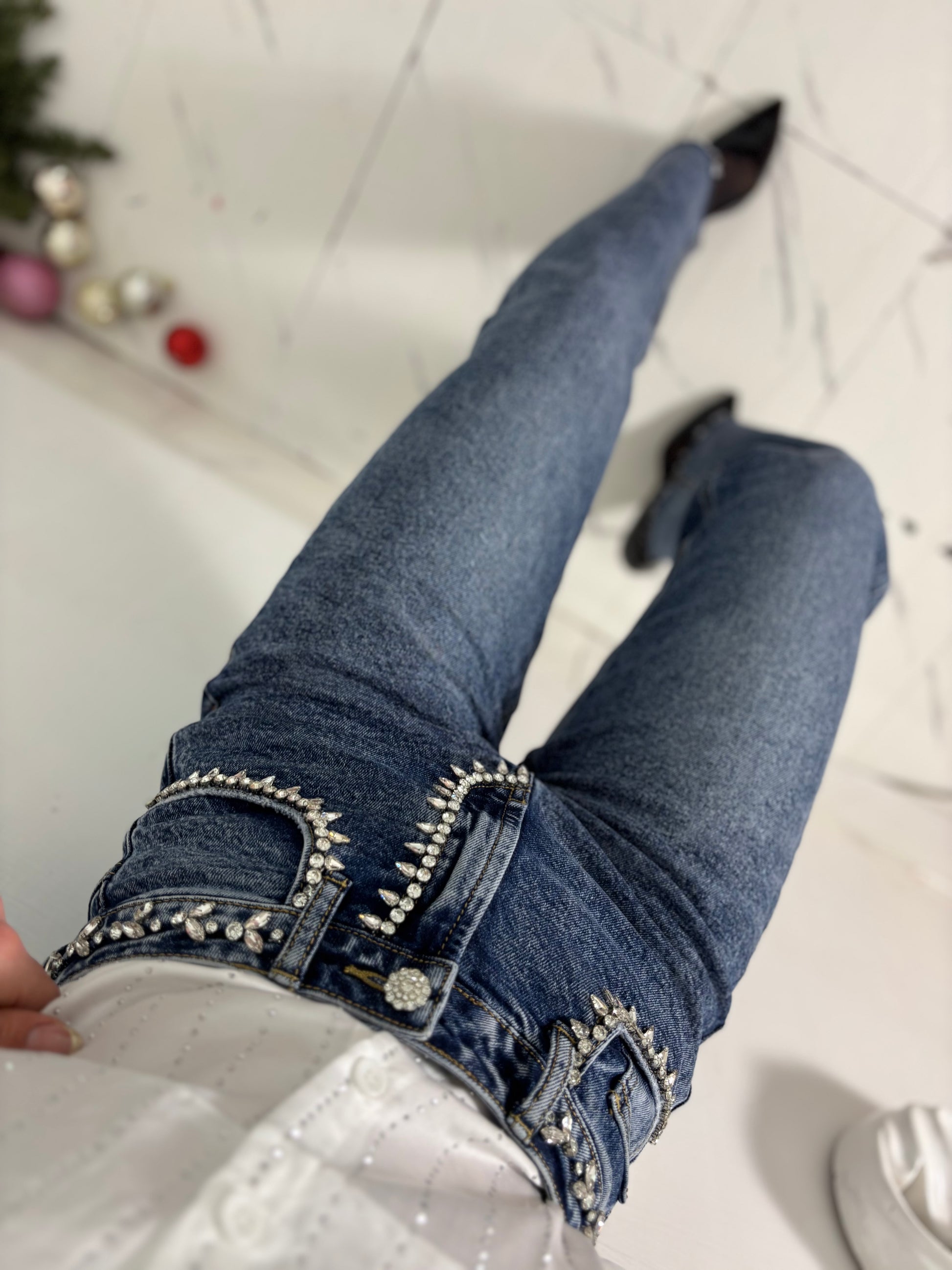 Denim taglio dritto lavaggio scuro con applicazione di strass sulla parte superiore
