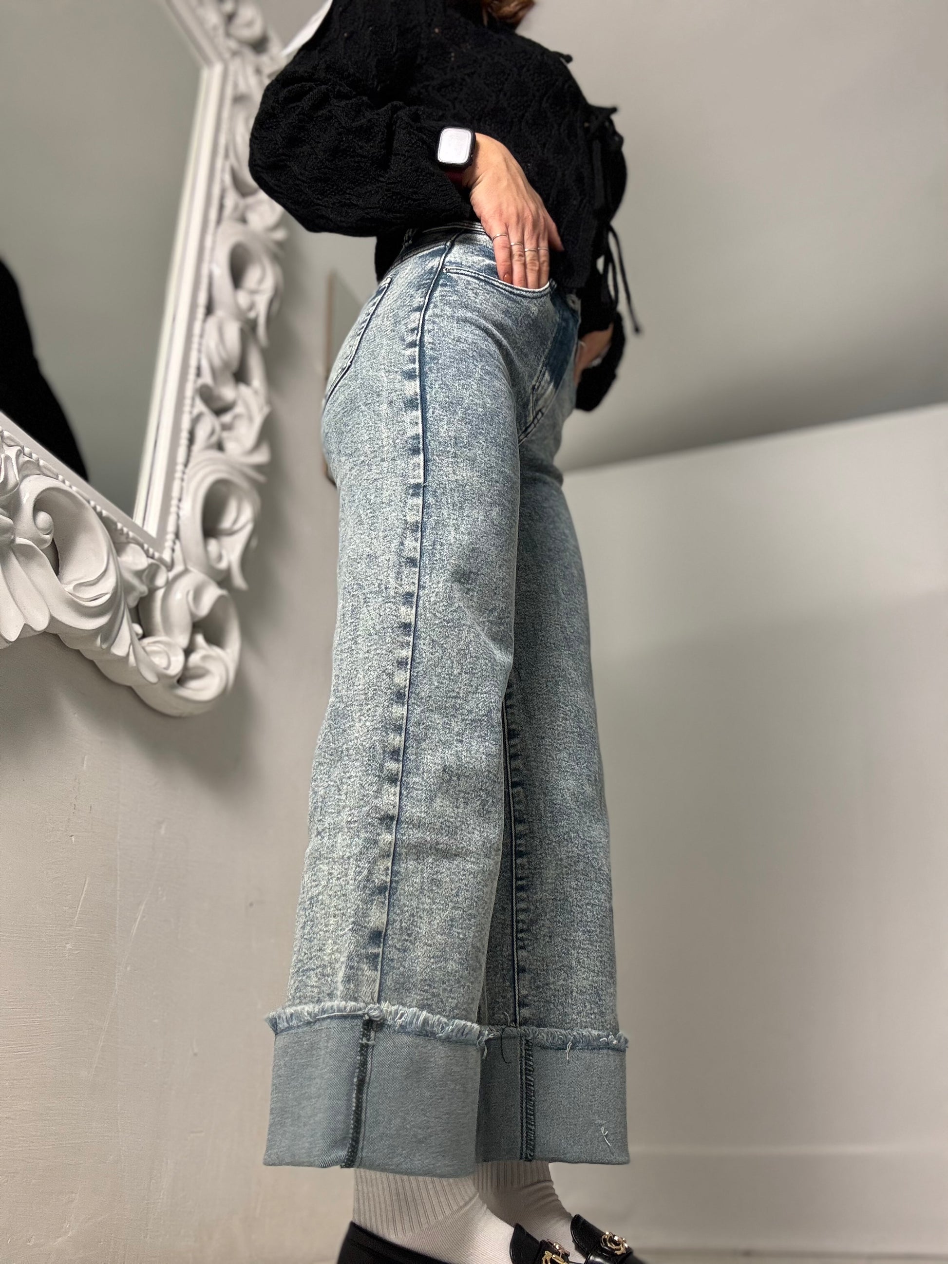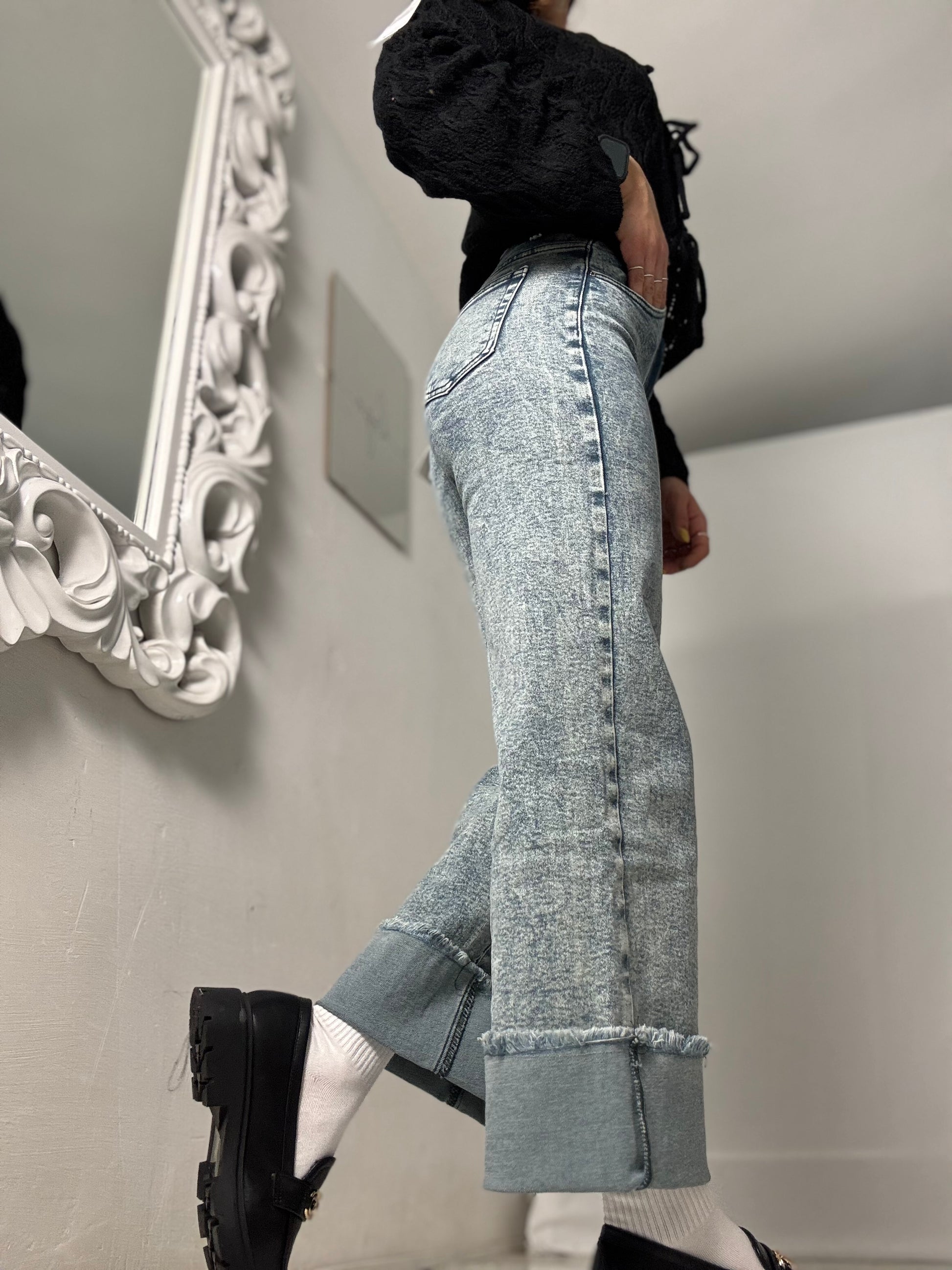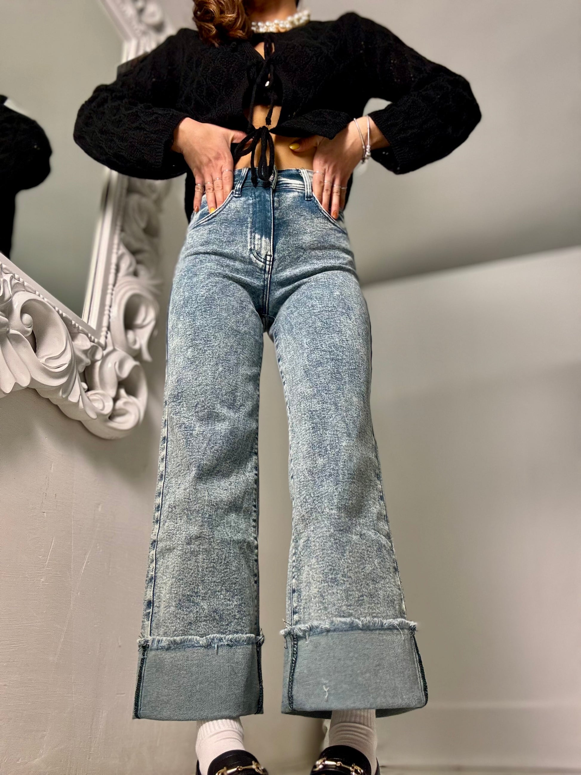 Denim vita alta modello a palazzo con risvolto cucito tessuto semi elastico