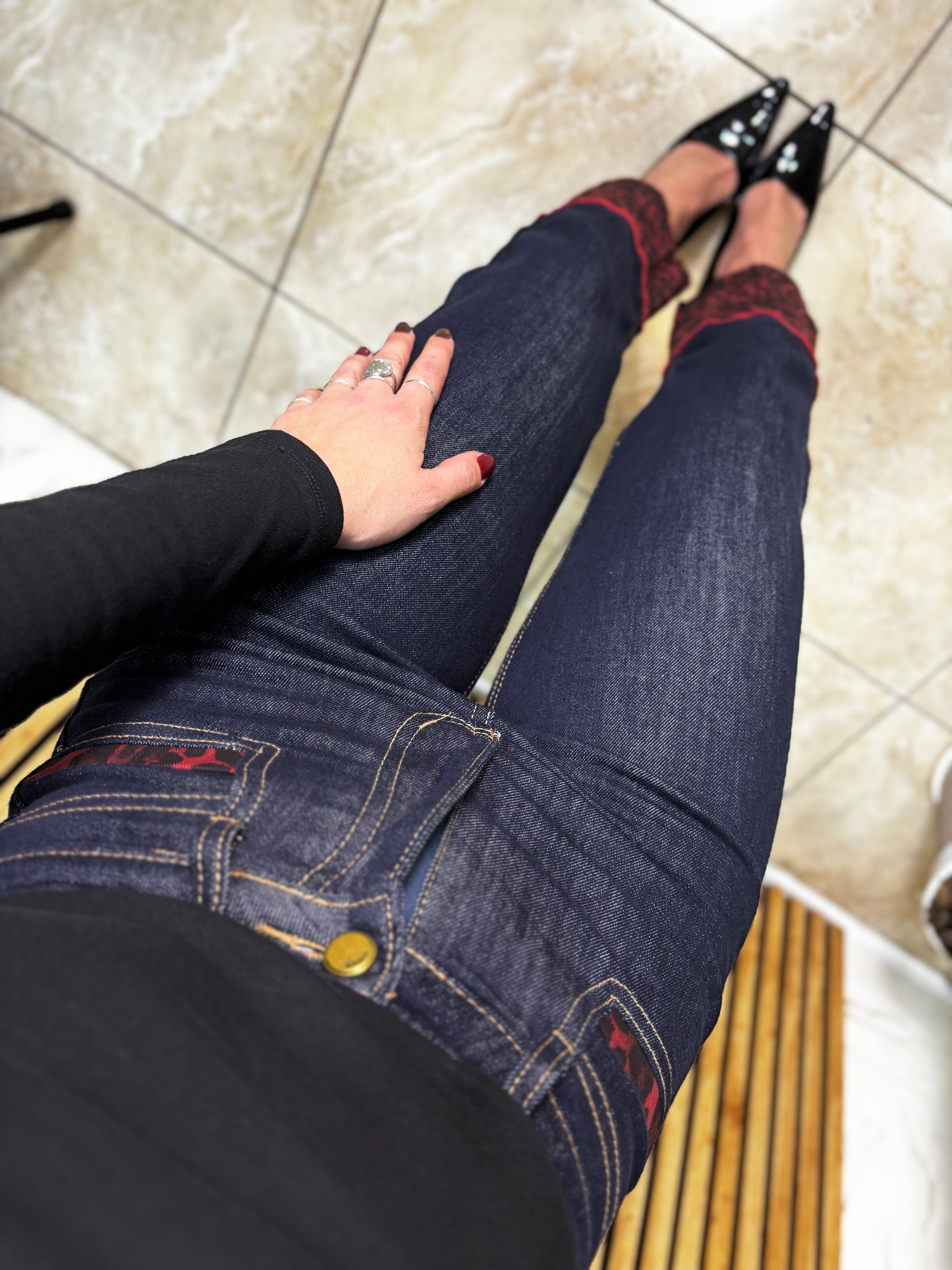 Denim gamba dritta vita alta tessuto rigido con dettagli maculato sulle tasche e sulla piega