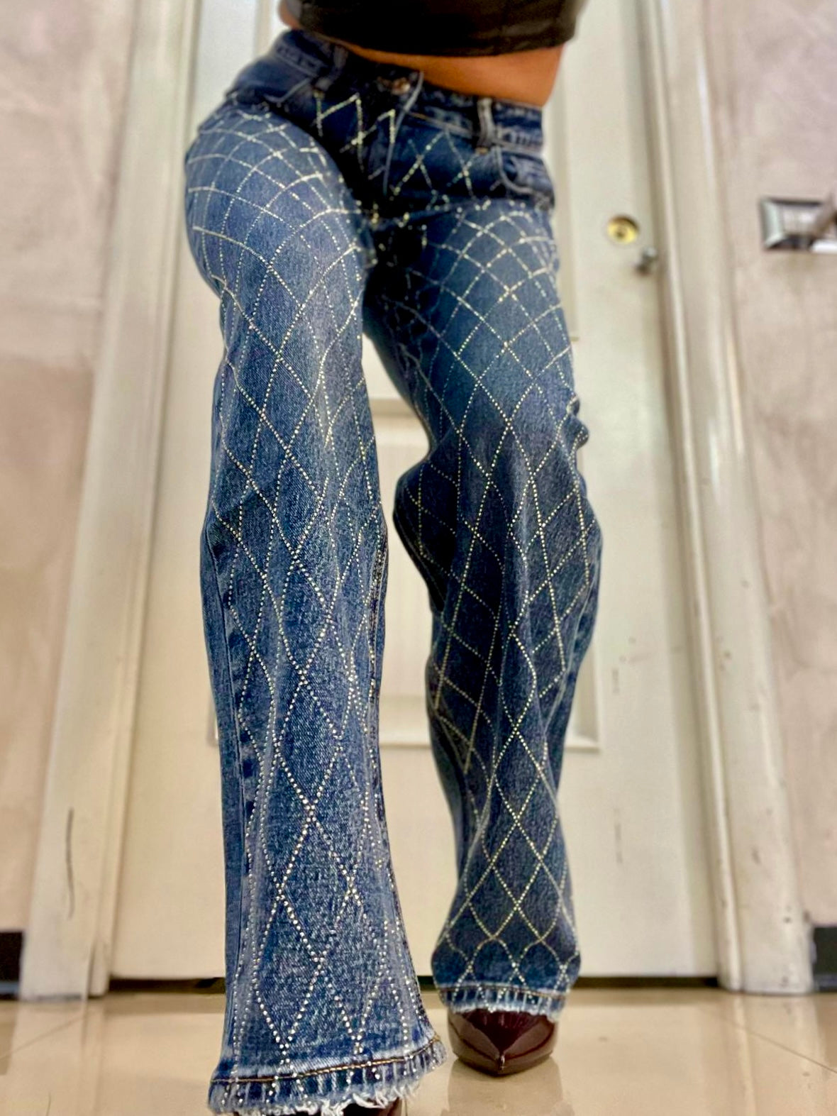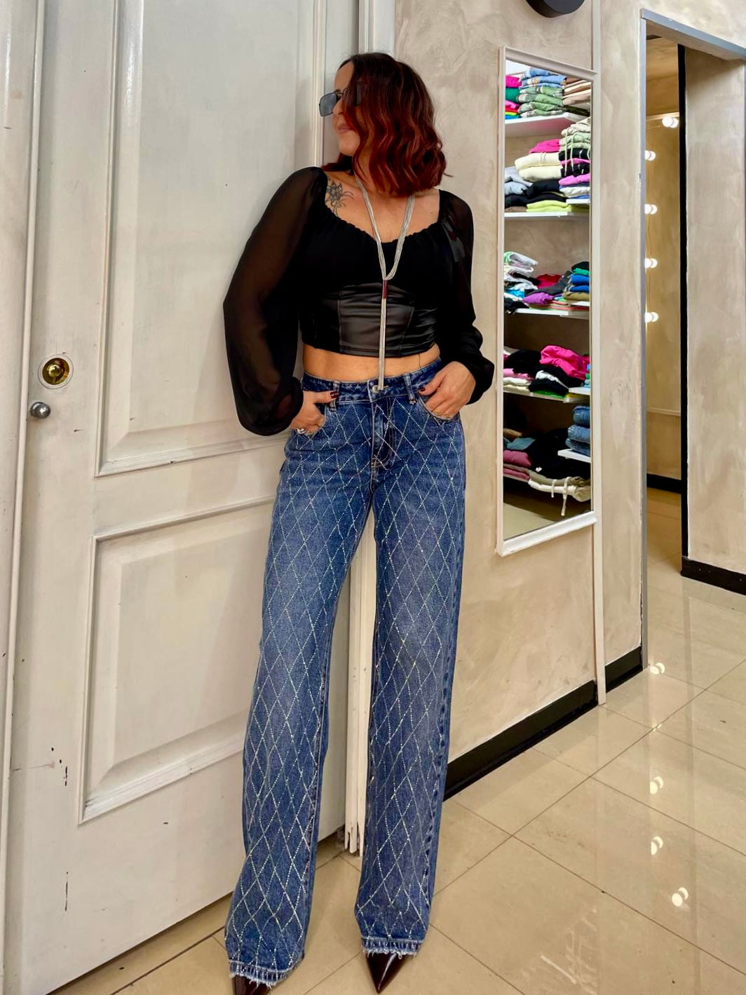 Denim taglio dritto fantasia rombo strassato tessuto semielastico