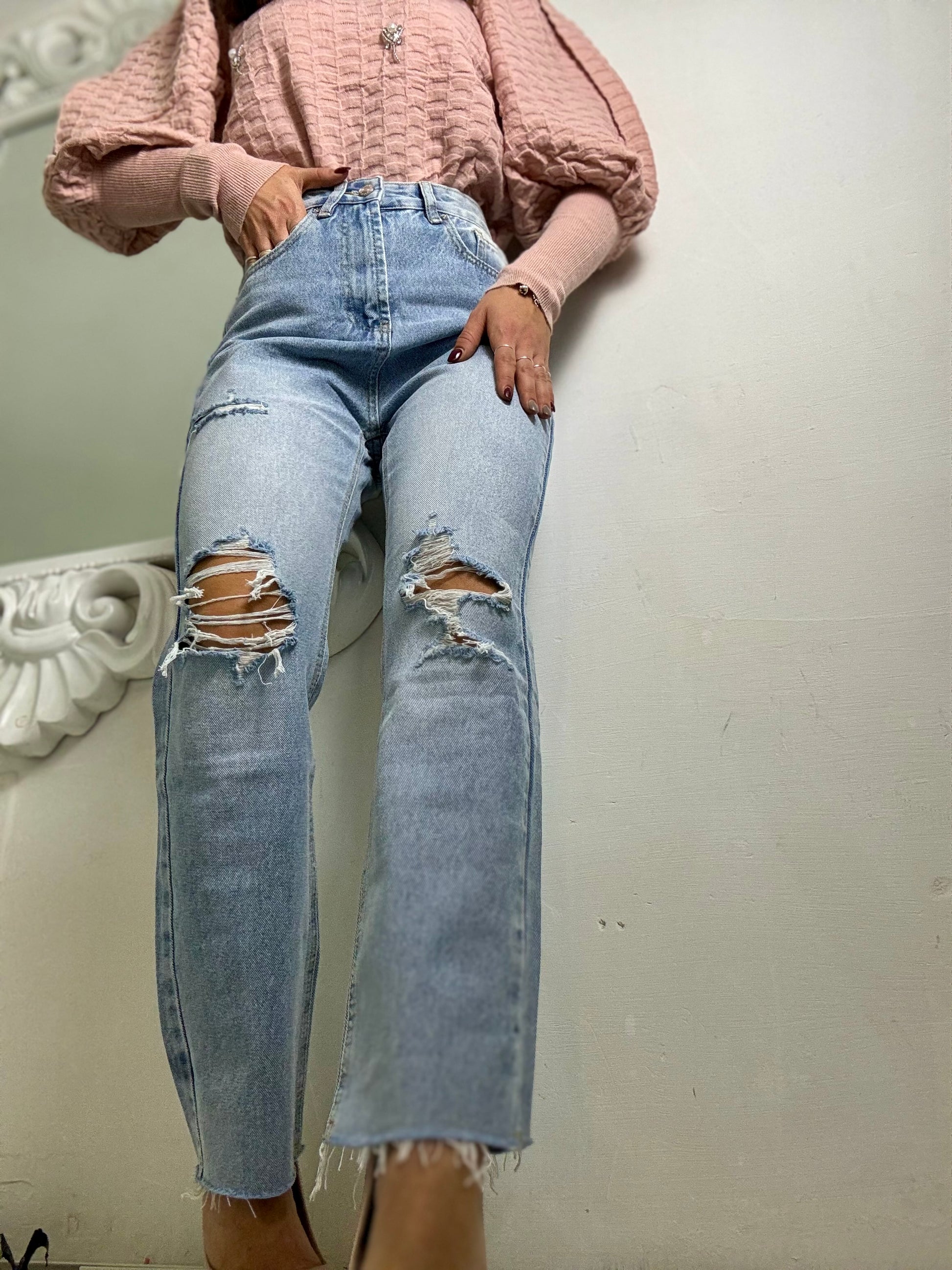 Denim rigido modello Mom fit con strappature al ginocchio e taglio vivo sul fondo