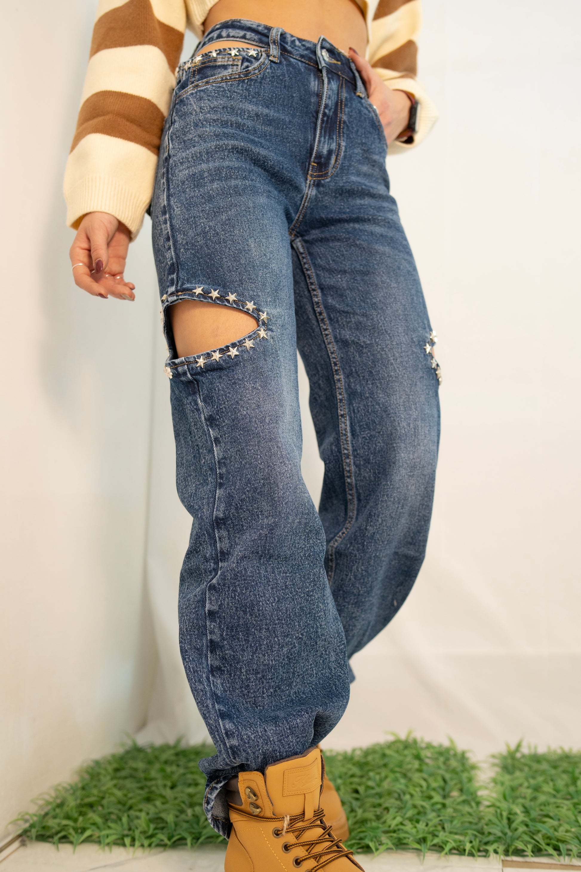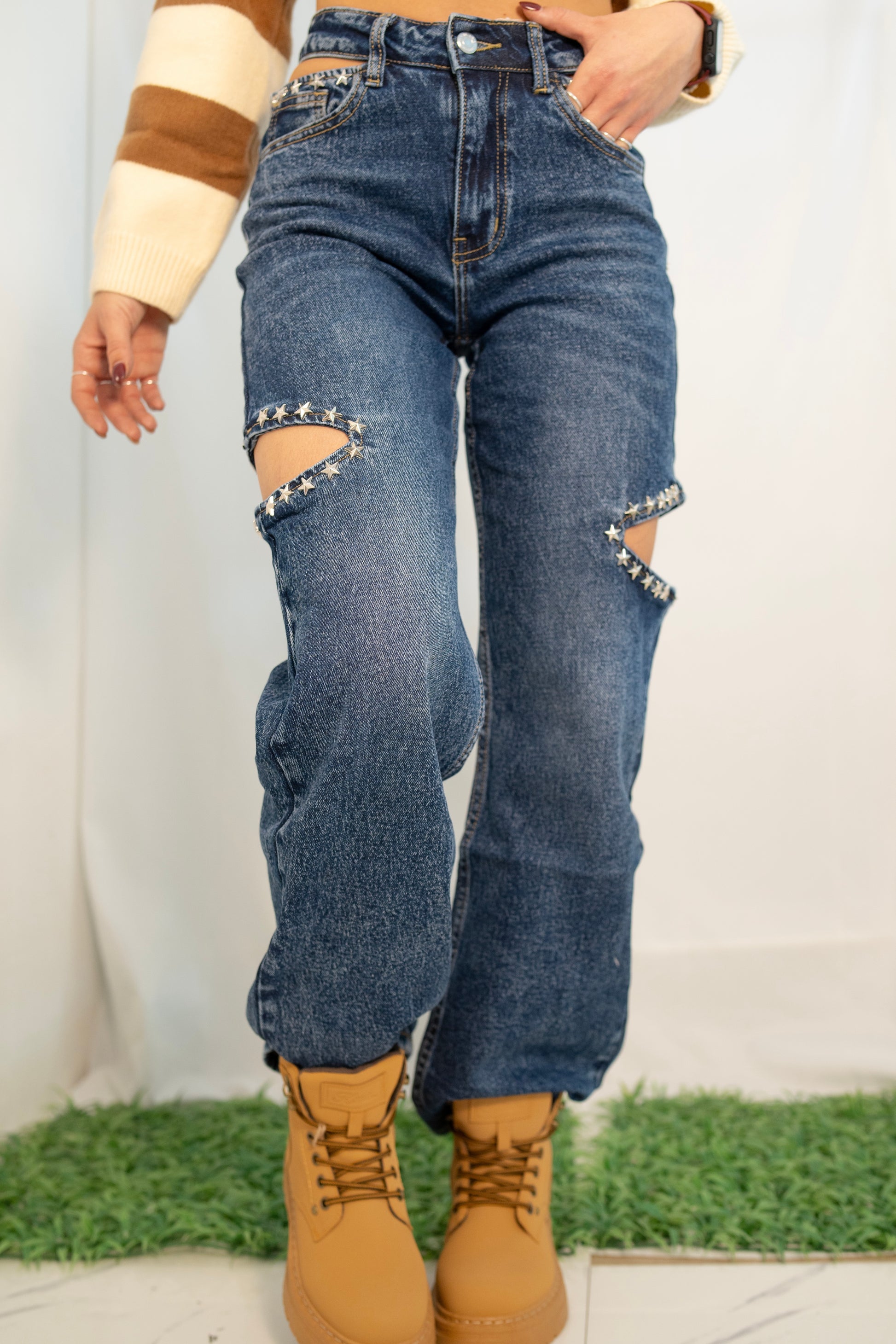 Denim gamba dritta con dettagli aperture e applicazione di stelle metalliche tessuto rigido