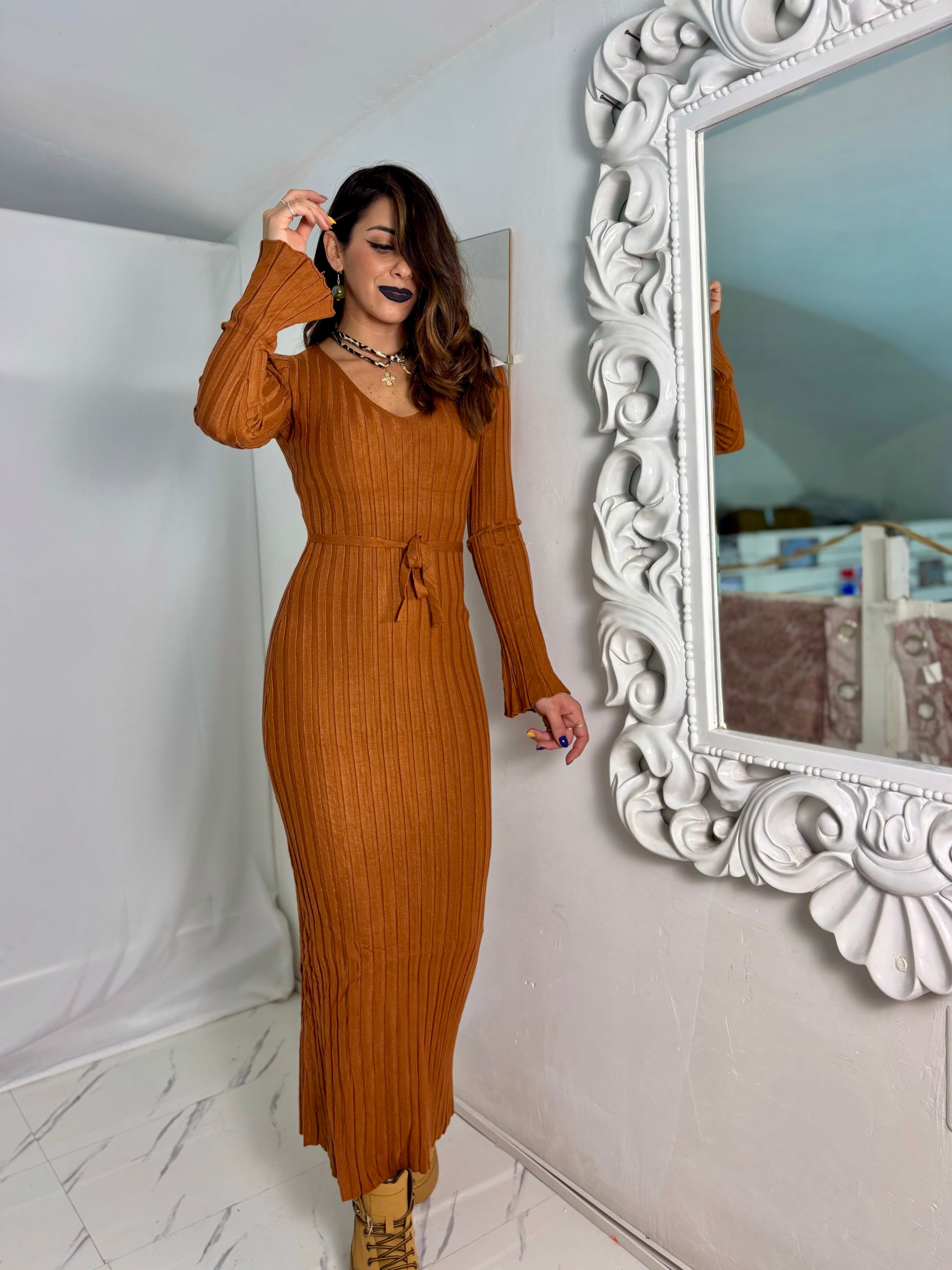 Dress lungo in lana rasata con dettaglio cinturino tessuto coste tg unica veste fino ad una 46