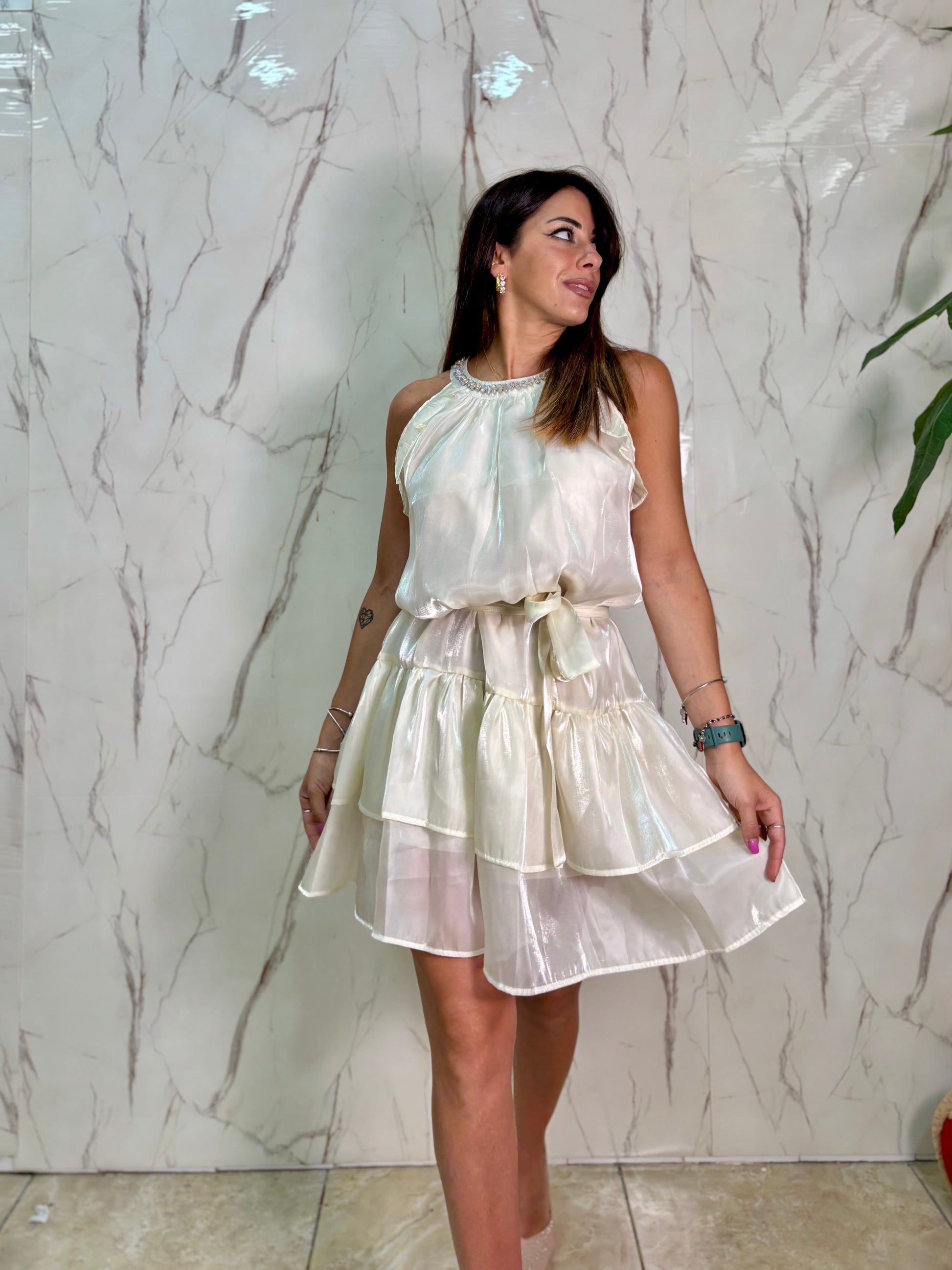 Dress satin svasato con cinturino dettagli strass sul giro collo tg U veste fino ad una 44-46