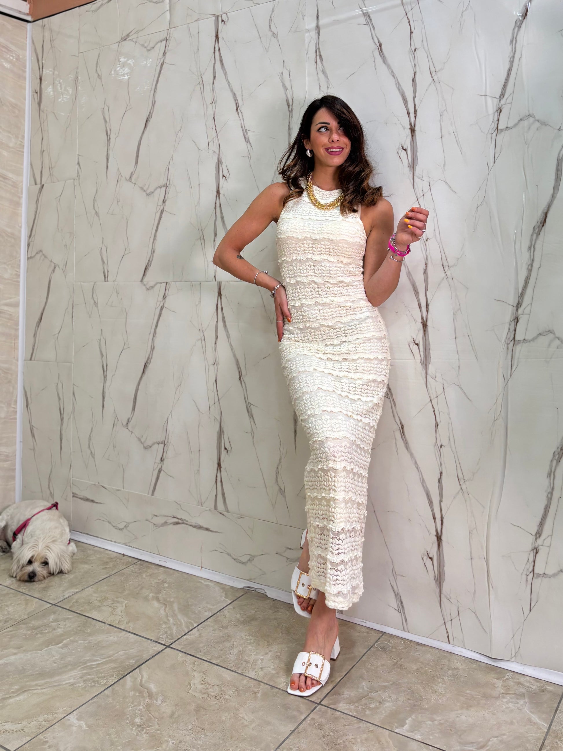 Abito lungo alla caviglia, modello aderente, giromanica bello, strutturato con spacco non profondo sul retro veste fino ad una 44