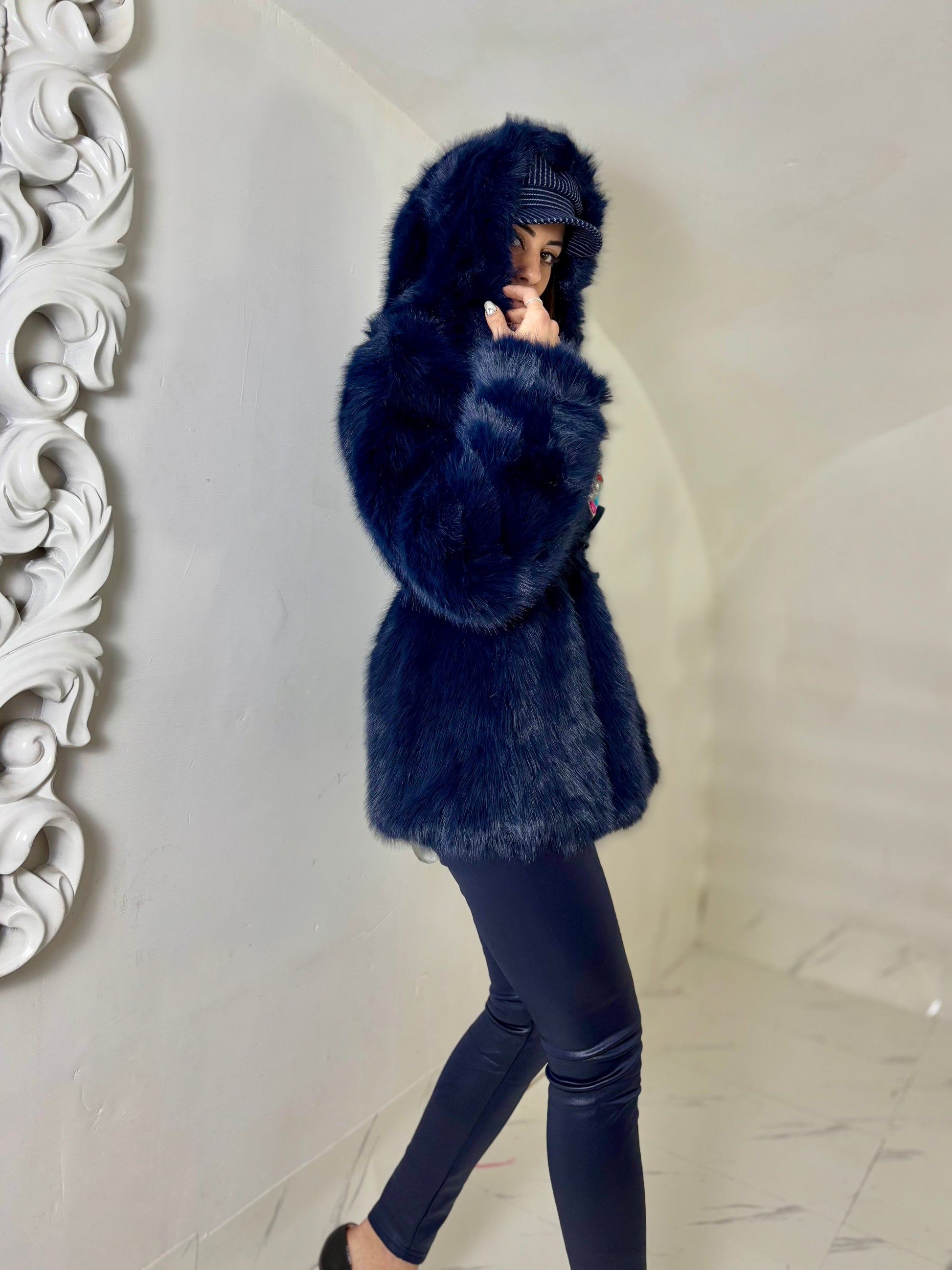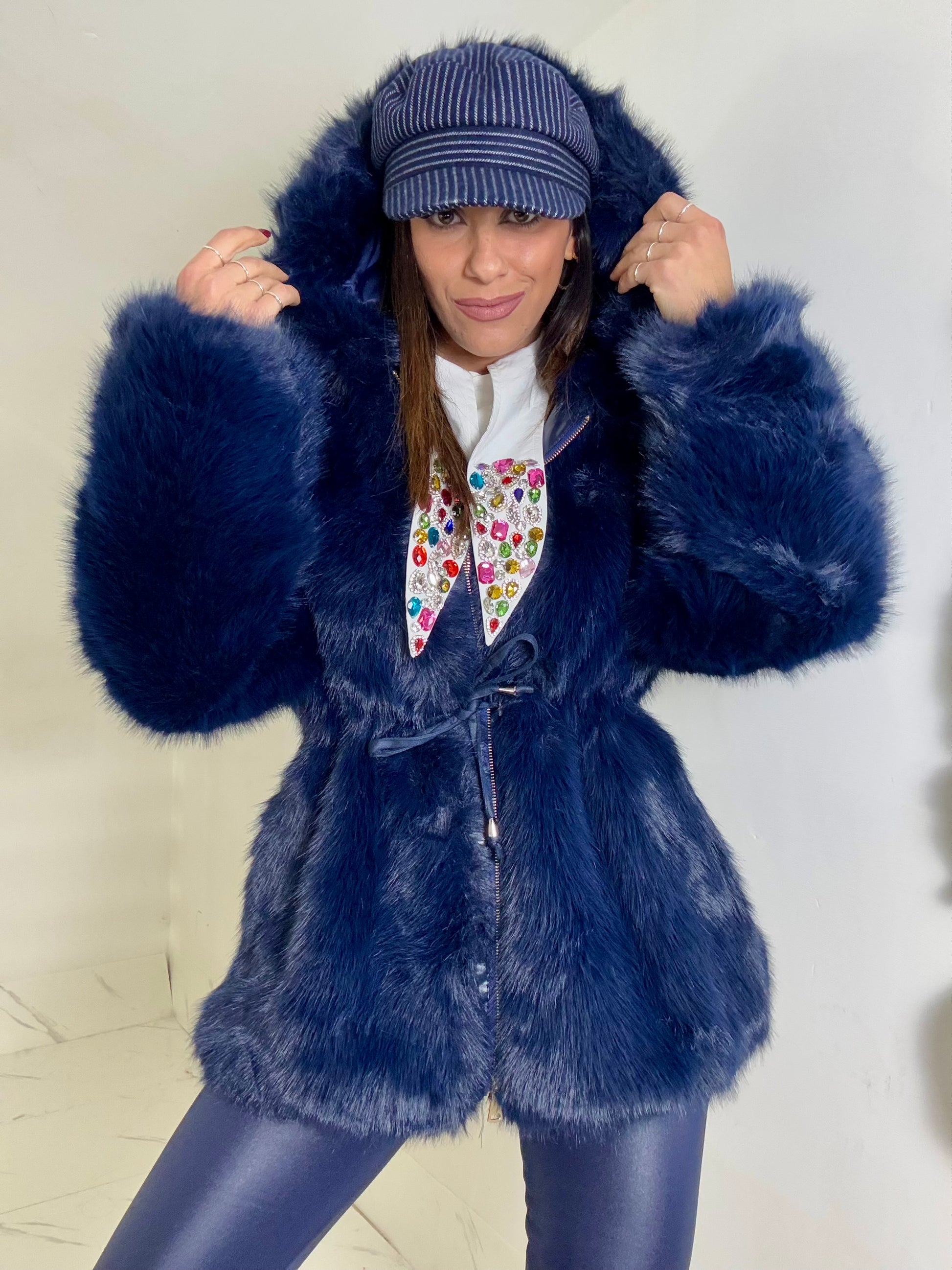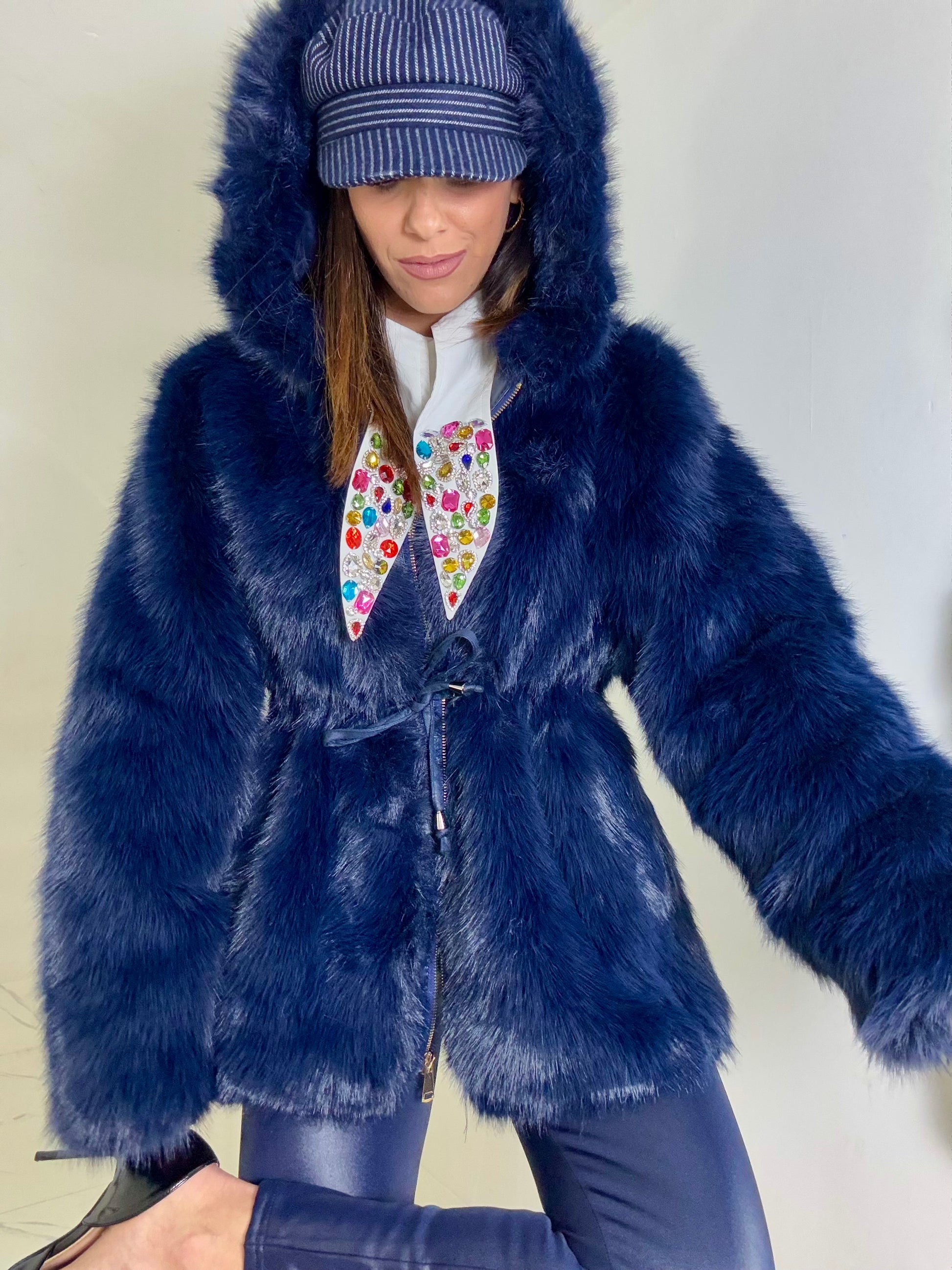 Eco FUR con chiusura zip frontale e laccetti in vita maxi cappuccio veste fino ad una 44