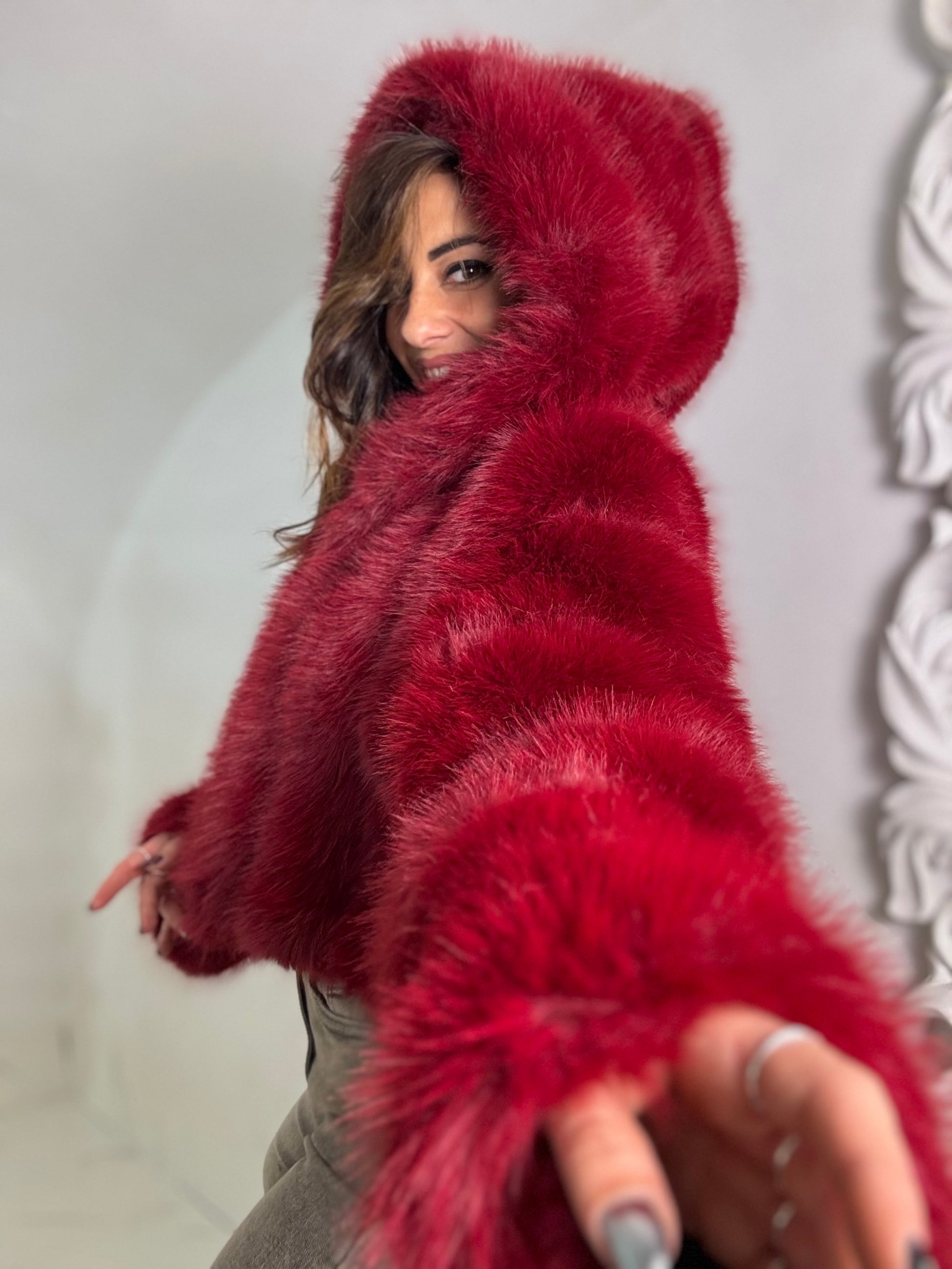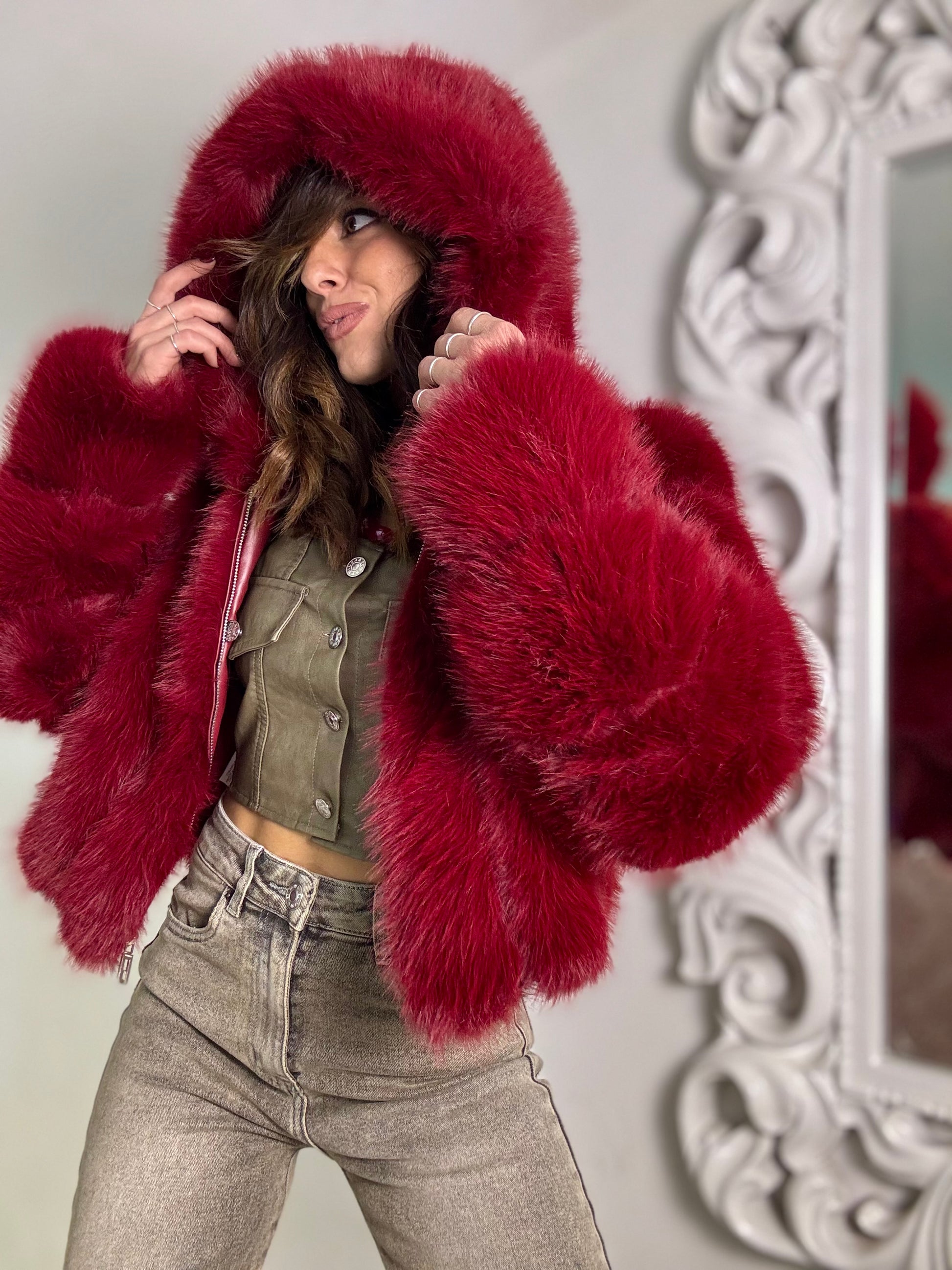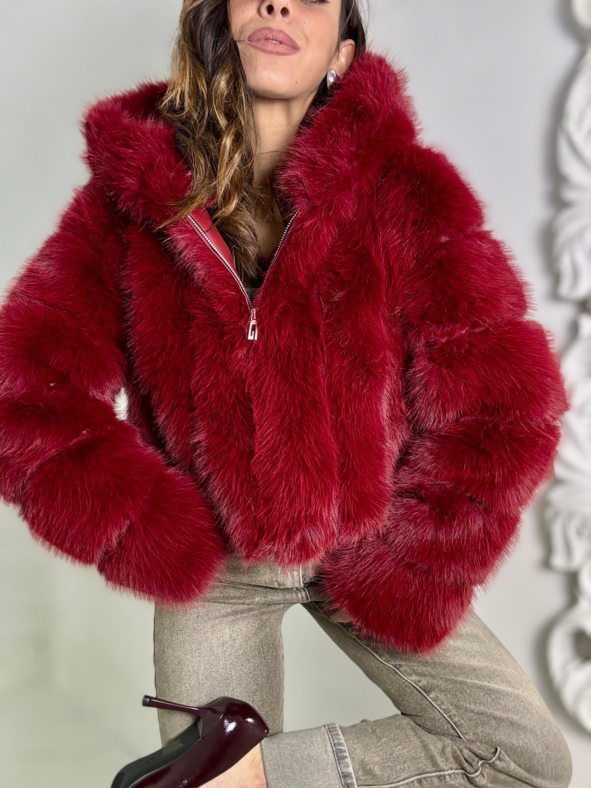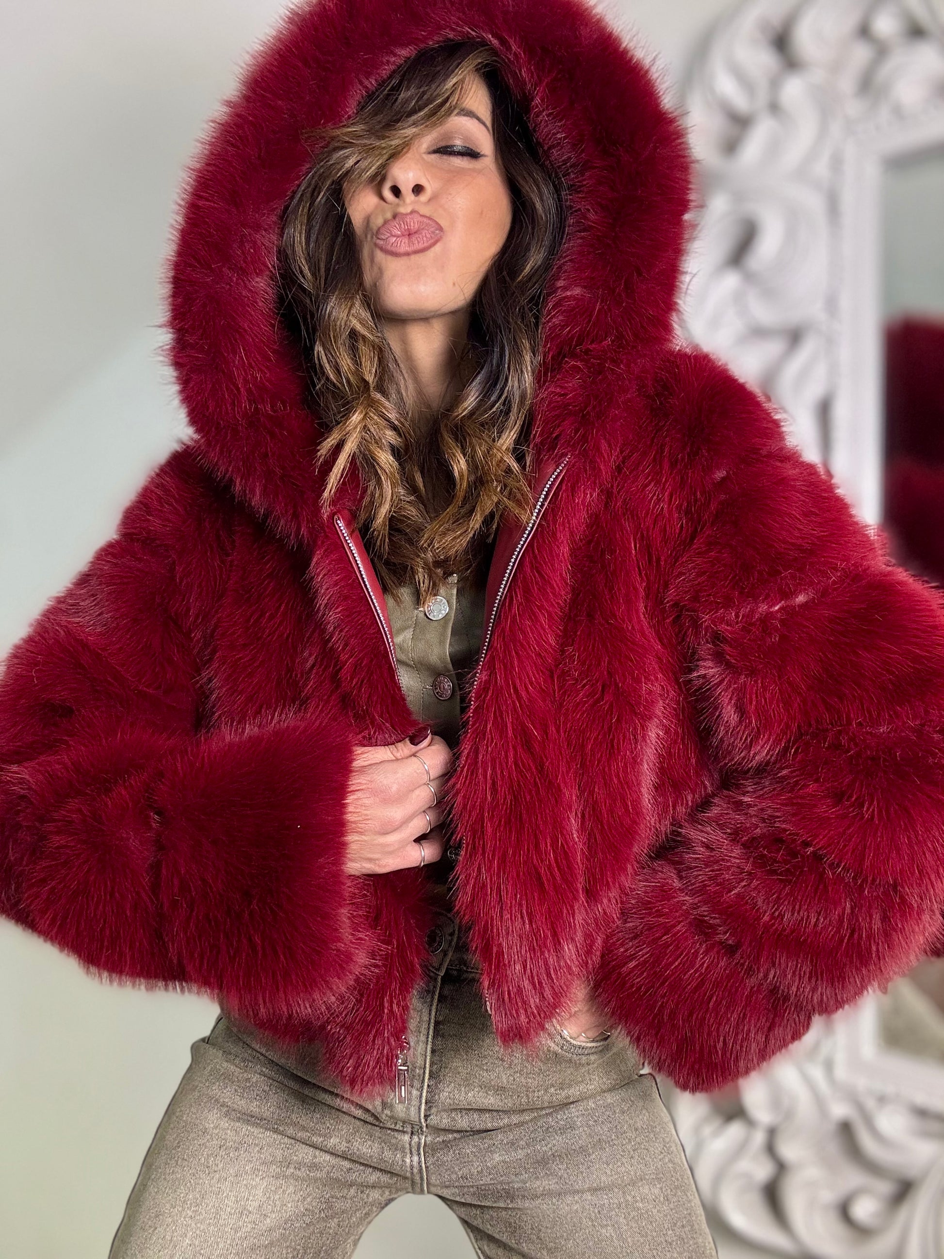 FUR bordó con zip frontale e maxi cappuccio veste fino ad una 44