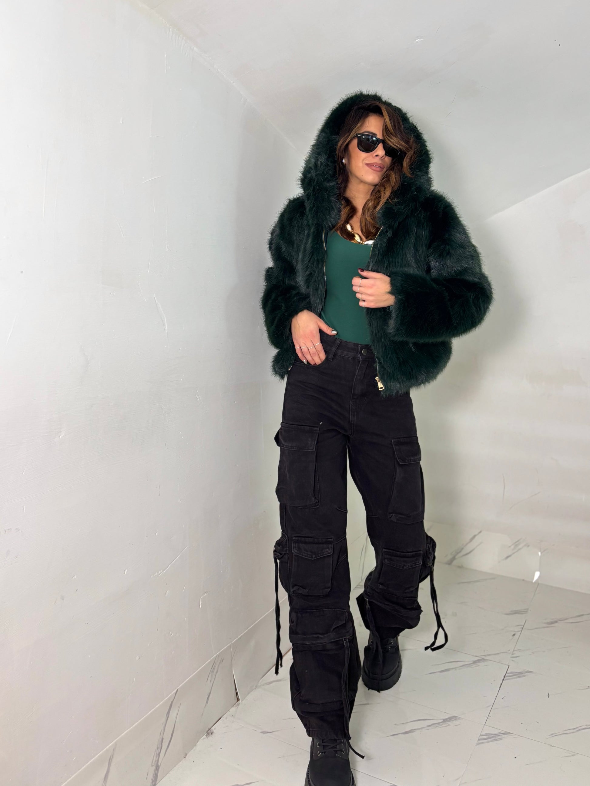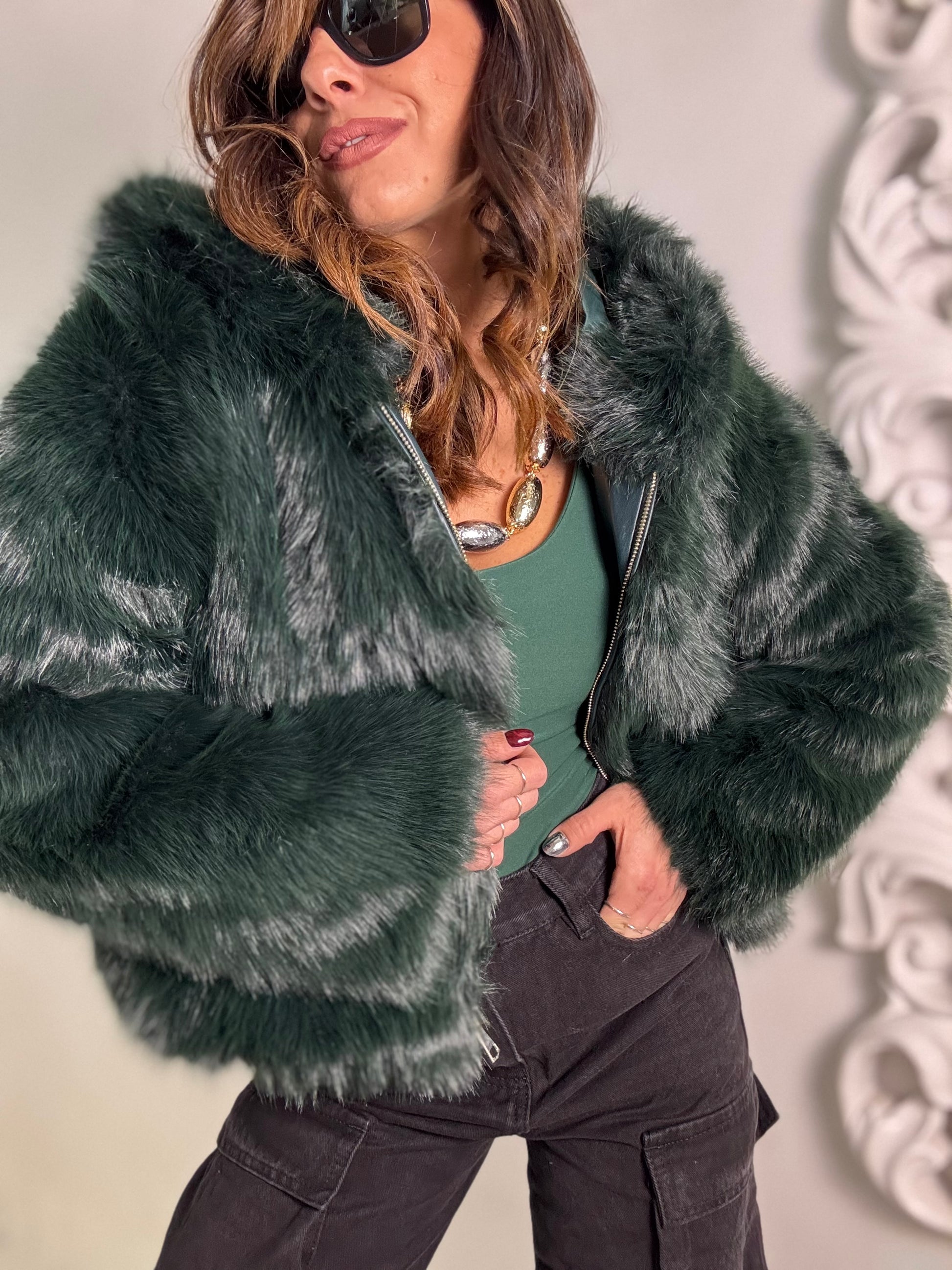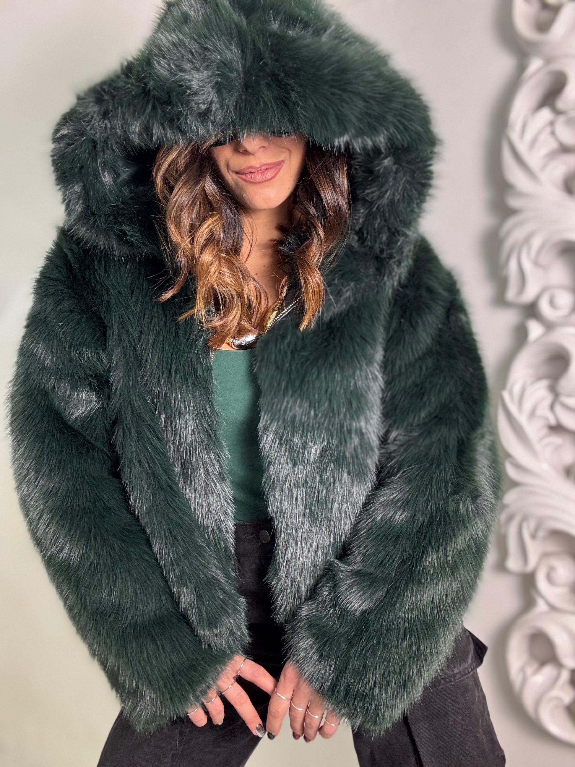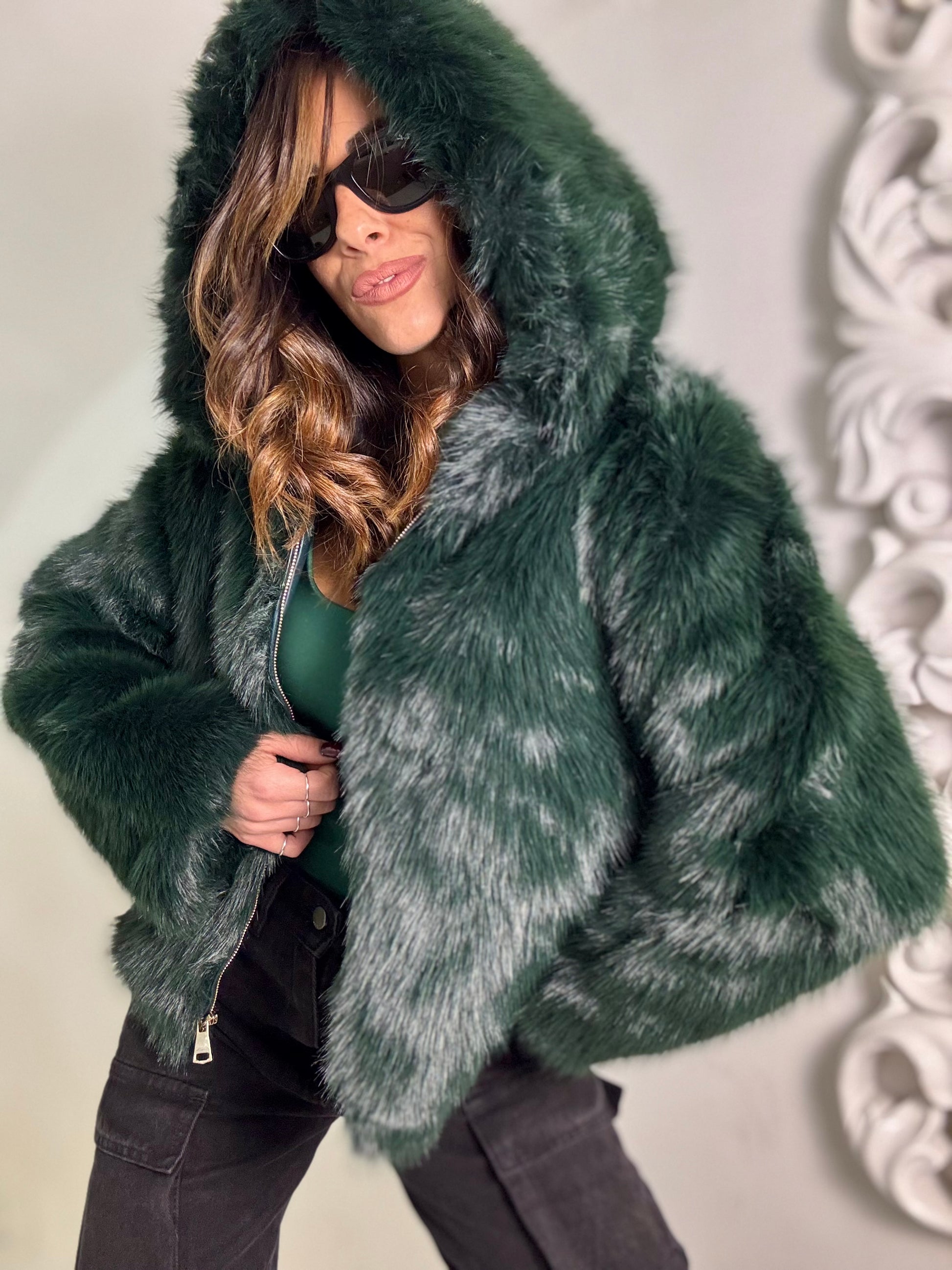 Giubbino eco pelliccia foderato all’interno con zip frontale e maxi cappuccio, veste fino ad una 46