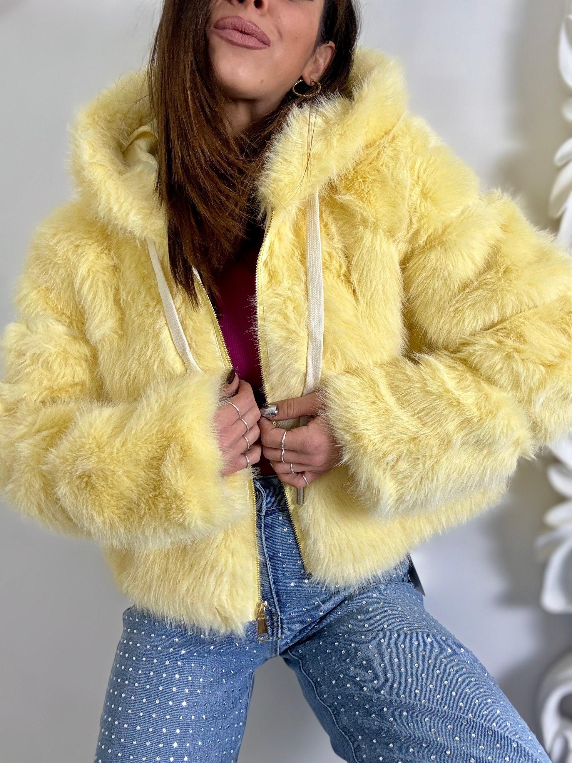 Eco fur taglio più corto cappuccio e laccetti chiusura zip frontale veste fino ad una 44