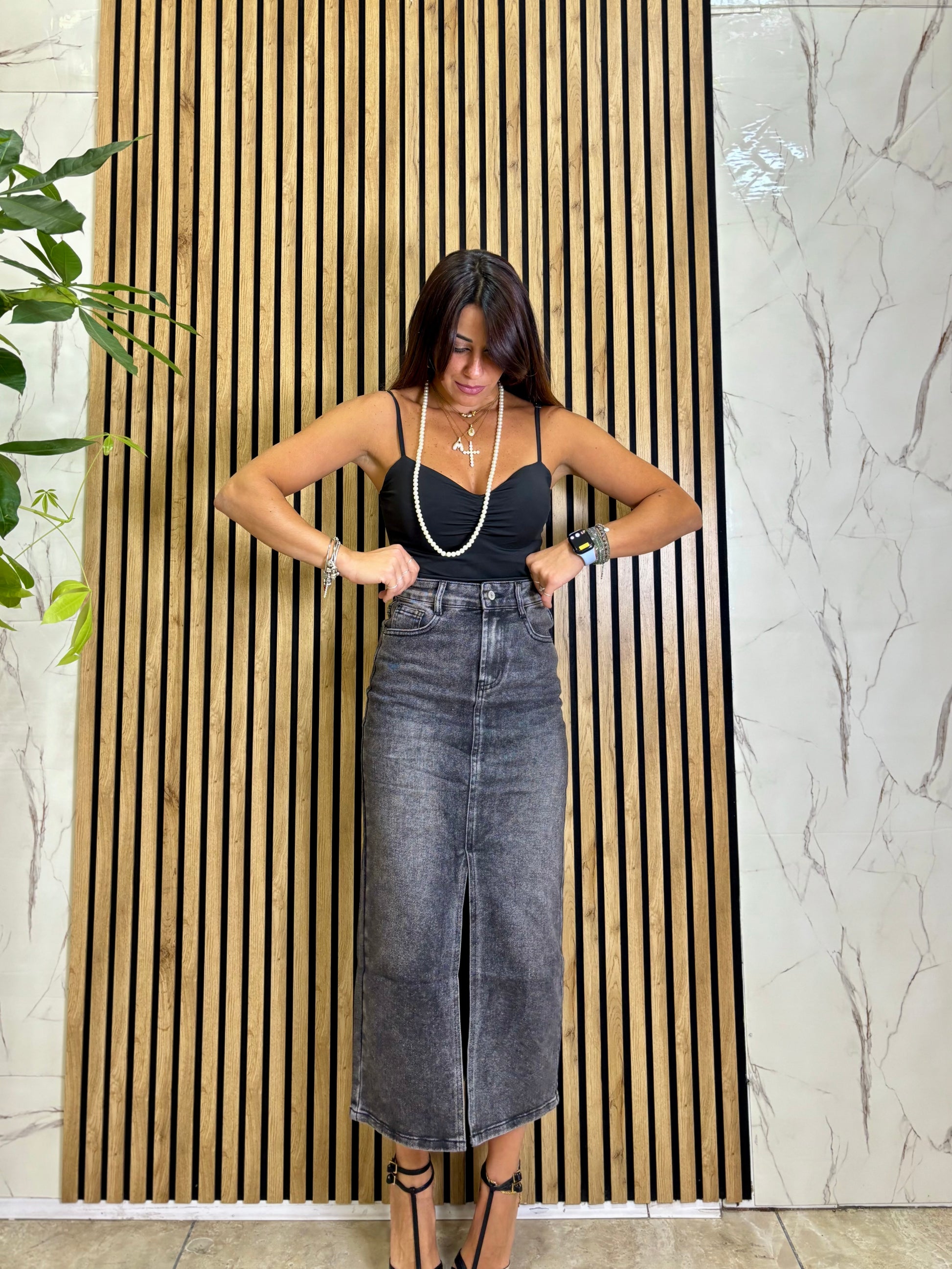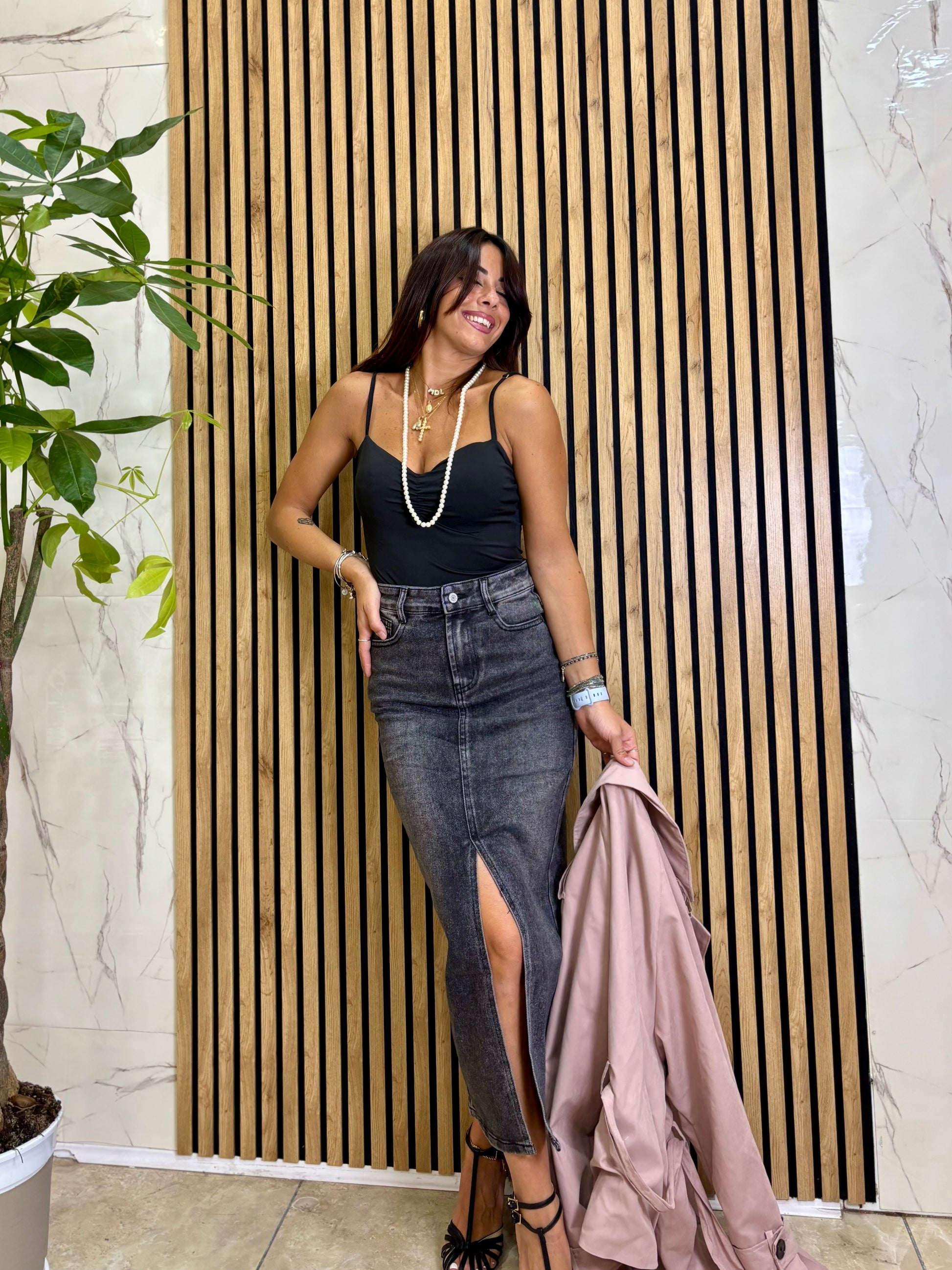 Gonna lunga di jeans vita alta con spacco frontale tessuto elastico