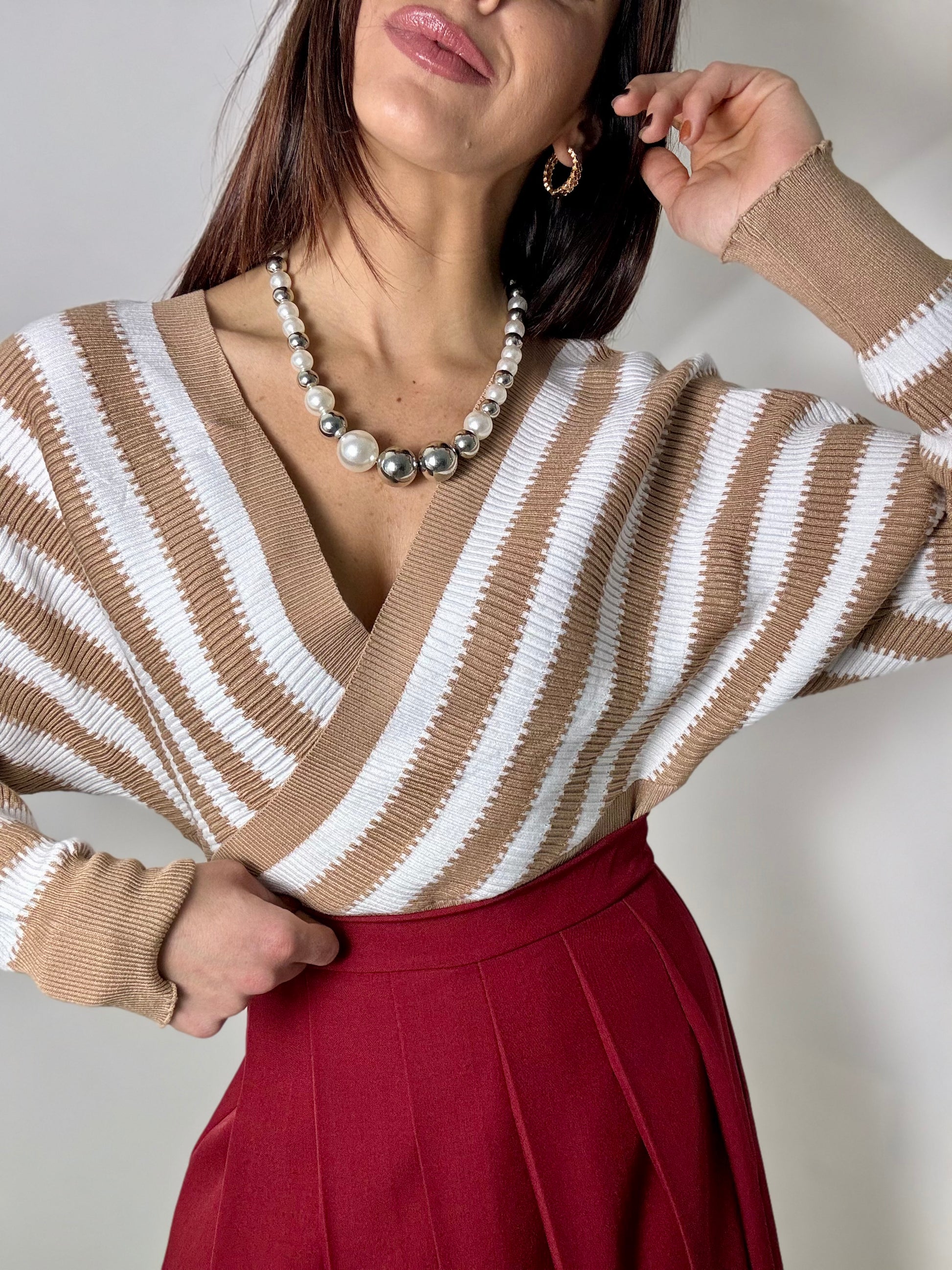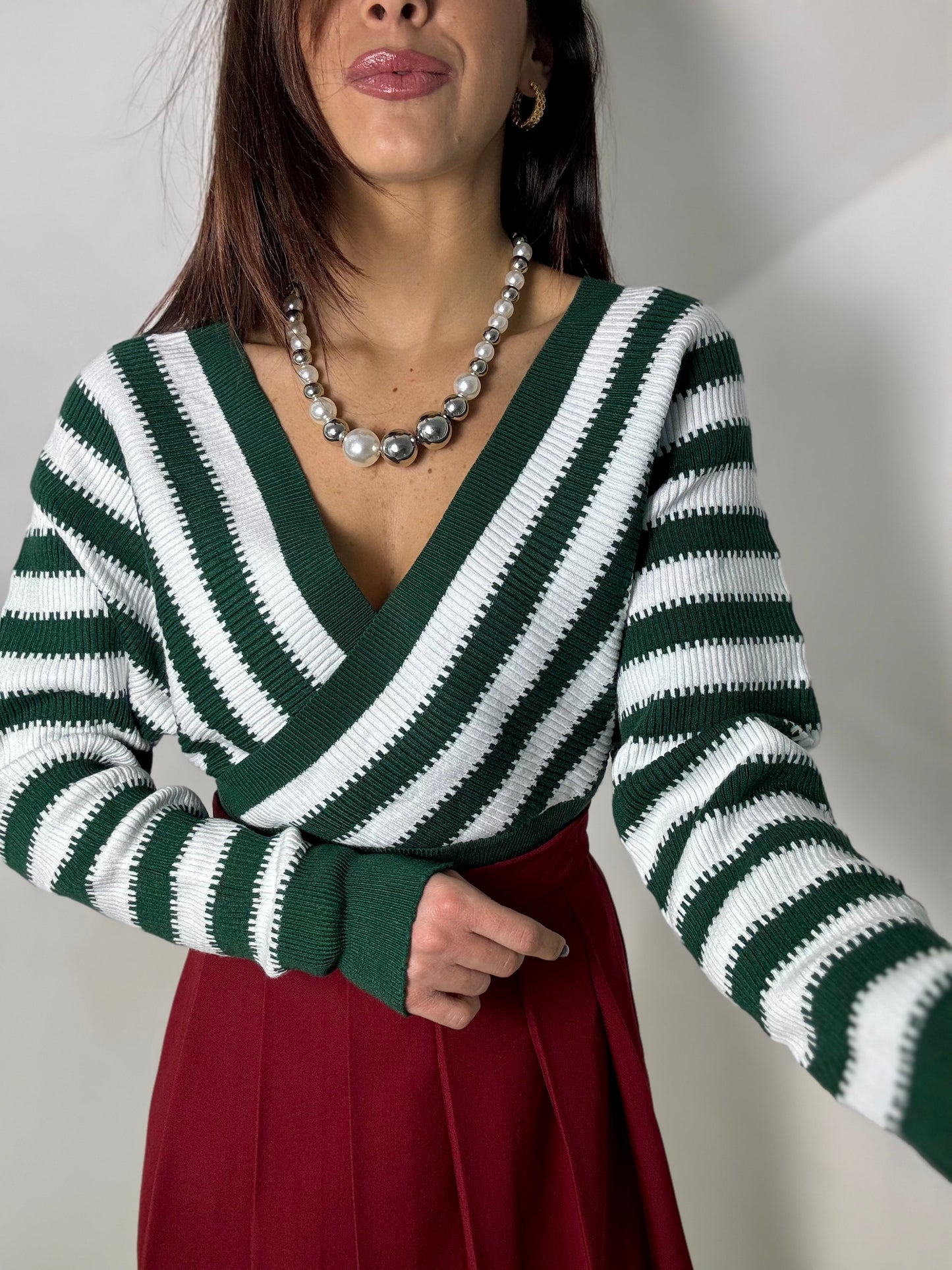 Maglia incrociata, effetto scollo barca con dettaglio sul retro, lunghezza regolare, fantasia, strisce, veste fino ad una 46