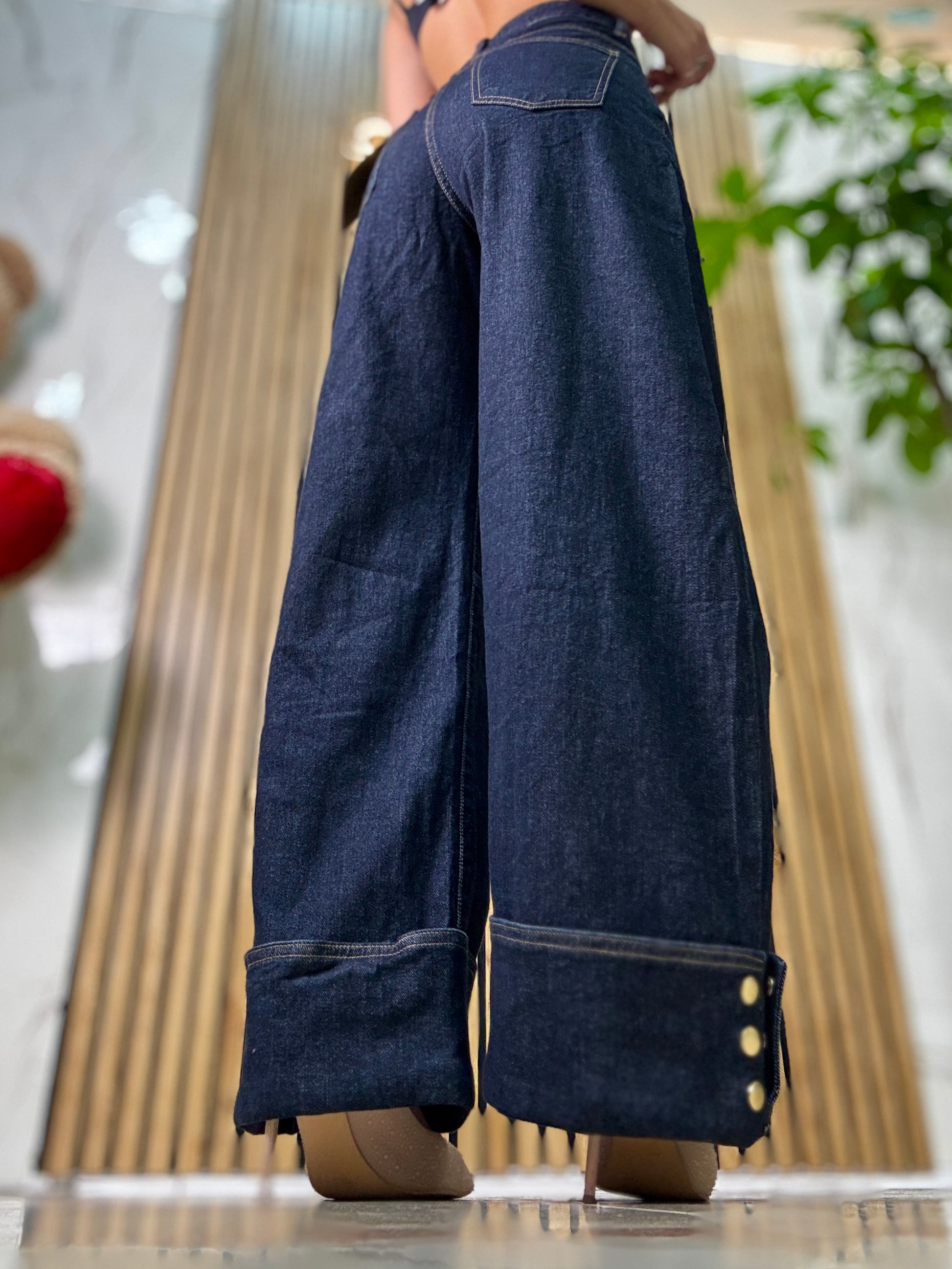 Jeans vita alta lavaggio zero maxi piegone sul fondo con dettagli bottoni oro tessuto semi rigido