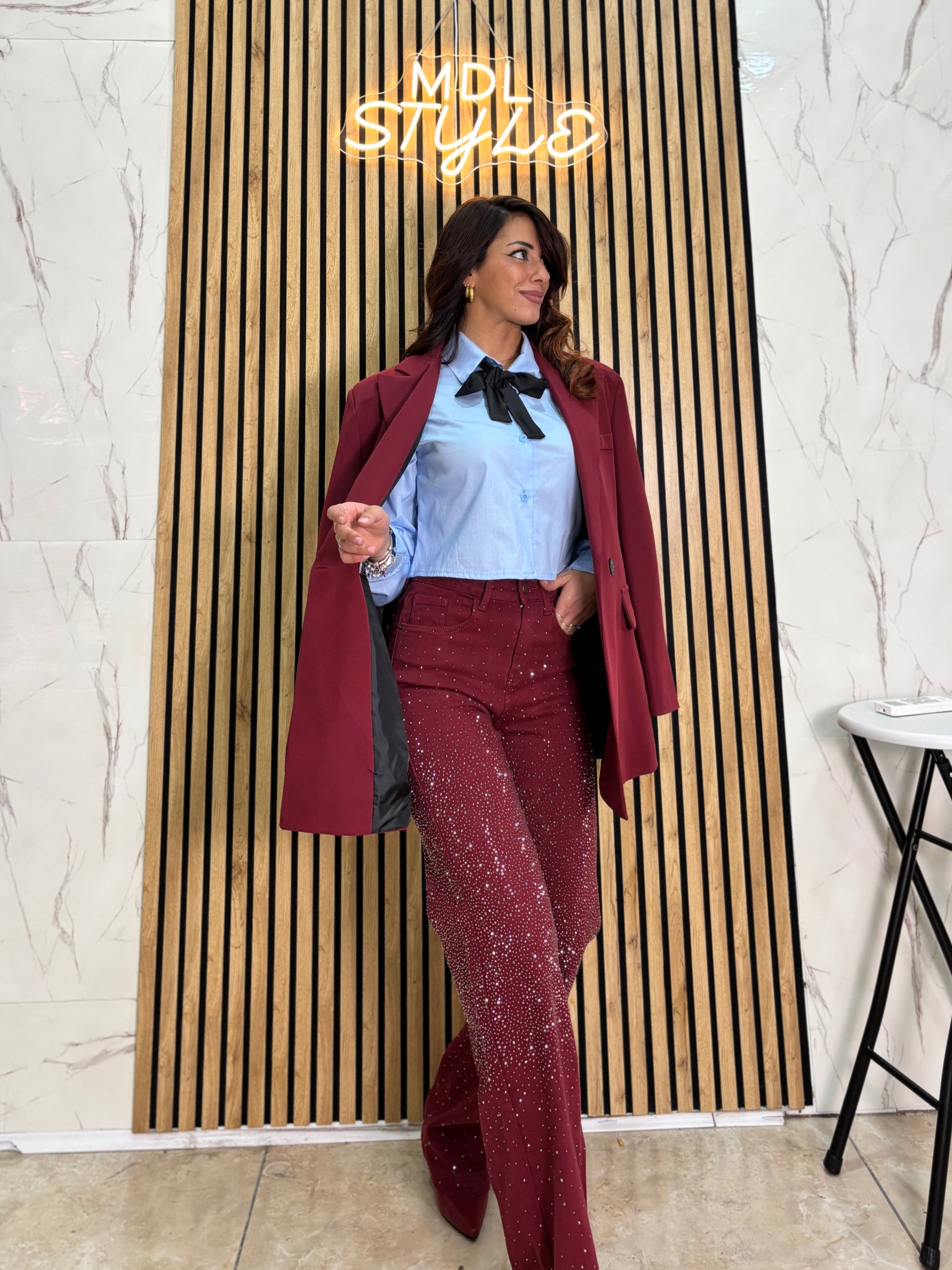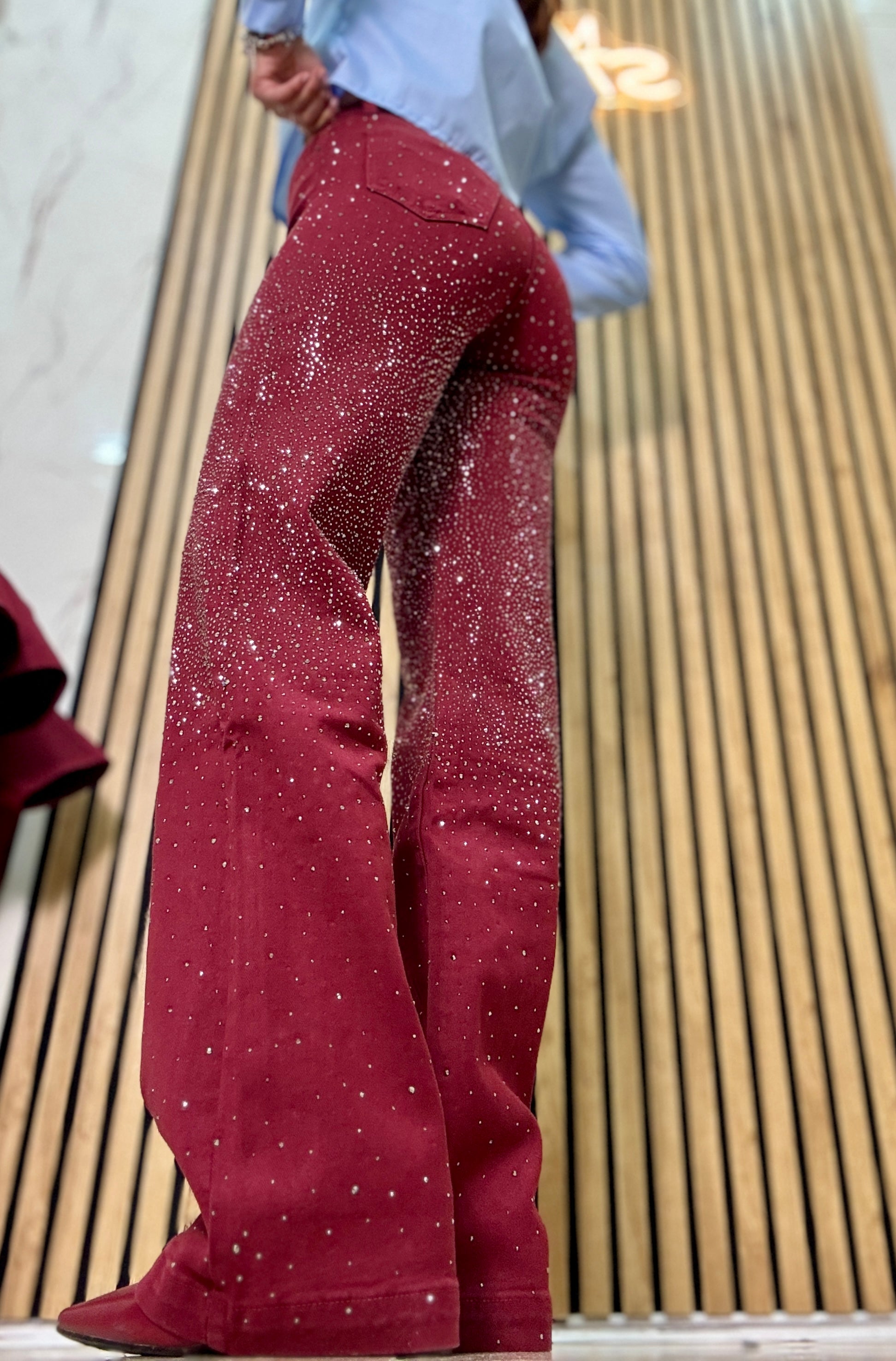 Jeans bordeaux luccicoso vita altissima vestibilità top