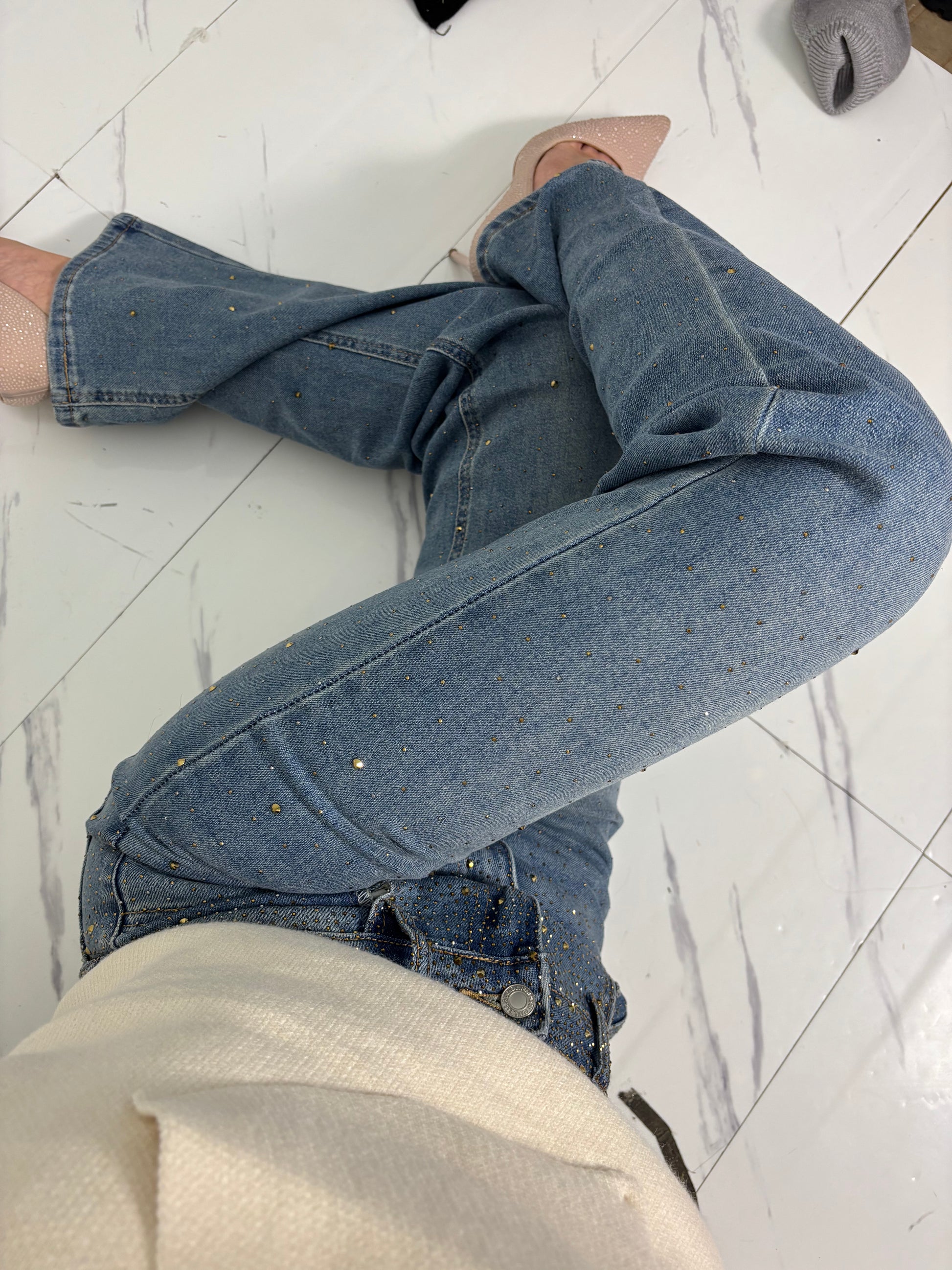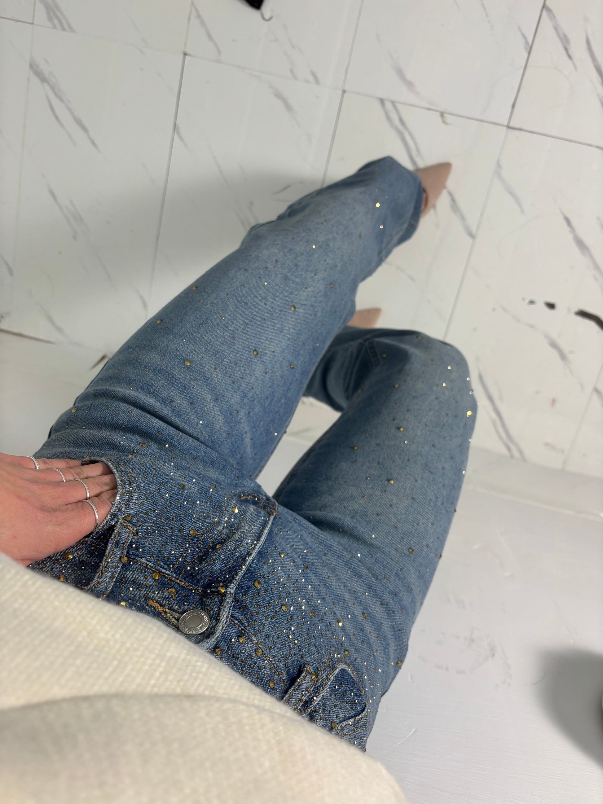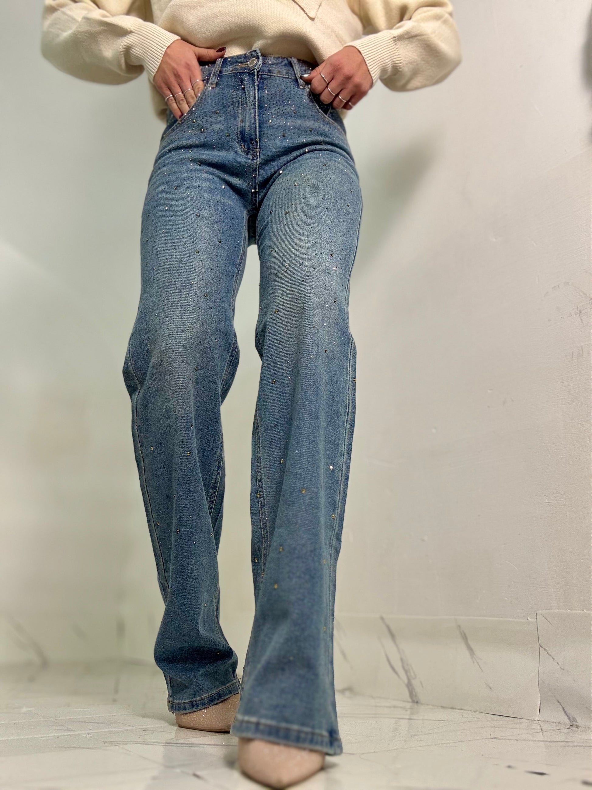 Jeans completamente strassato vita medio alta tessuto semi elastico