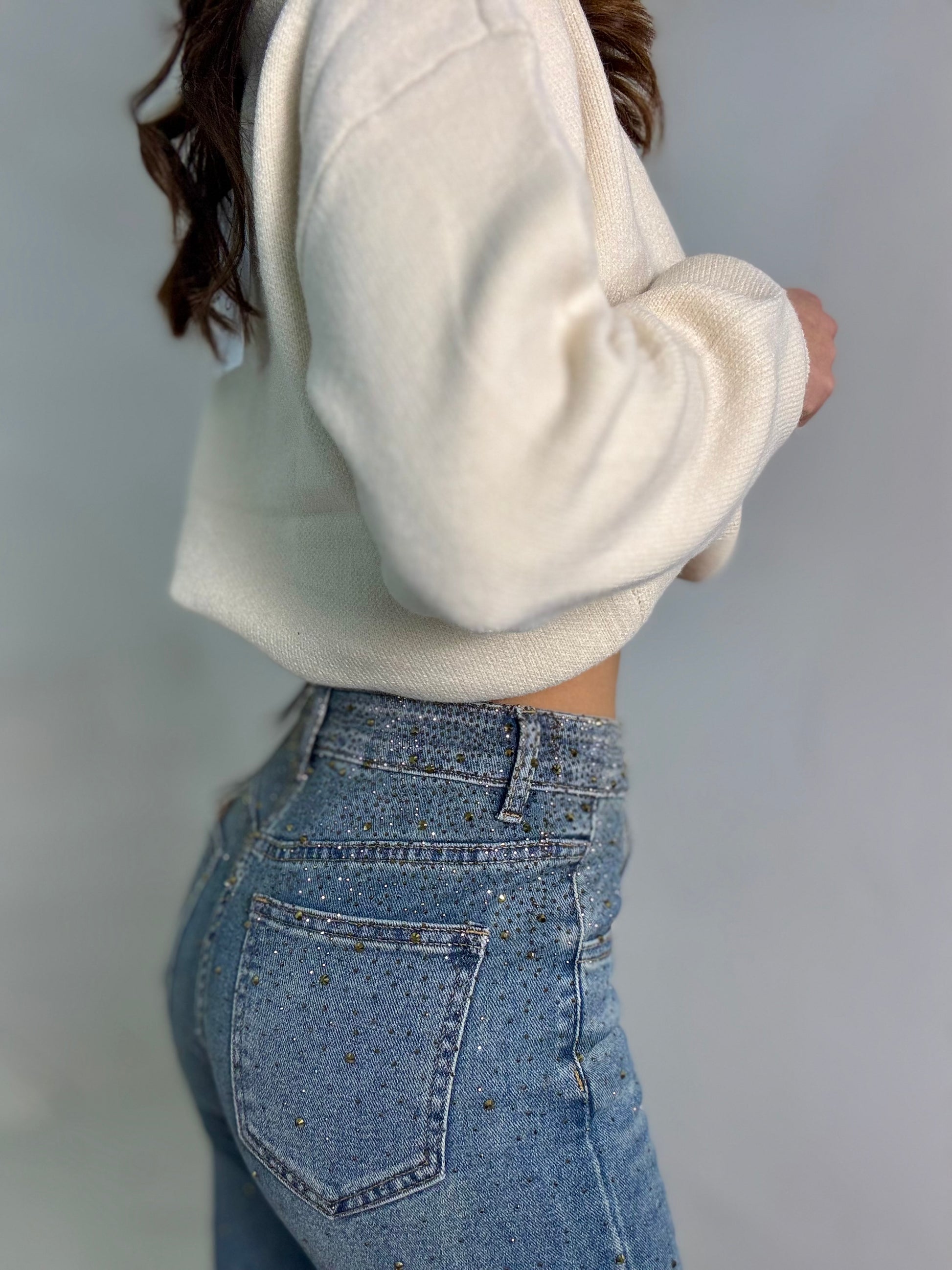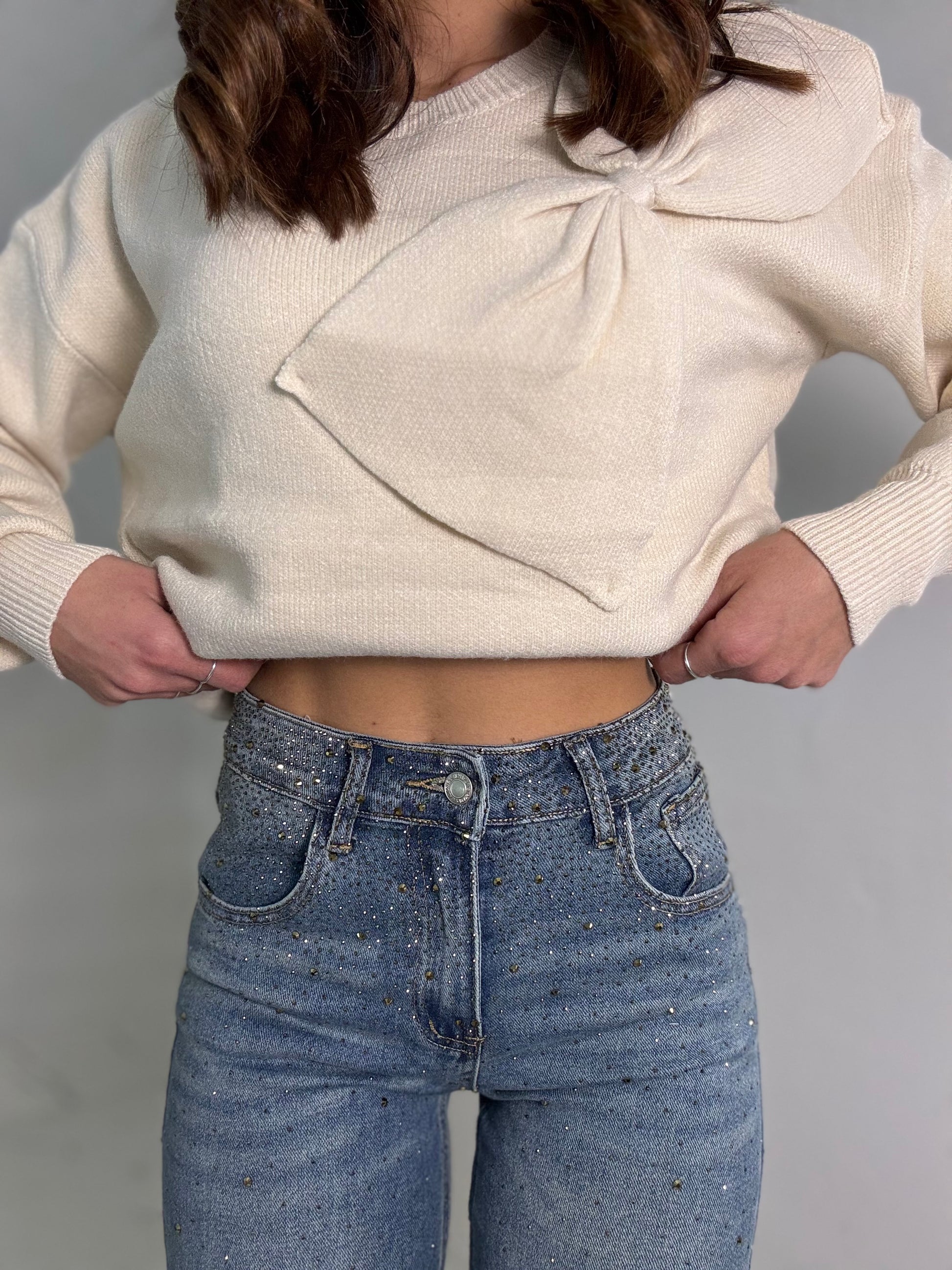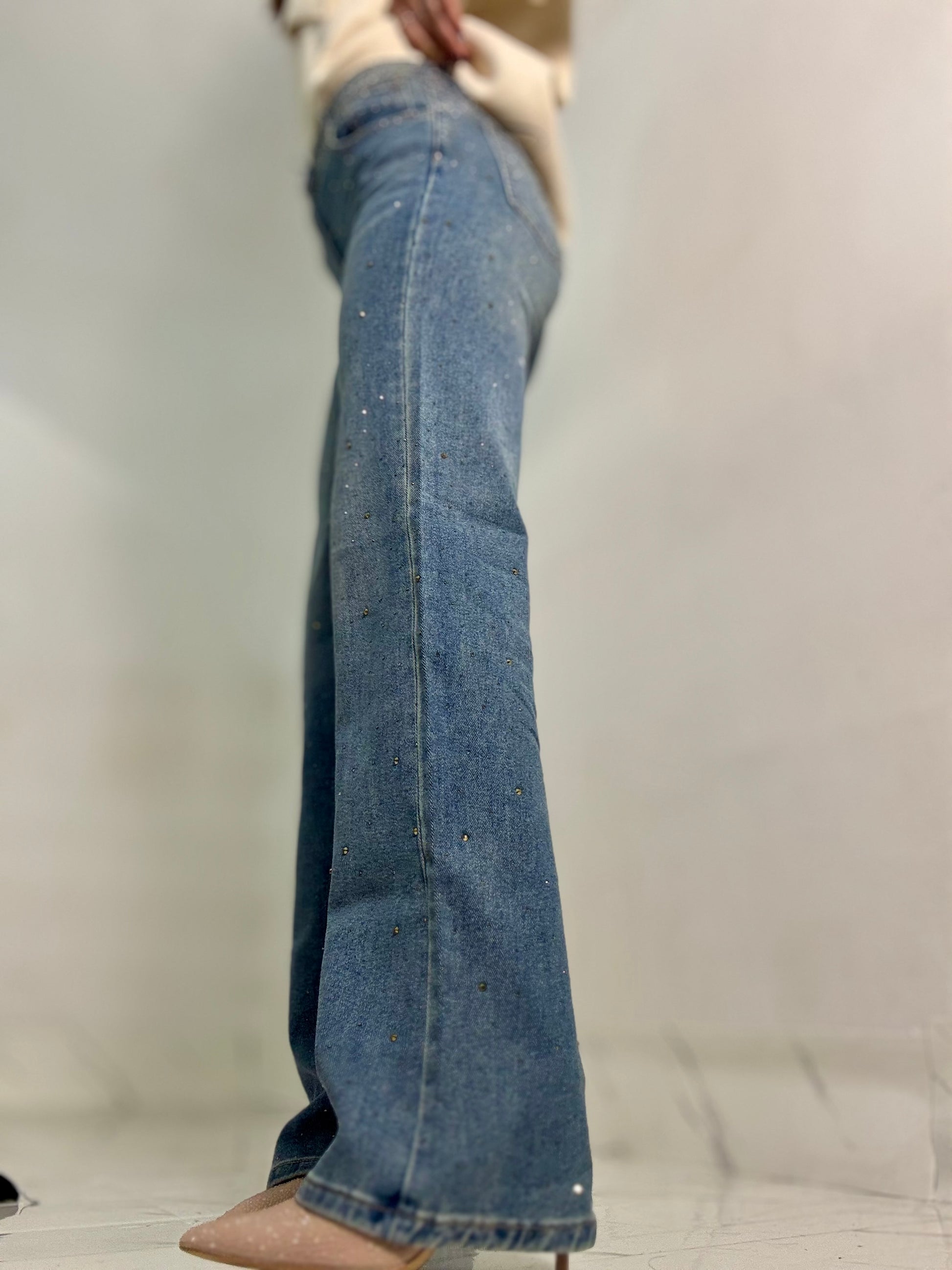 Jeans completamente strassato vita medio alta tessuto semi elastico