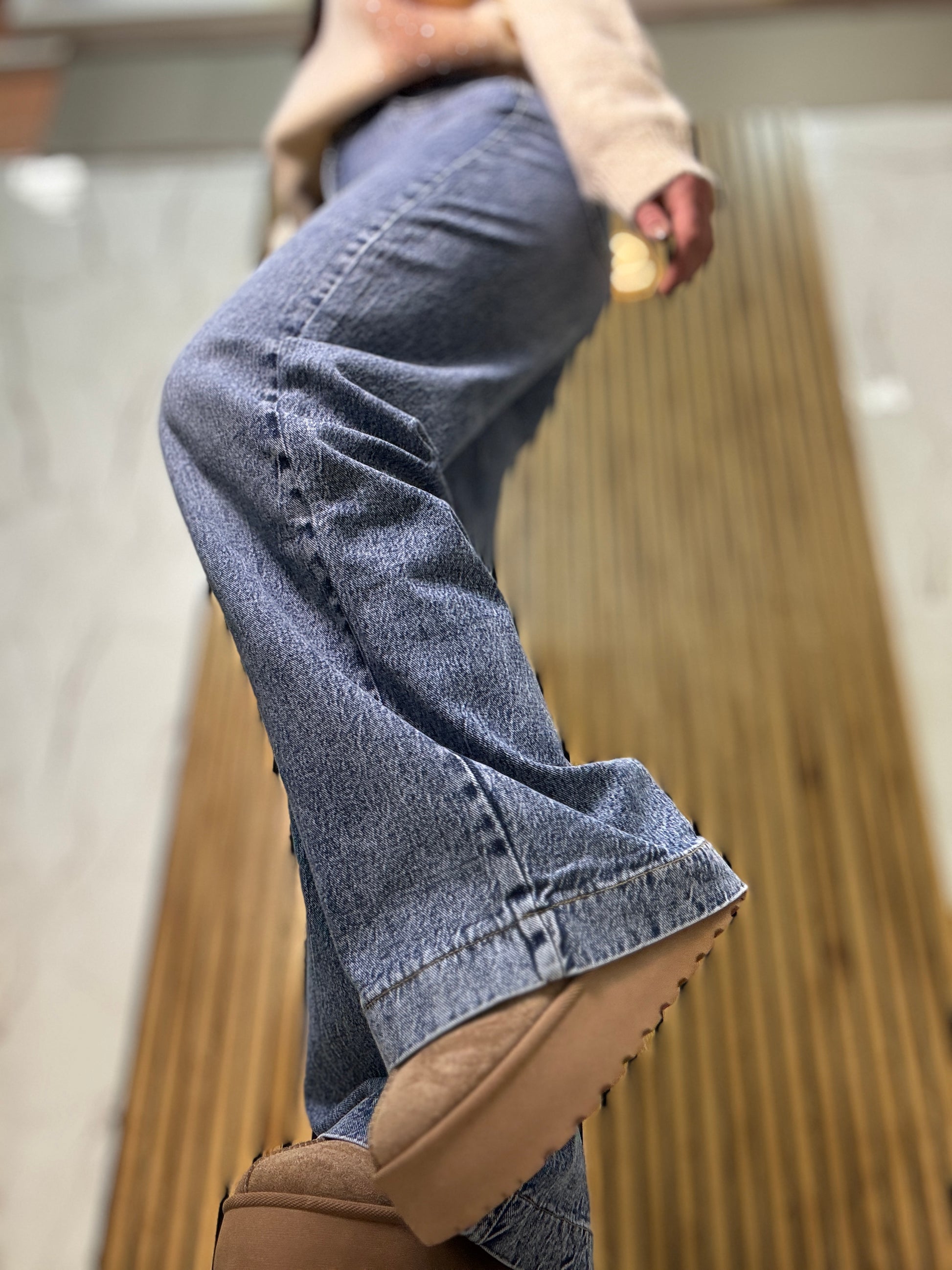 Jeans vita alta modello a palazzo con dettaglio piega cucita sul fondo