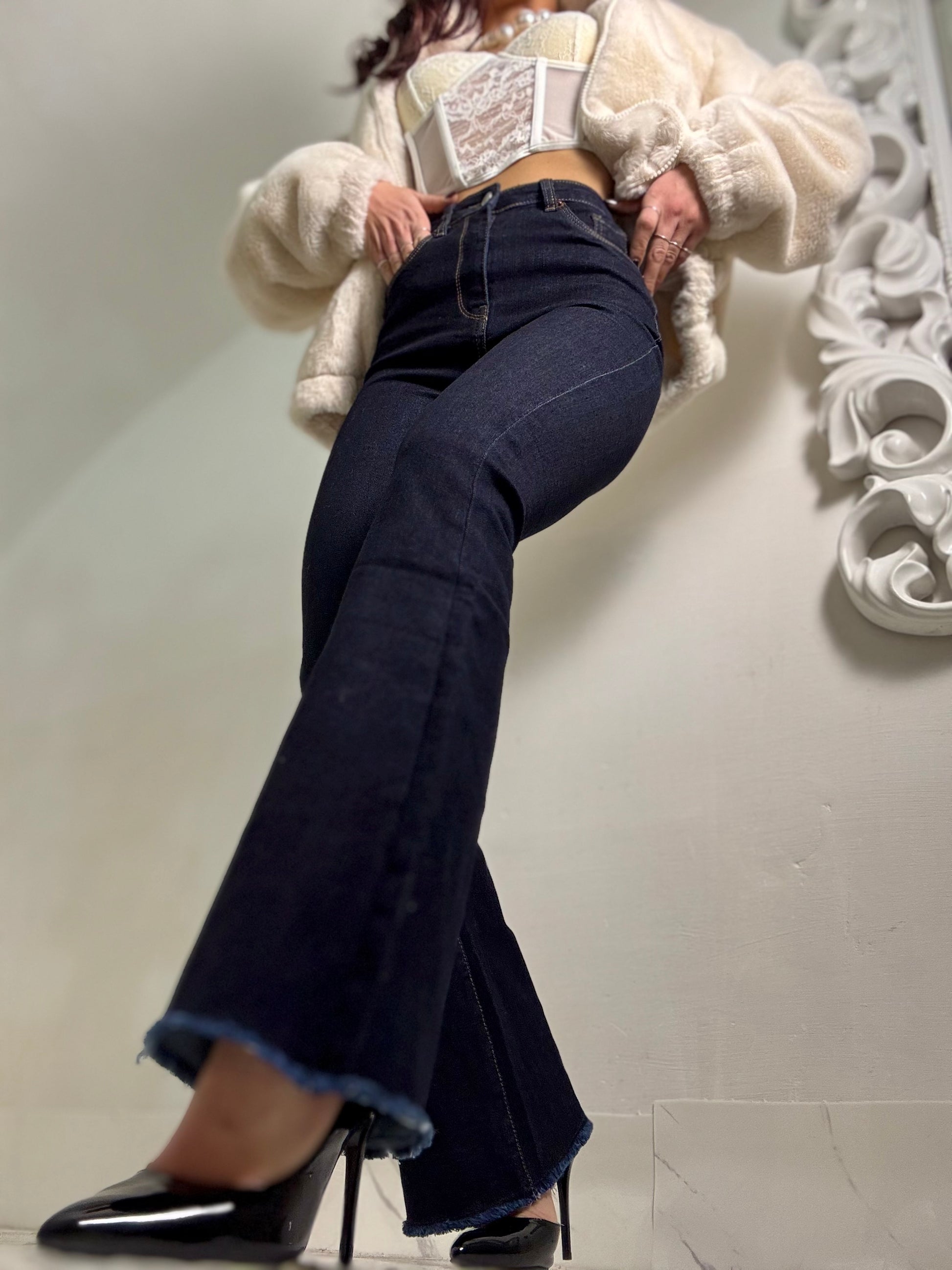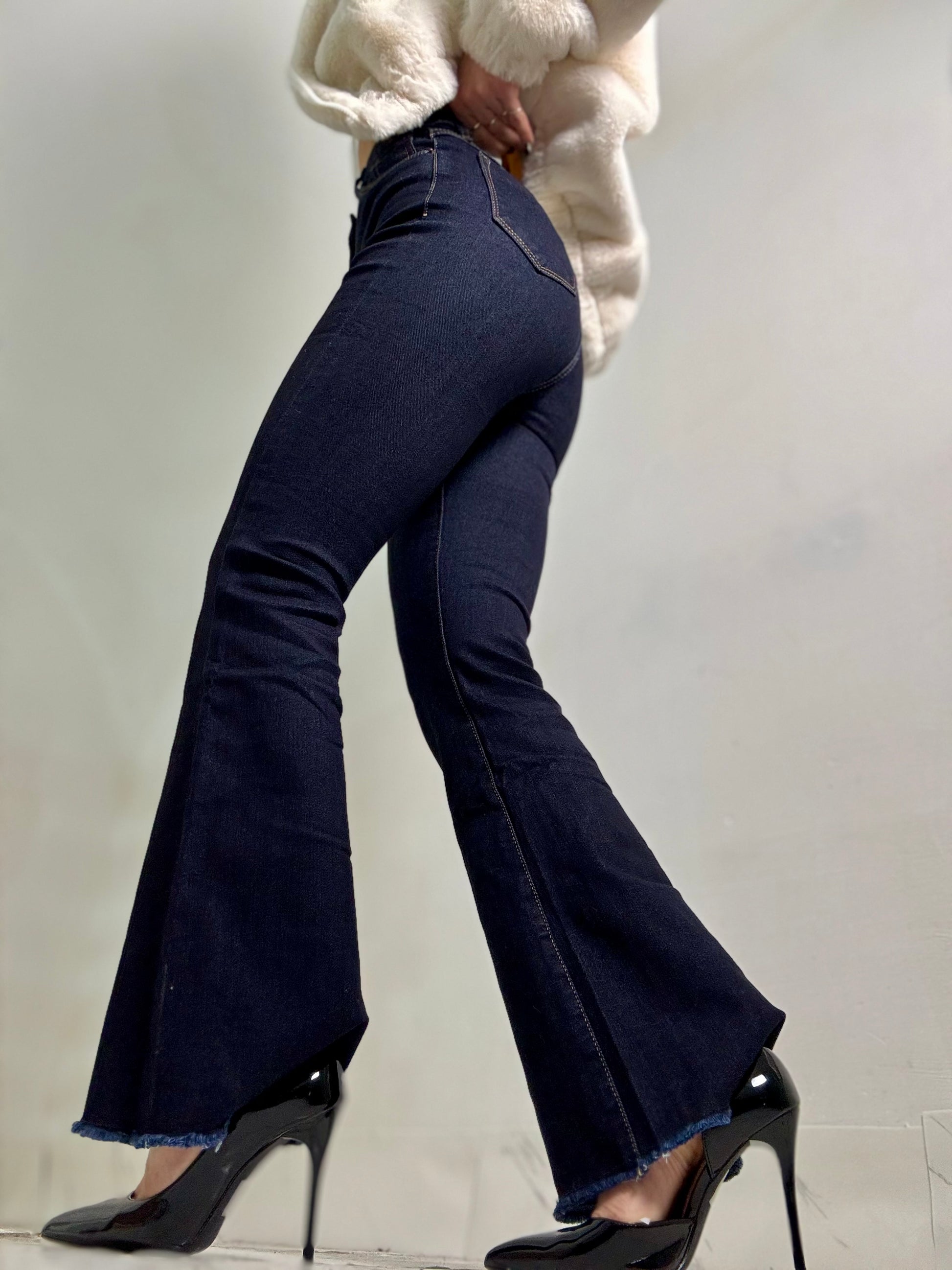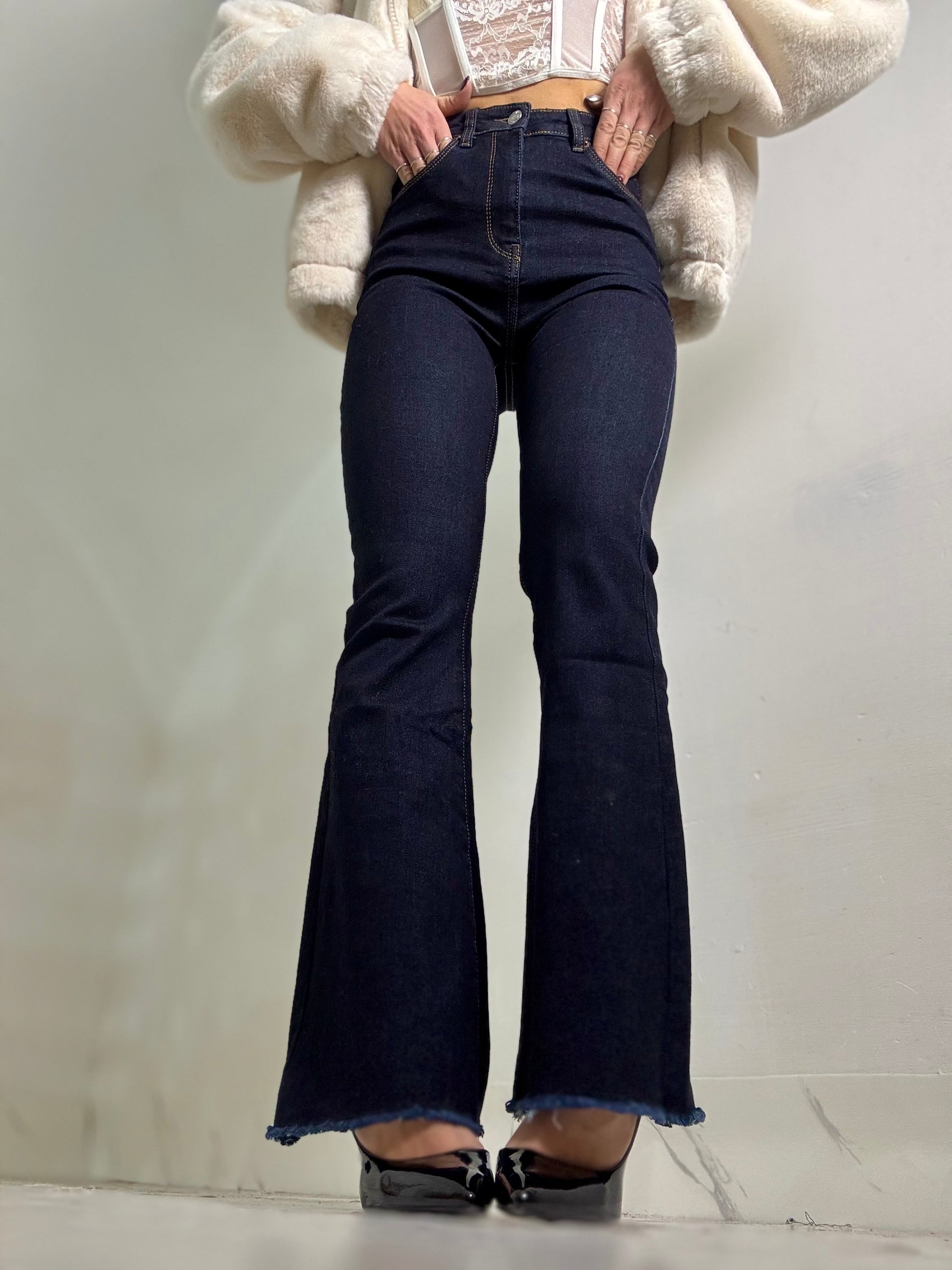 Jeans a zampa tessuto semi elastico lavaggio blu scuro vita altissima