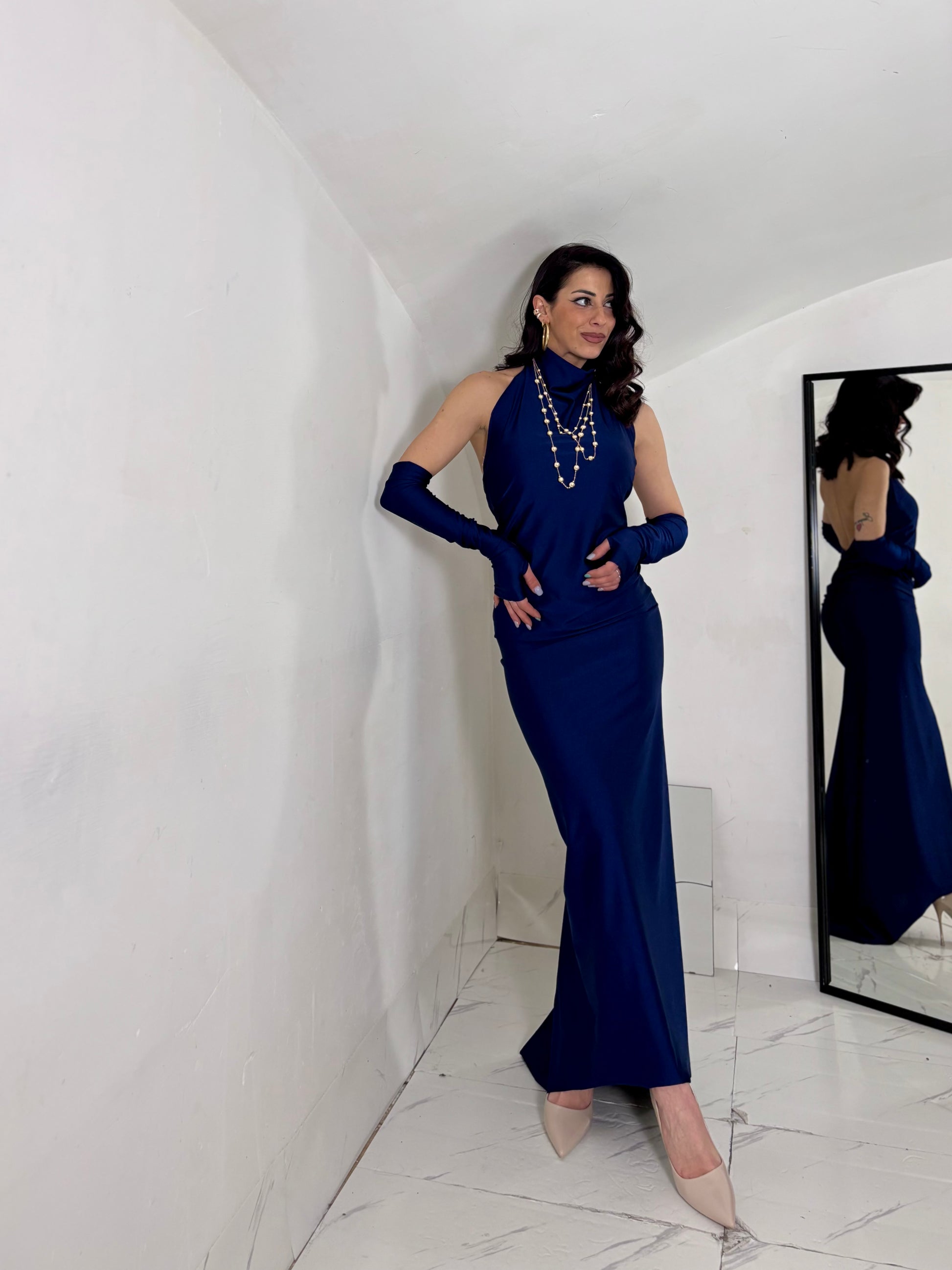 Abito lungo Lycra satinata non trasparente mezzo collo sulla parte frontale giromanica sul retro scollatura effetto Push Up, taglia unica veste fino ad una 44 46