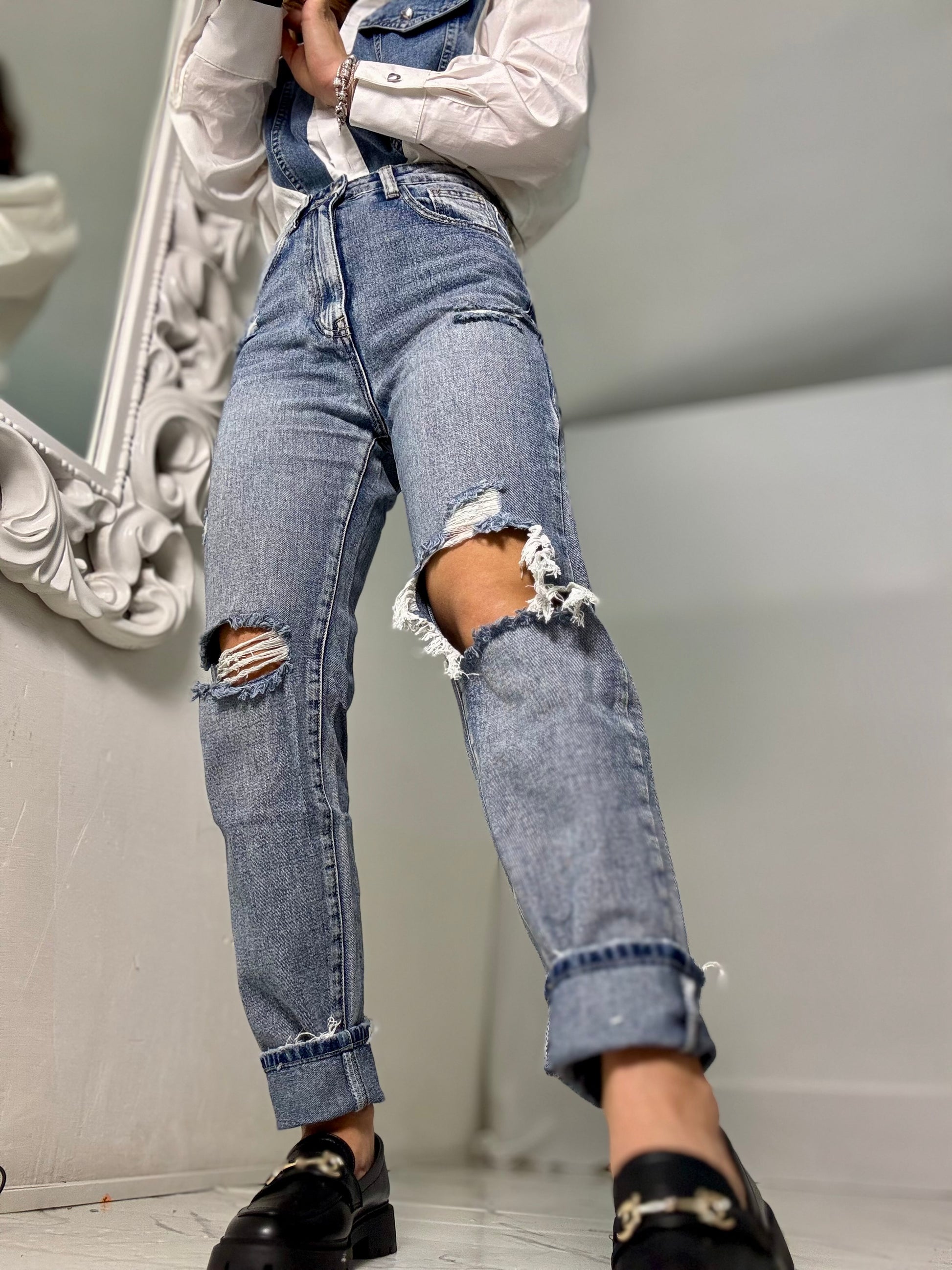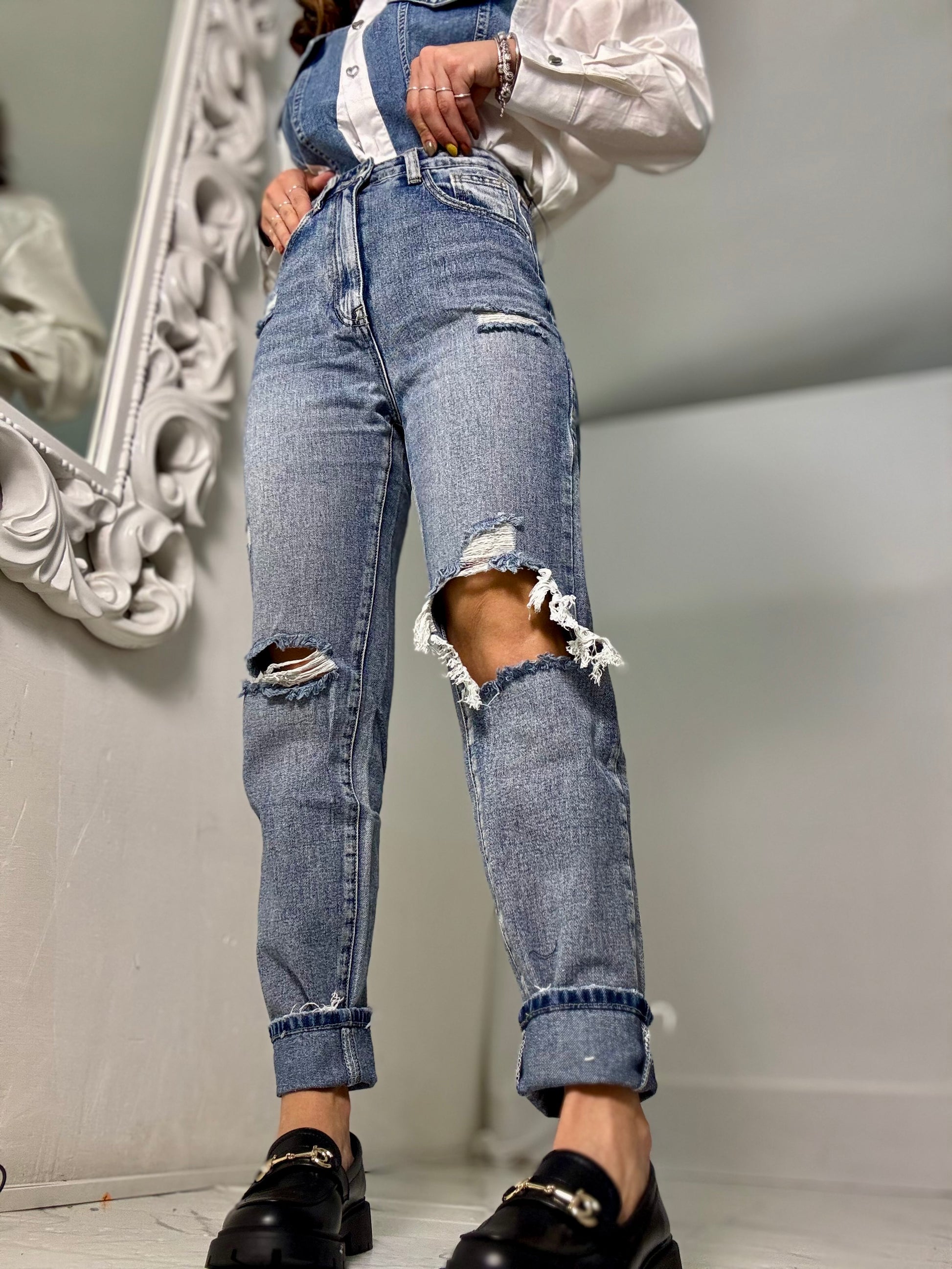 MOM FIT Vita alta che scende alla caviglia con la strappi frontali, tessuto semi elastico