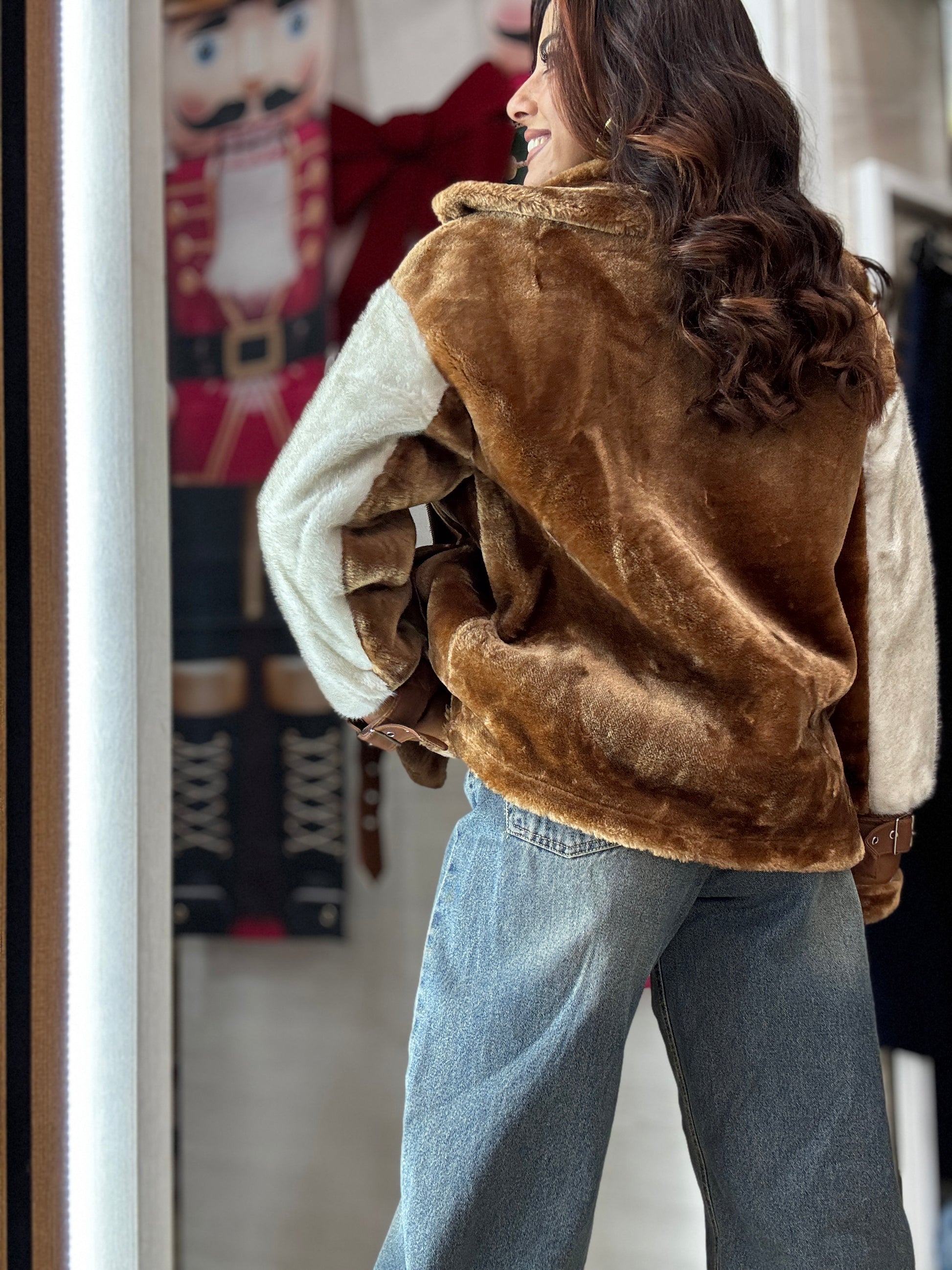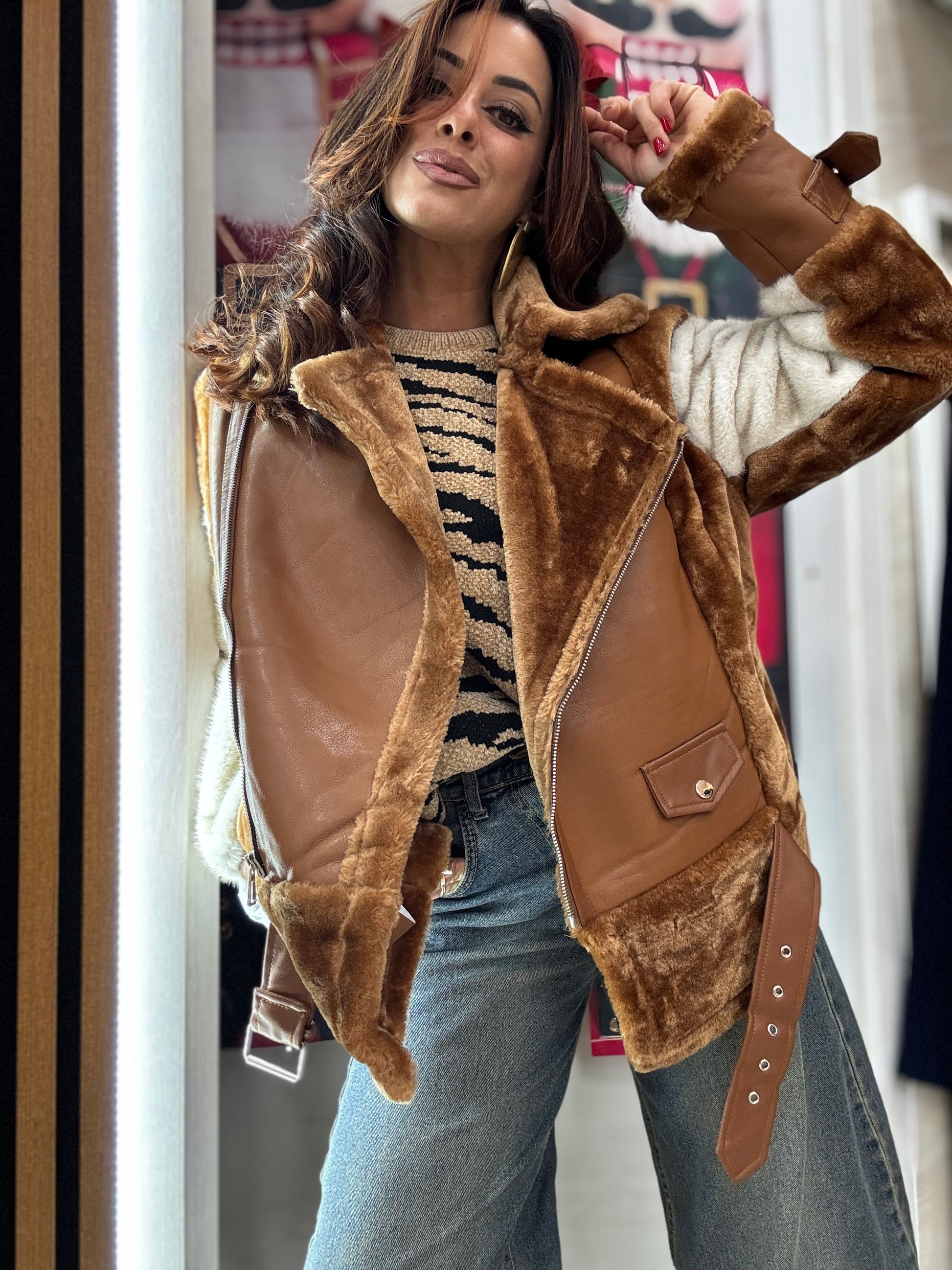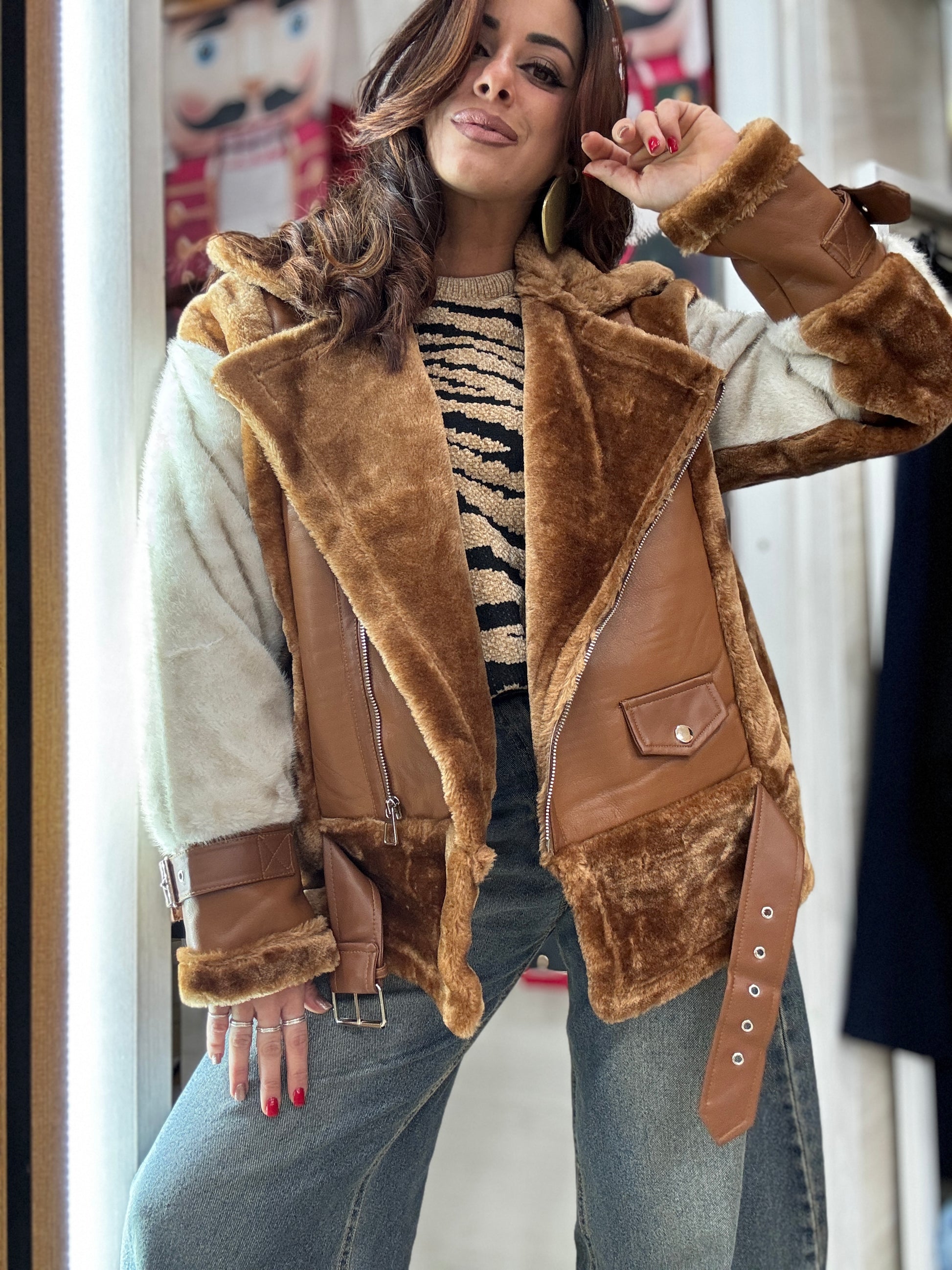 Montone eco pelliccia strutturato, bicolore, doppiopetto, taglia unica, veste fino ad una 44 46
