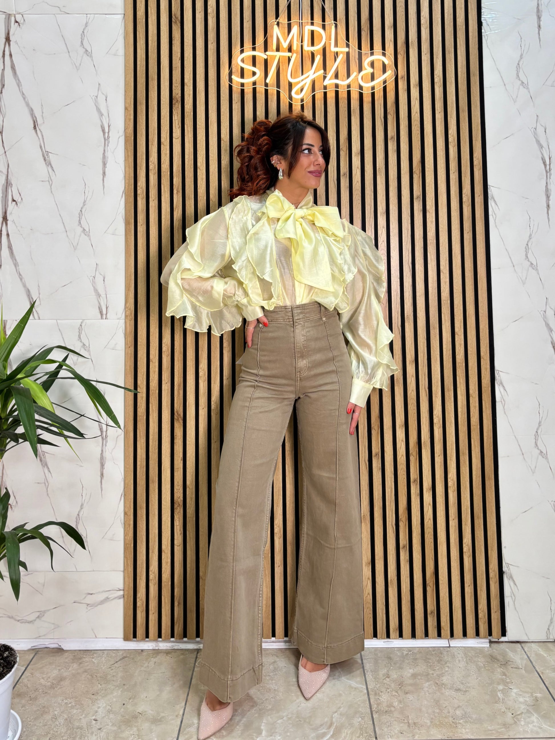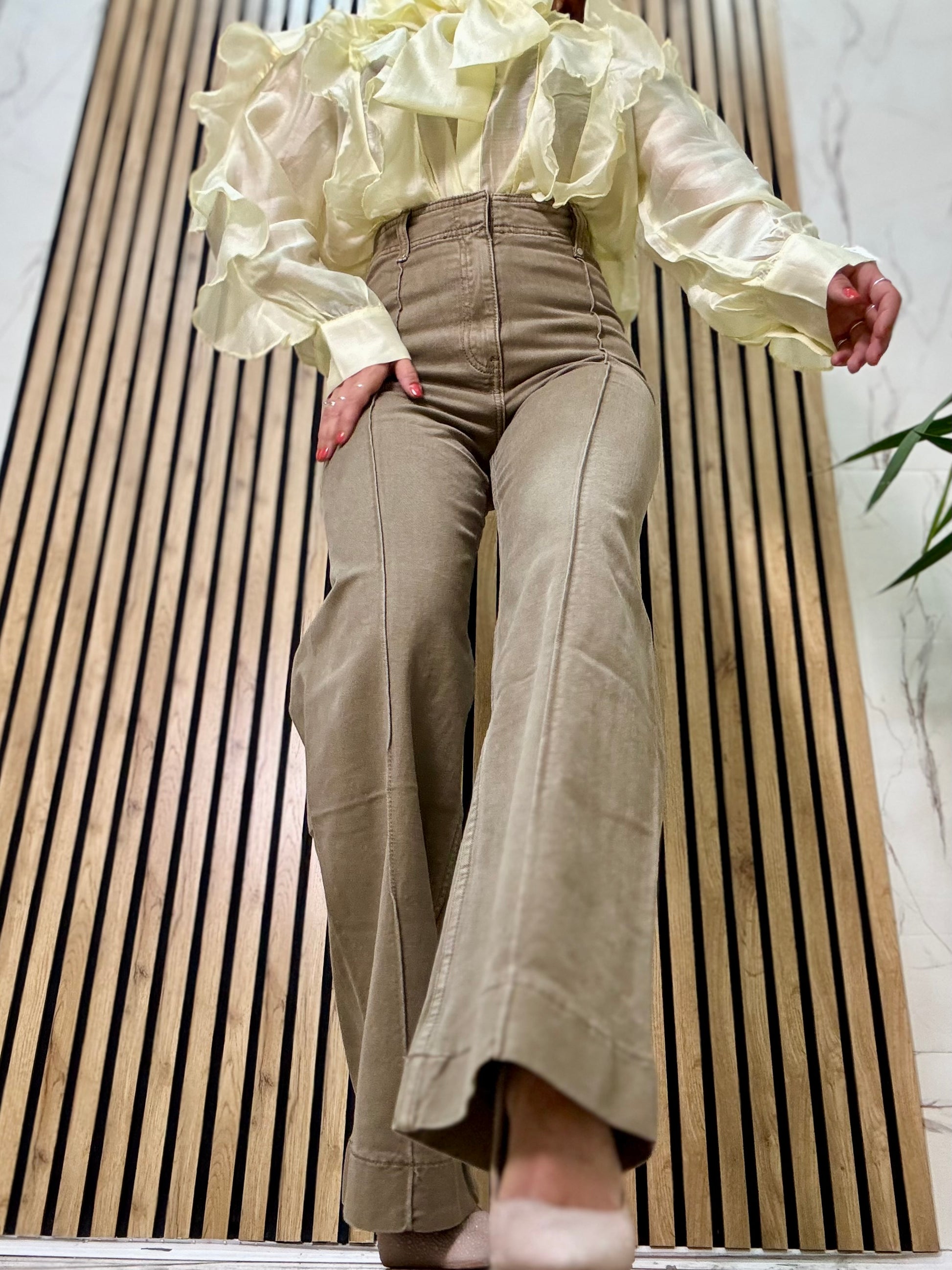 Pantalone a palazzo con dettagli cuciture frontali vita altissima vestibilità semi elastica