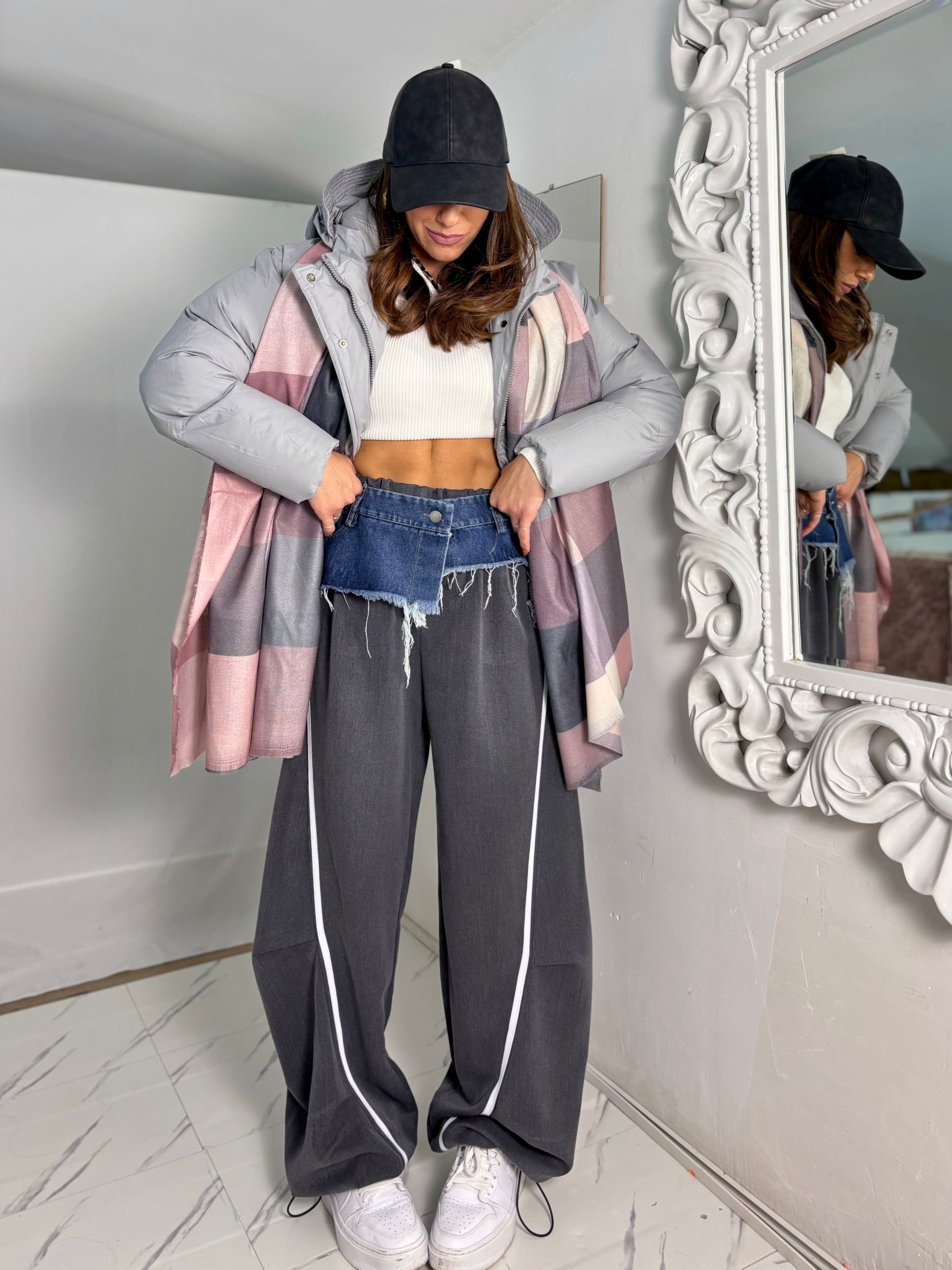 Pantatuta con dettaglio in denim sulla parte superiore vestibilità larga fino ad una 44 coulisse sul fondo
