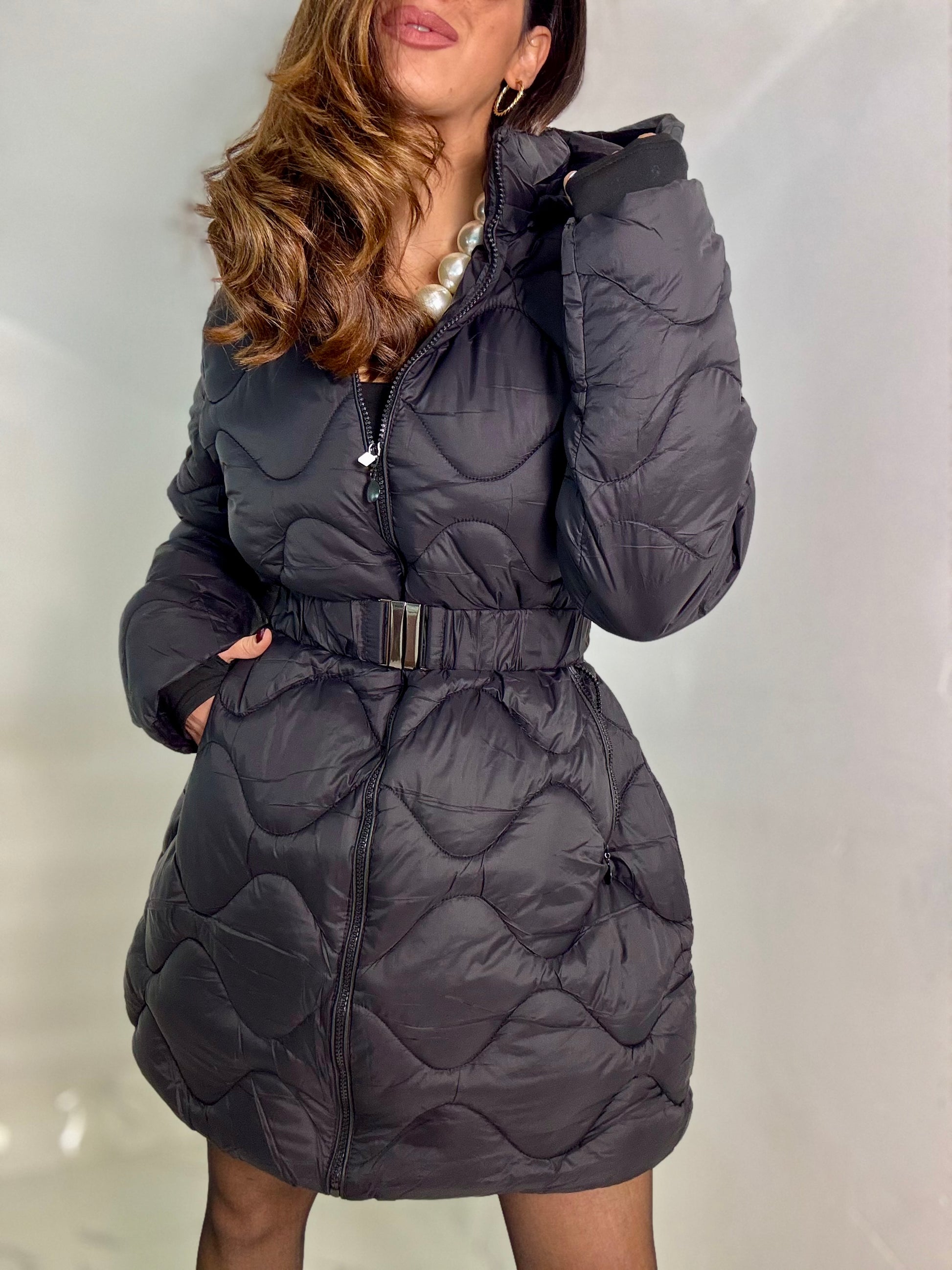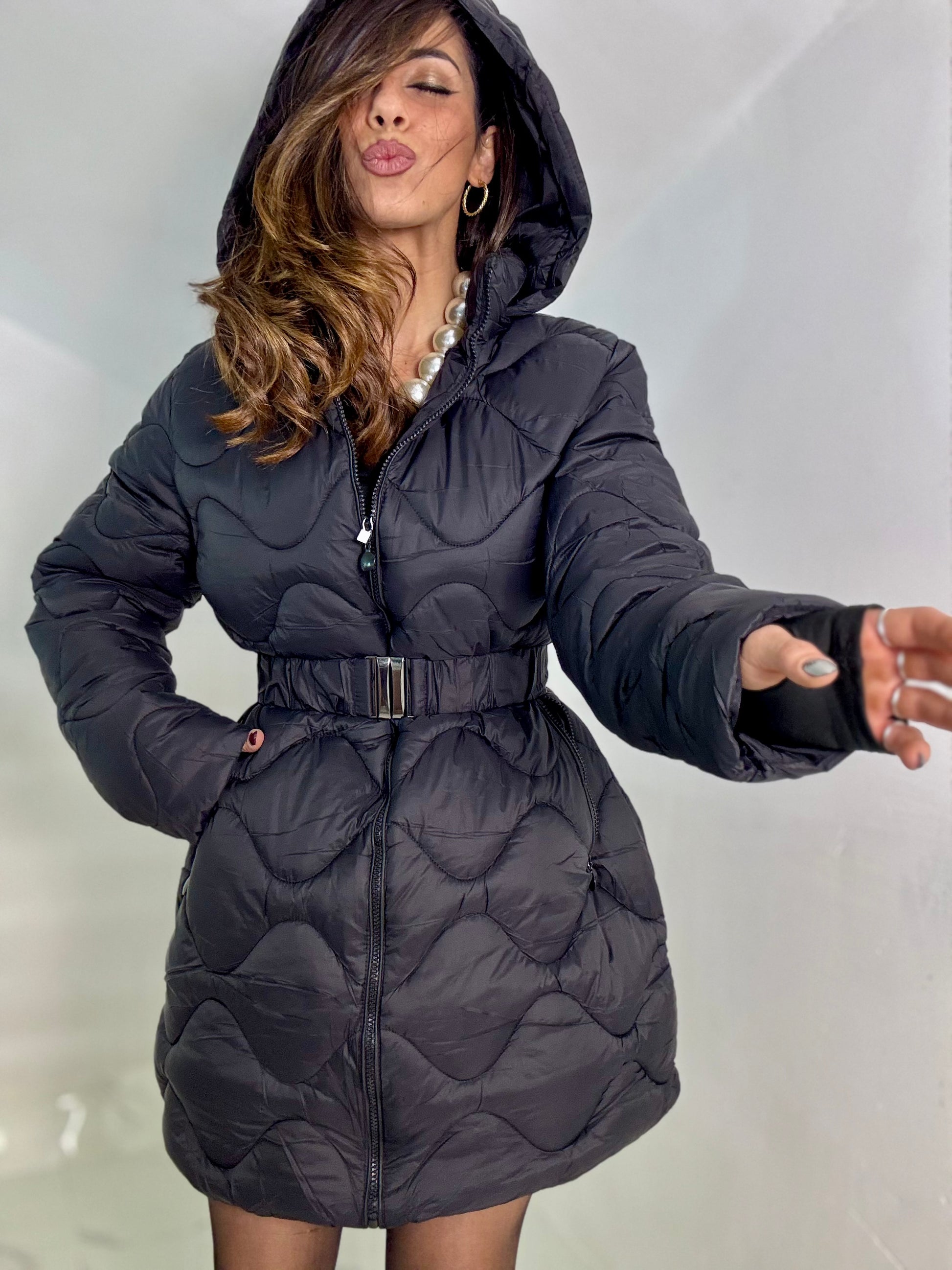 Piumino strutturato mezza lunghezza con cintura e cappuccio chiusura zip frontale