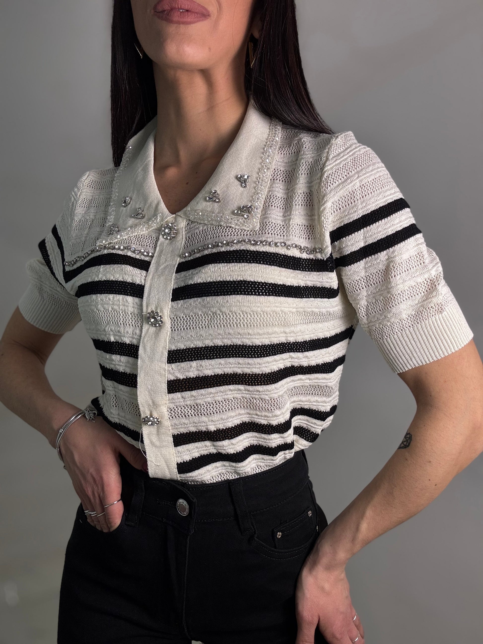 Polo in filo strutturata con applicazioni di strass tg U veste fino ad una 46 lunghezza regolare