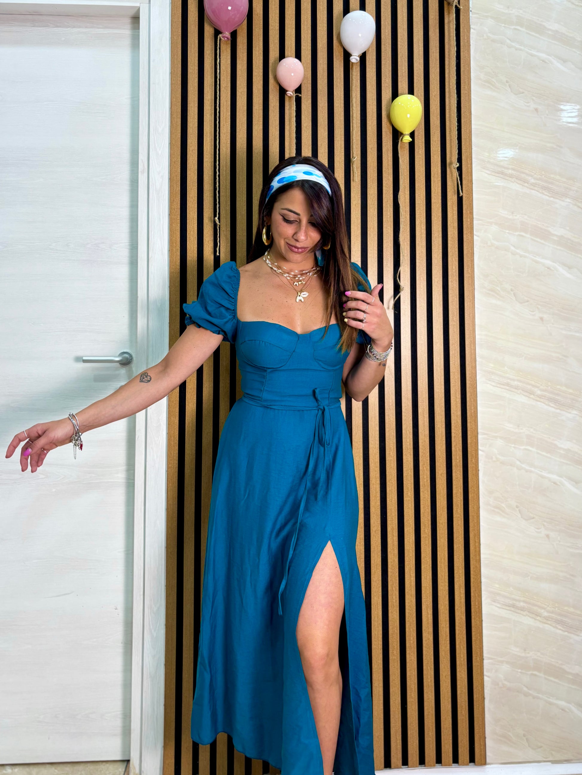 Abitino in misto lino con coppa cucita chiusura lacci sul retro scende svasato con spacchetto laterale tg U veste fino ad una 44-46