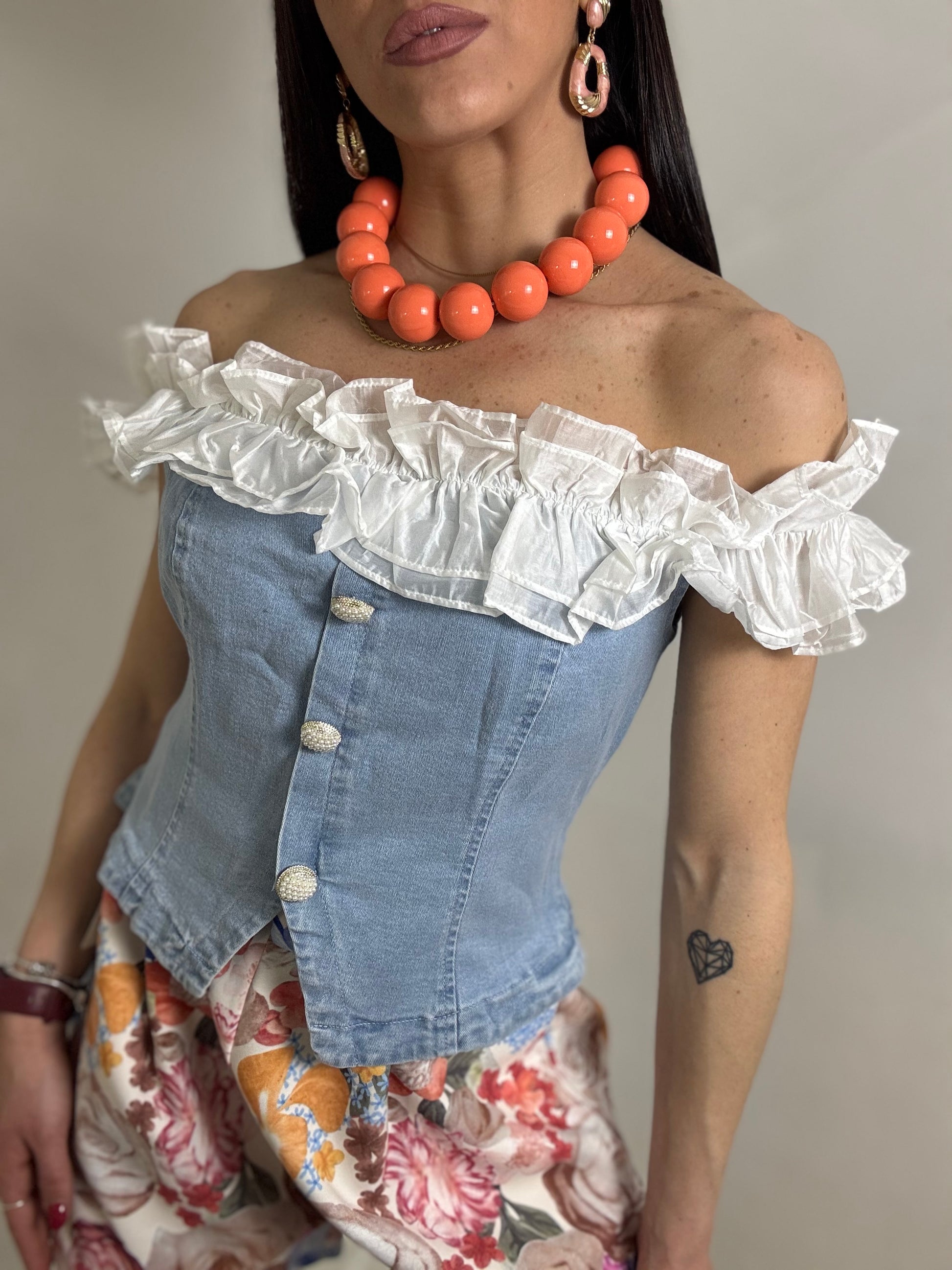Top scollo a barca in denim con dettagli bottone gioiello tg U veste fino ad una 44