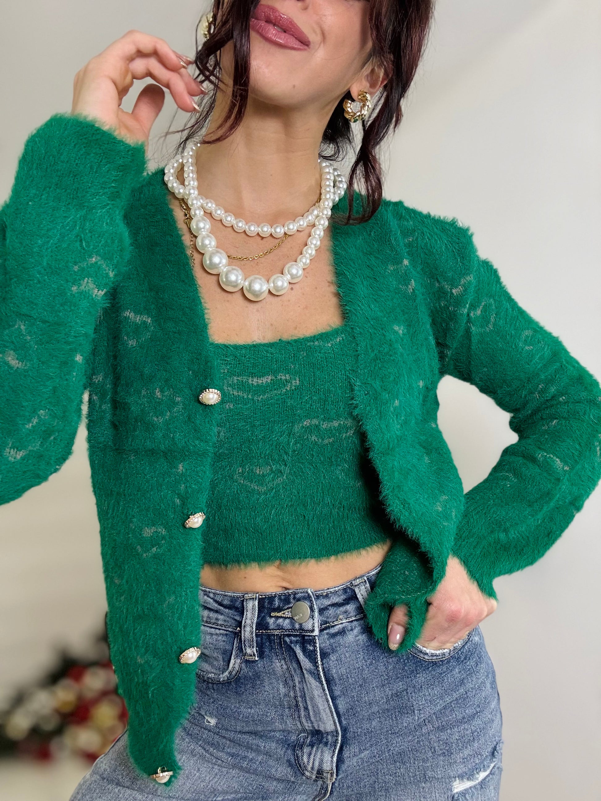 Set composto da Top e cardigan con bottoni in perle fantasia a cuori lana morbidissima, veste fino ad una 46