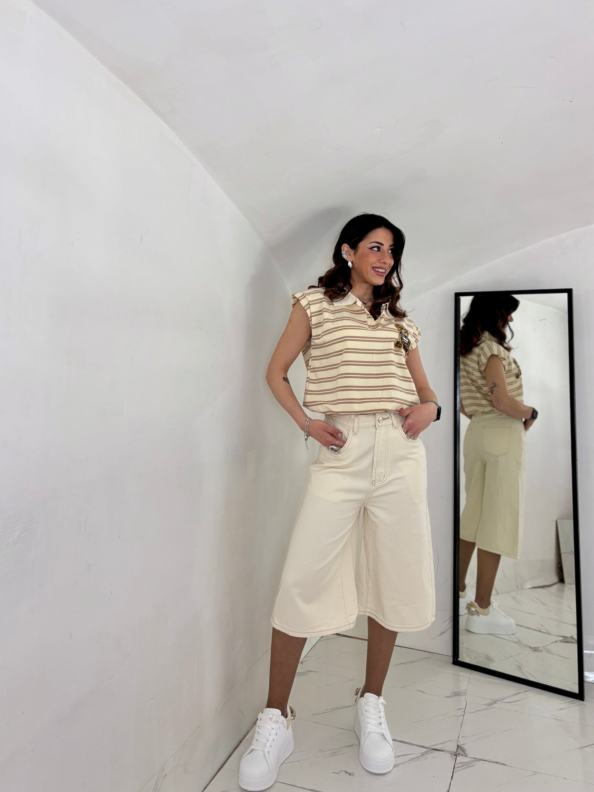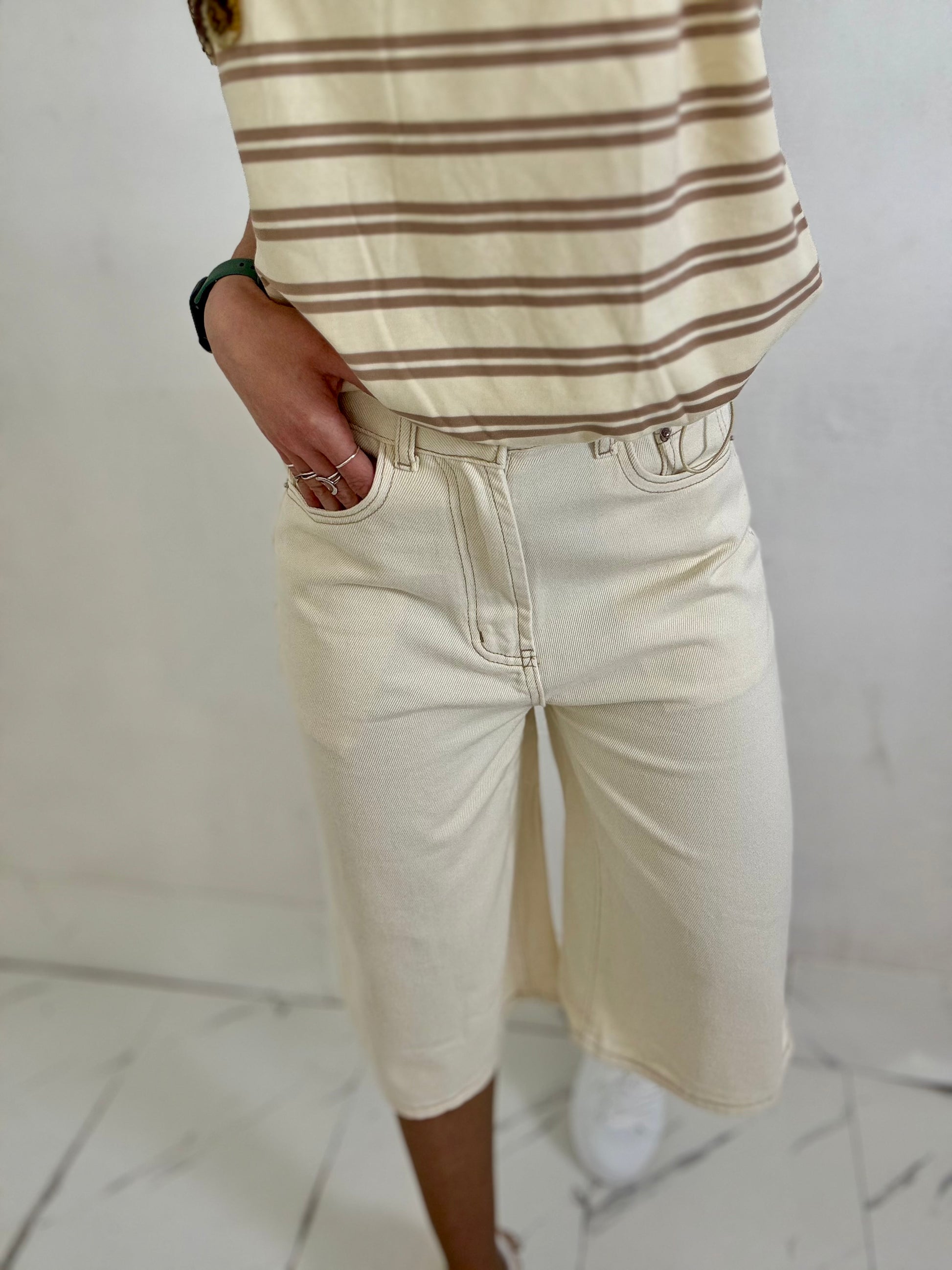 Bermuda dritto vita alta color panna con cuciture colore a contrasto