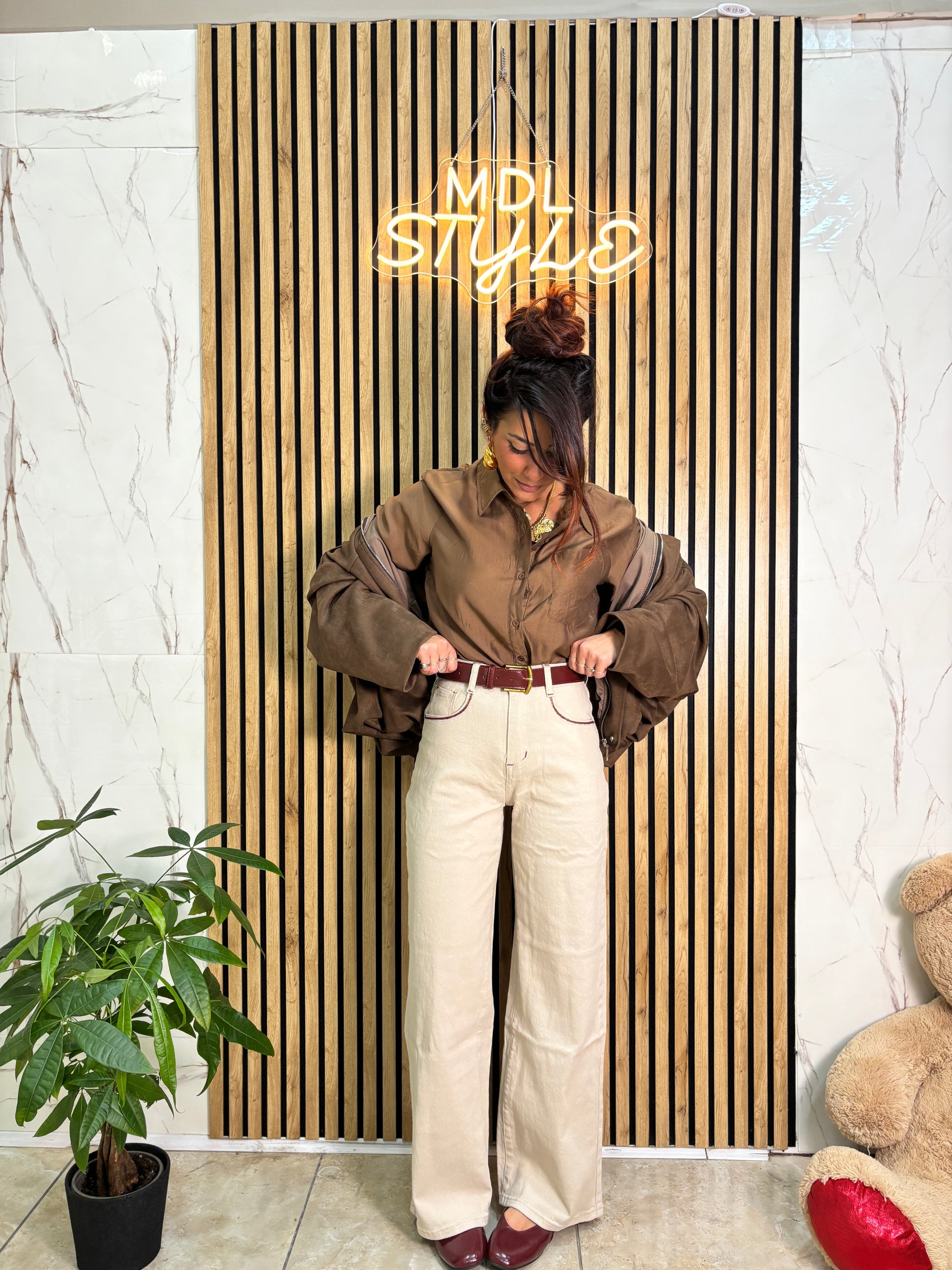 Jeans a palazzo color vetro con dettagli cucitura a bordeaux, vita alta con cintura compresa